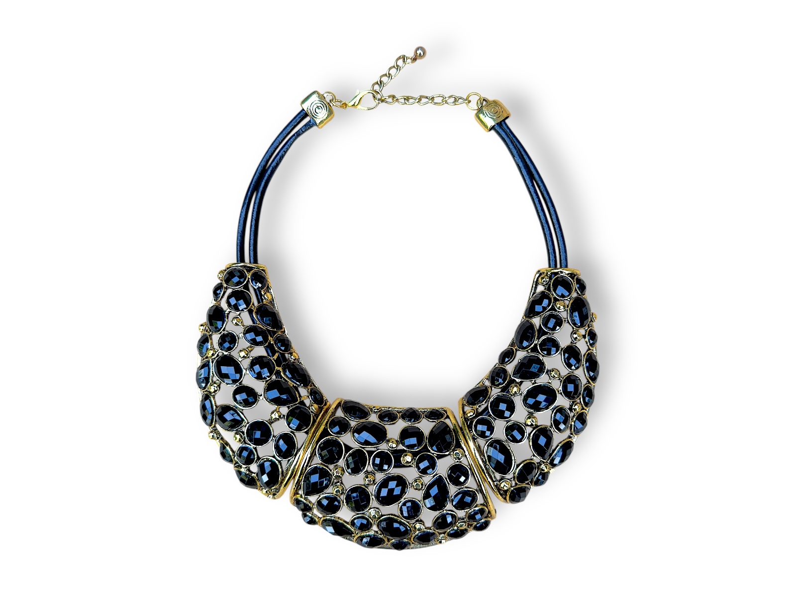 A black braided Leather two bands necklace with three large Golden Metal, (Nickel free), domed and curved filigree patterned panels, inlaid with black facetted Glass, round, oval, and teardrop shaped domed beads, each bead set in a Golden Metal frame. The domed central panel is 6 cm in width, 9 cm in length, and 2 cm in depth. The two curved domed tapered panels are, each, 10.5 cm in length, 5 cm in width, tapering down to 2 cm in width, and 1.5 cm in depth. The inner diameter of the three panels is 12 cm, and the drop length of the necklace is adjustable from 22 cm to 26 cm. The necklace is attached by a Golden Metal oyster clasp, and an 8 cm chain, (for adjustable sizing).