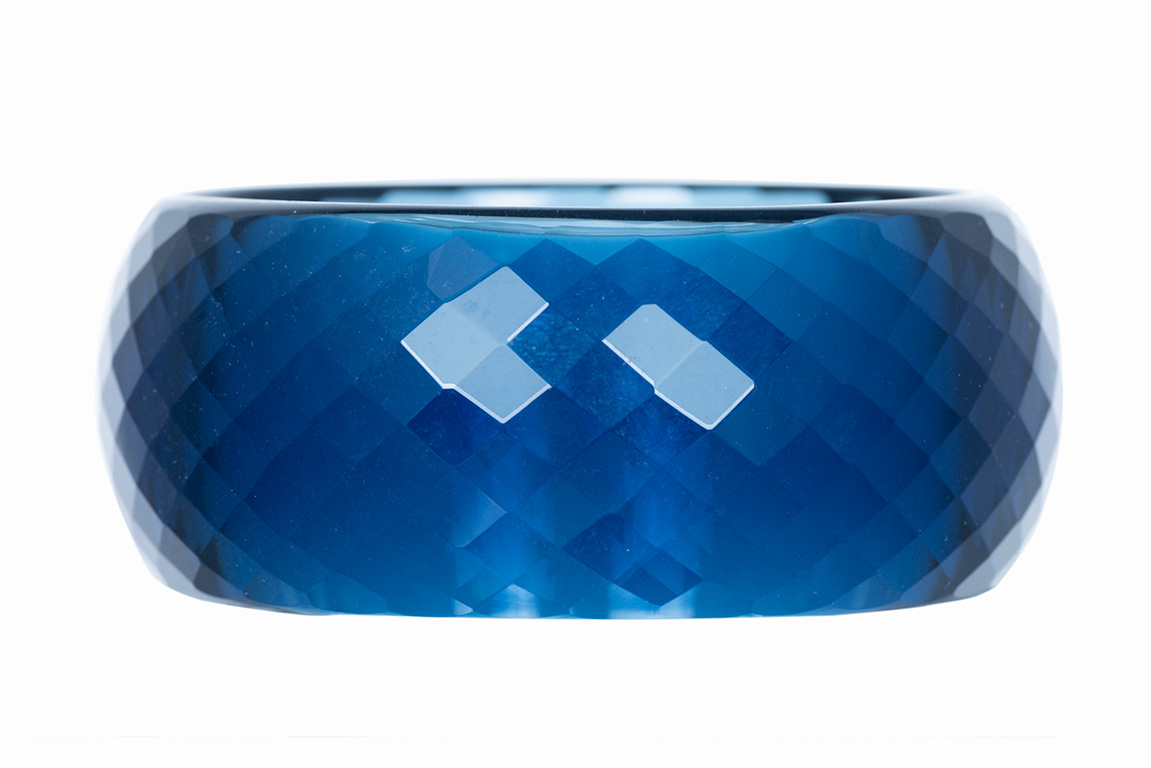 A blue facetted Glass bangle with a curved rim. The inner diameter of the bangle is 2.4 inches. The bangle is 1.2 inches in width.
