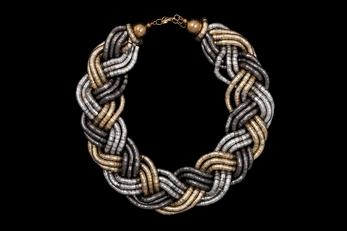 A wide braided necklace with three groups of Golden Metal, three of Silvered Metal, and three of Gunmetal, (all three metals are Nickel free), flexible bands. At each end of the necklace is a Golden Metal flexible band ring and a large Golden Metal round bead. The necklace is 1.5 inches in width and 0.4 inches in depth. The necklace is 19 inches in length and is adjustable in length. The necklace is finished with a Golden Metal oyster clasp, and a 3 inch Golden Metal chain, (for adjustable sizing).
