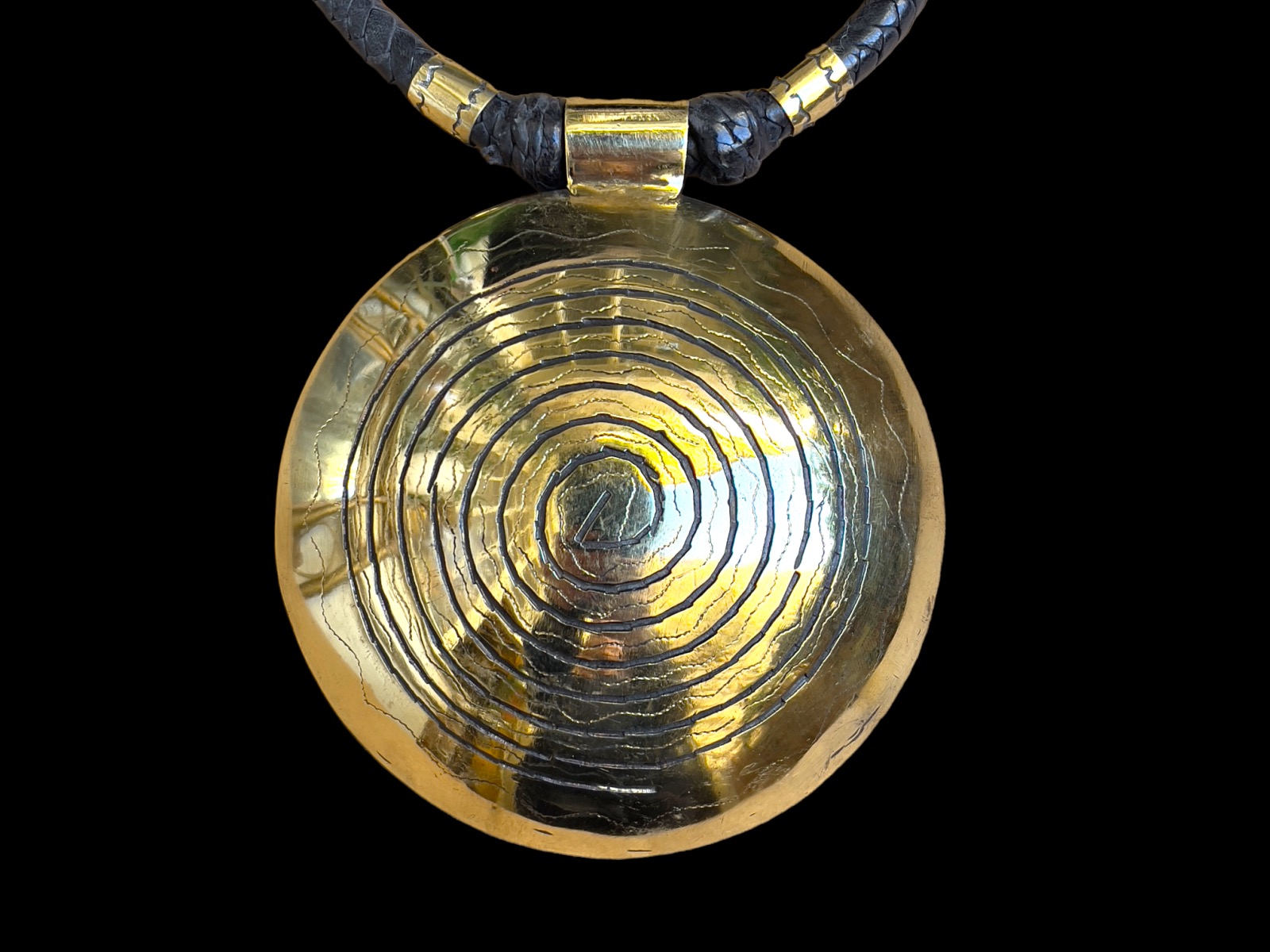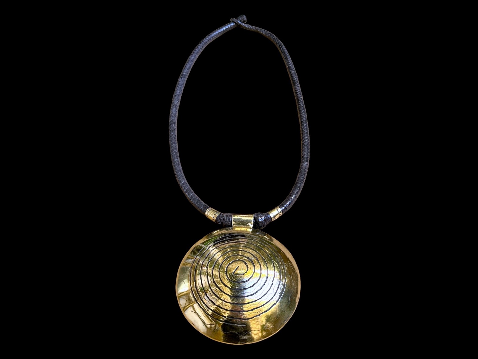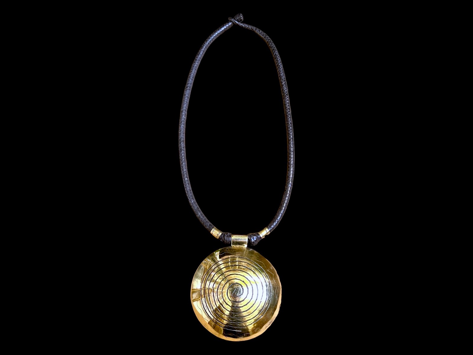 A Brass domed circular large pendant, decorated with a grooved spiral band, and suspended by a Brass tube from a long black braided Leather band necklace. Mali, West Africa. The Leather band is decorated, at the base,  with two patterned Brass tubes.