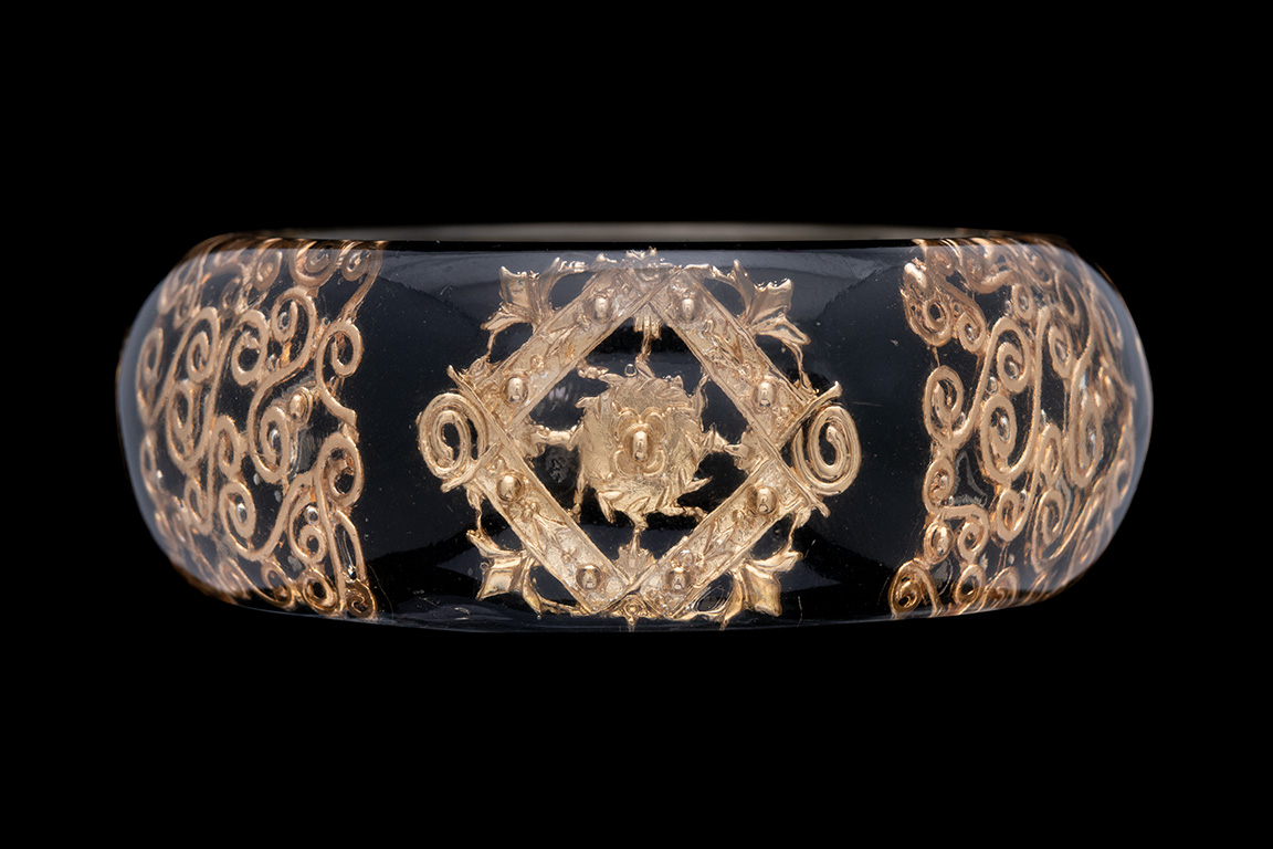 A Clear Resin Bangle Over A Black Resin Base Inlaid With Six Golden Metal Filigree Patterned Panels