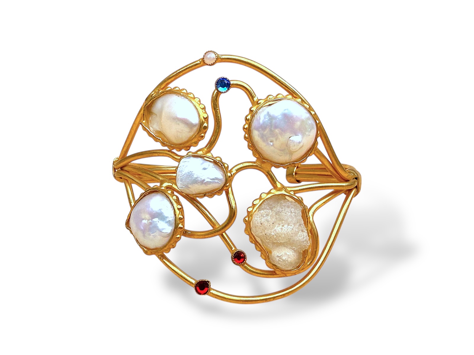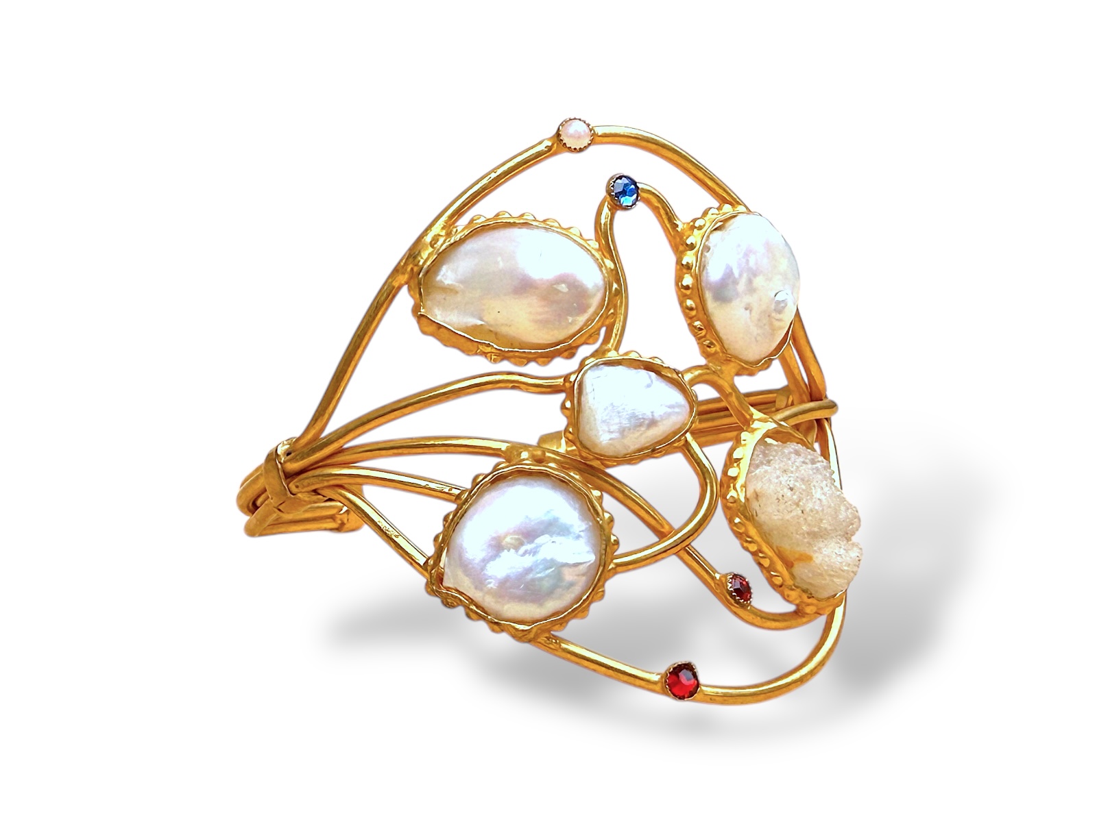 A five band open cuff  of Gold Plated wavy bands, inlaid with four white baroque Freshwater Pearls, one Rock Crystal multi facetted freeform, two small red facetted Glass beads, one small blue facetted Glass bead, and one small white Glass bead, all set in Gold Plated frames.