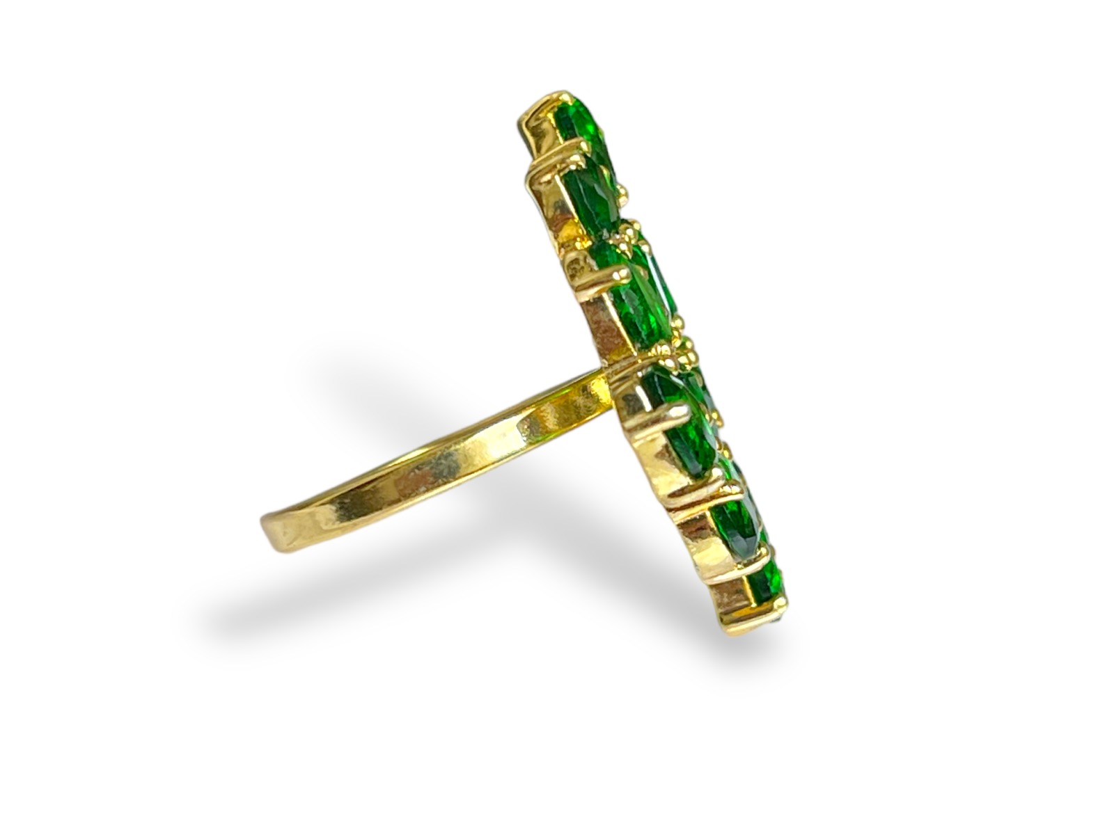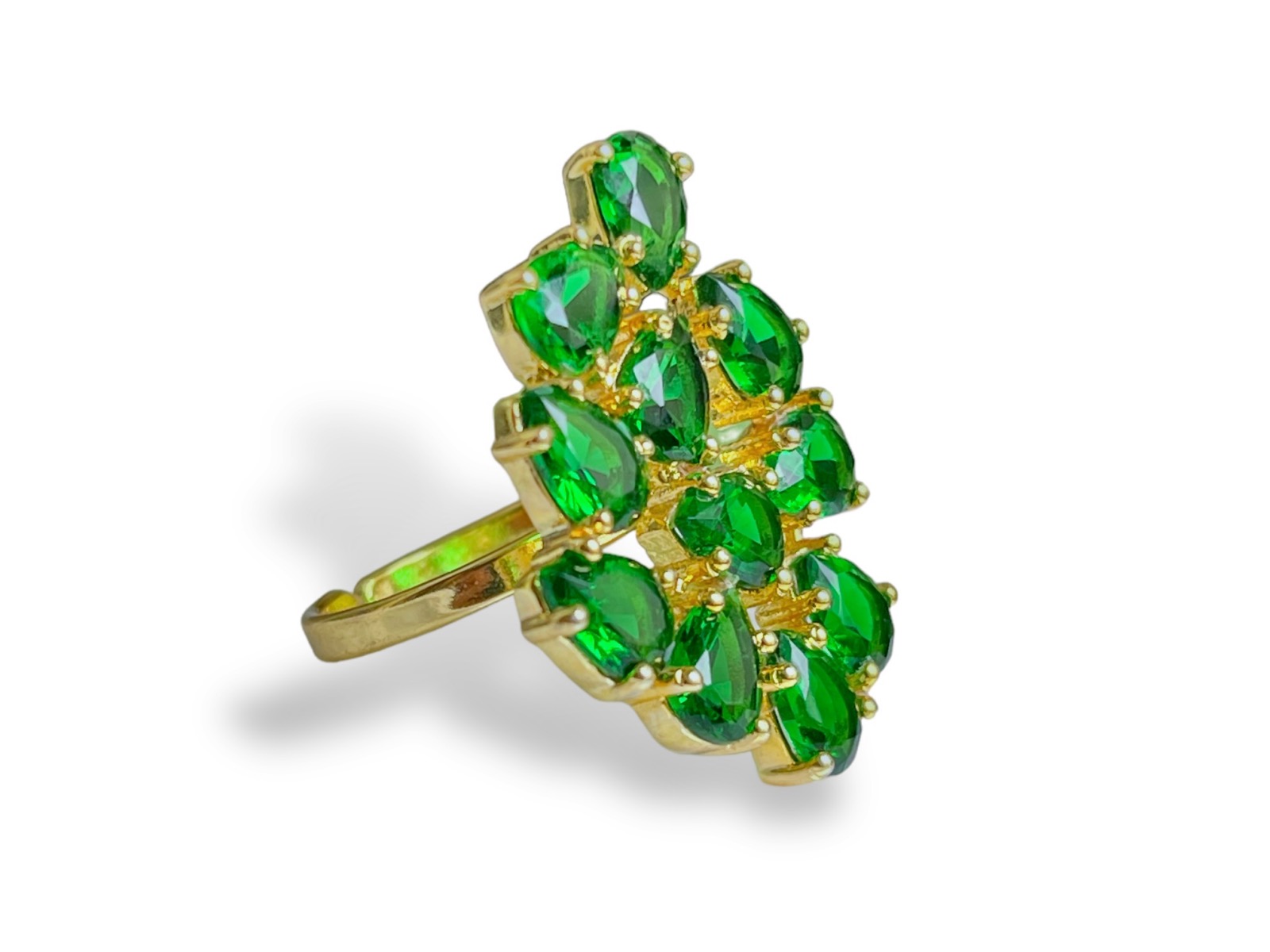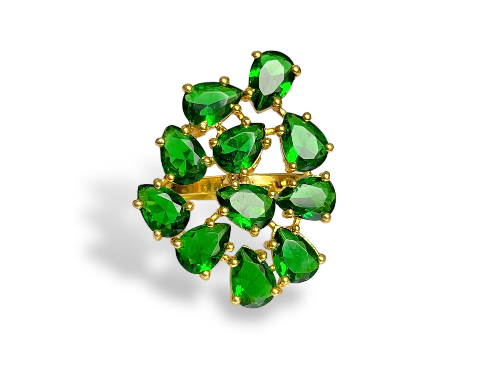 A Gold Plated adjustable band ring, decorated with eleven small dark green facetted Glass teardrops. The top of the ring is 2 cm in width, 2.7 cm in length, and 0.4 cm in height. The inner diameter of the open ring band is 1.7 cm, and is adjustable in size.