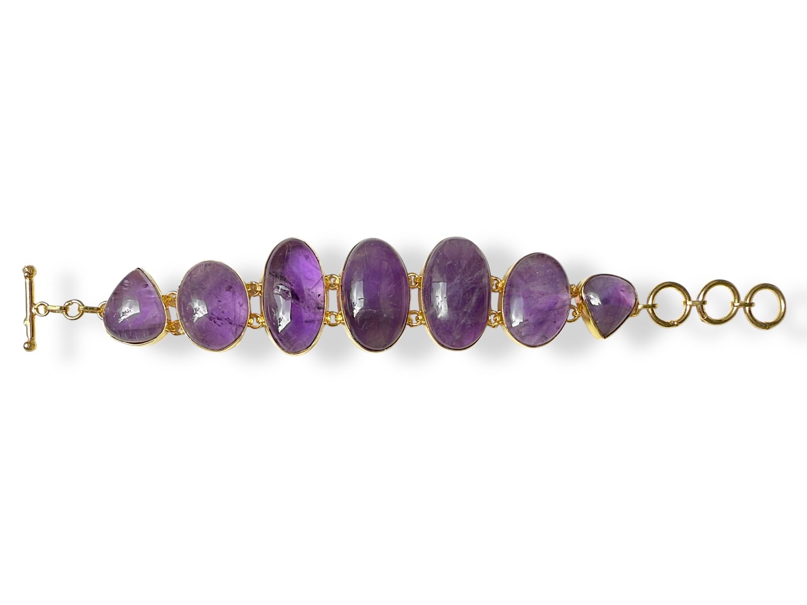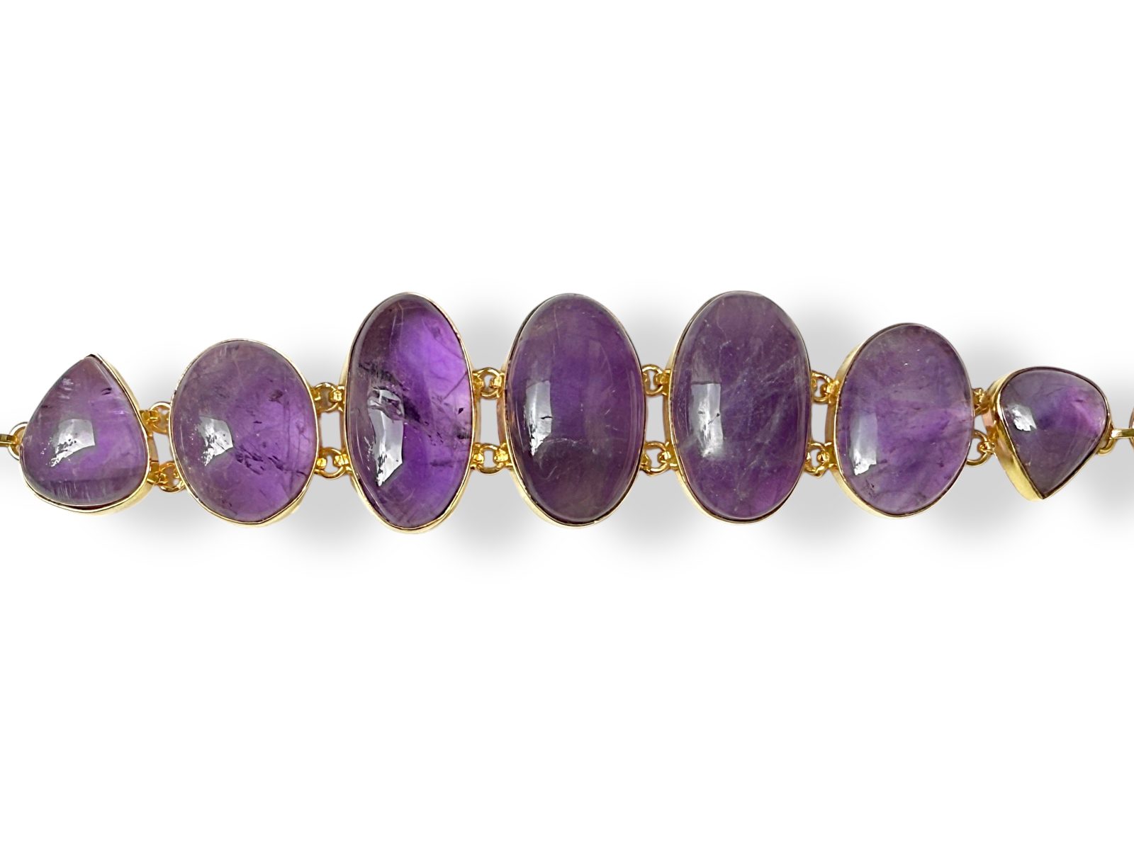 A Gold Plated Bracelet of seven linked panels of  five domed oval and two domed teardrop shaped Amethyst cabochons, each set in a Gold Plated frame. The largest Amethyst cabochon is 1.5 cm in width, 3 cm in length, and 0.6 cm in depth.  The length of the bracelet is adjustable from 15.5 cm to 18 cm, and the bracelet is attached by a Gold Plated bar, at one end, and three Gold Pated linked rings at the other end, (for adjustable sizing).