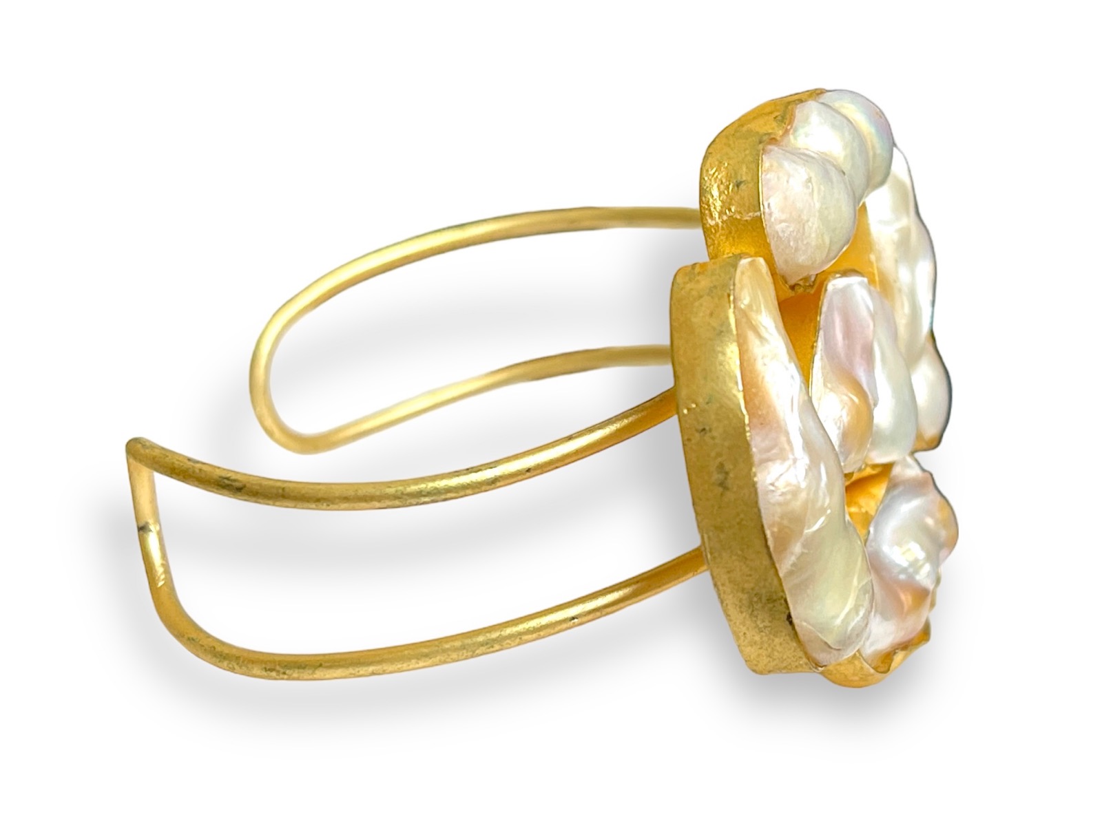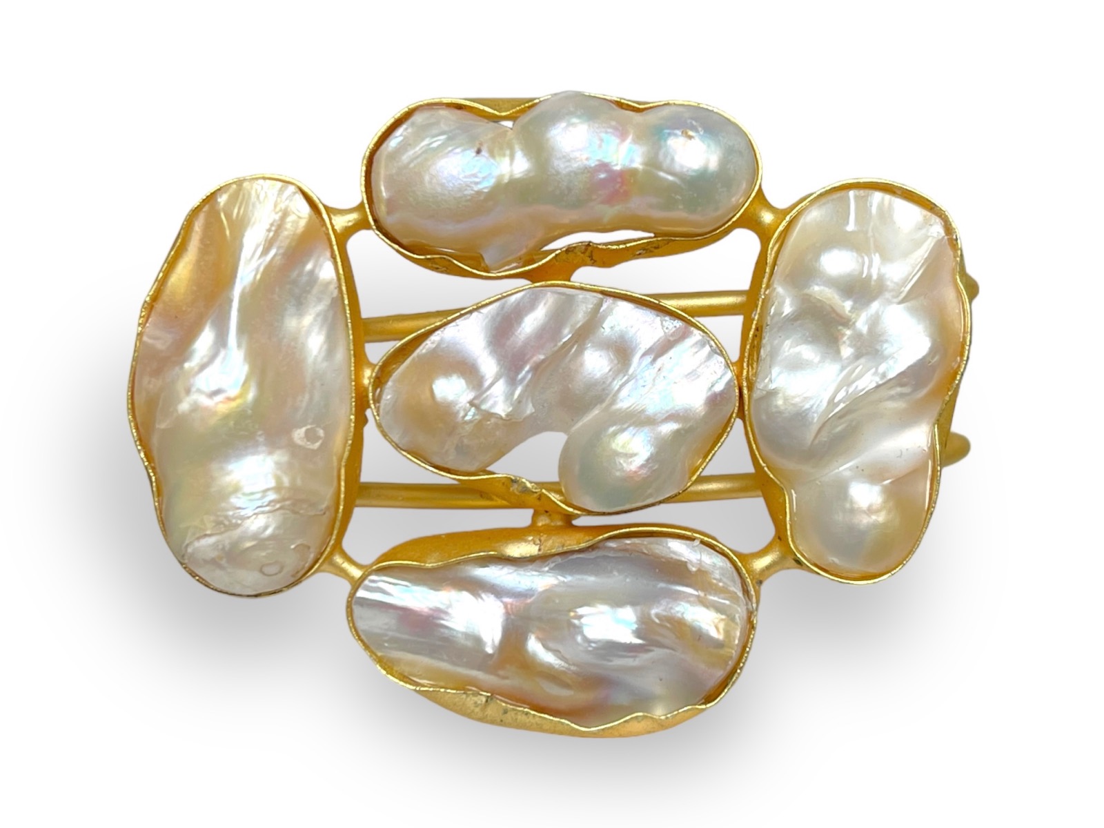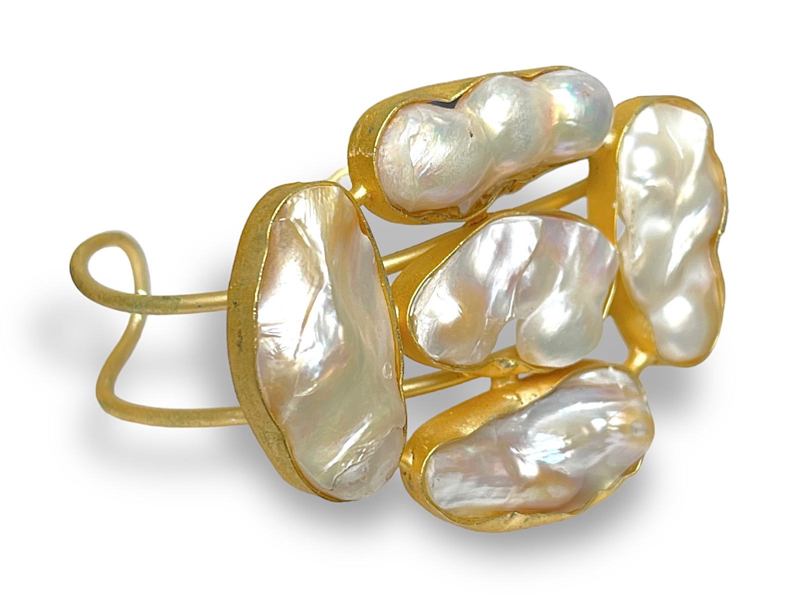 A Gold Plated curved double band open cuff decorated with five long baroque white Freshwater Pearls, each enclosed in a Gold Plated case. Each Pearl is, approximately, 2.5 cm in length, 1.5 cm in with, and 0.6 cm in height. The inner diameter of the curved double band is 6 cm and is adjustable in size.