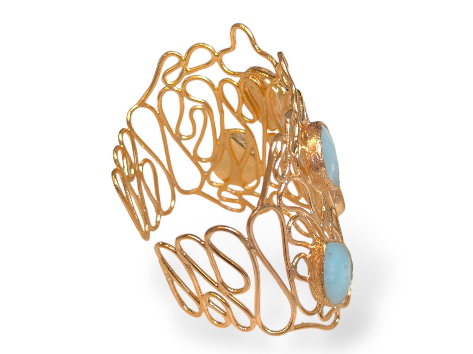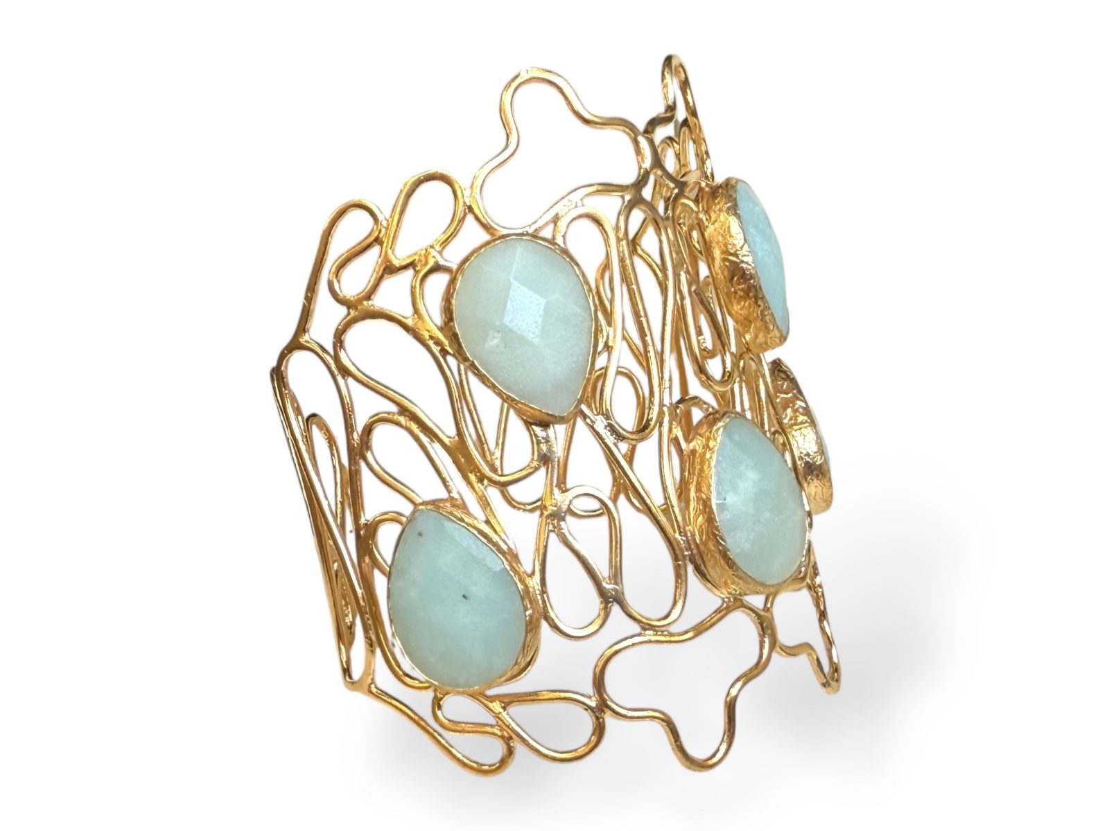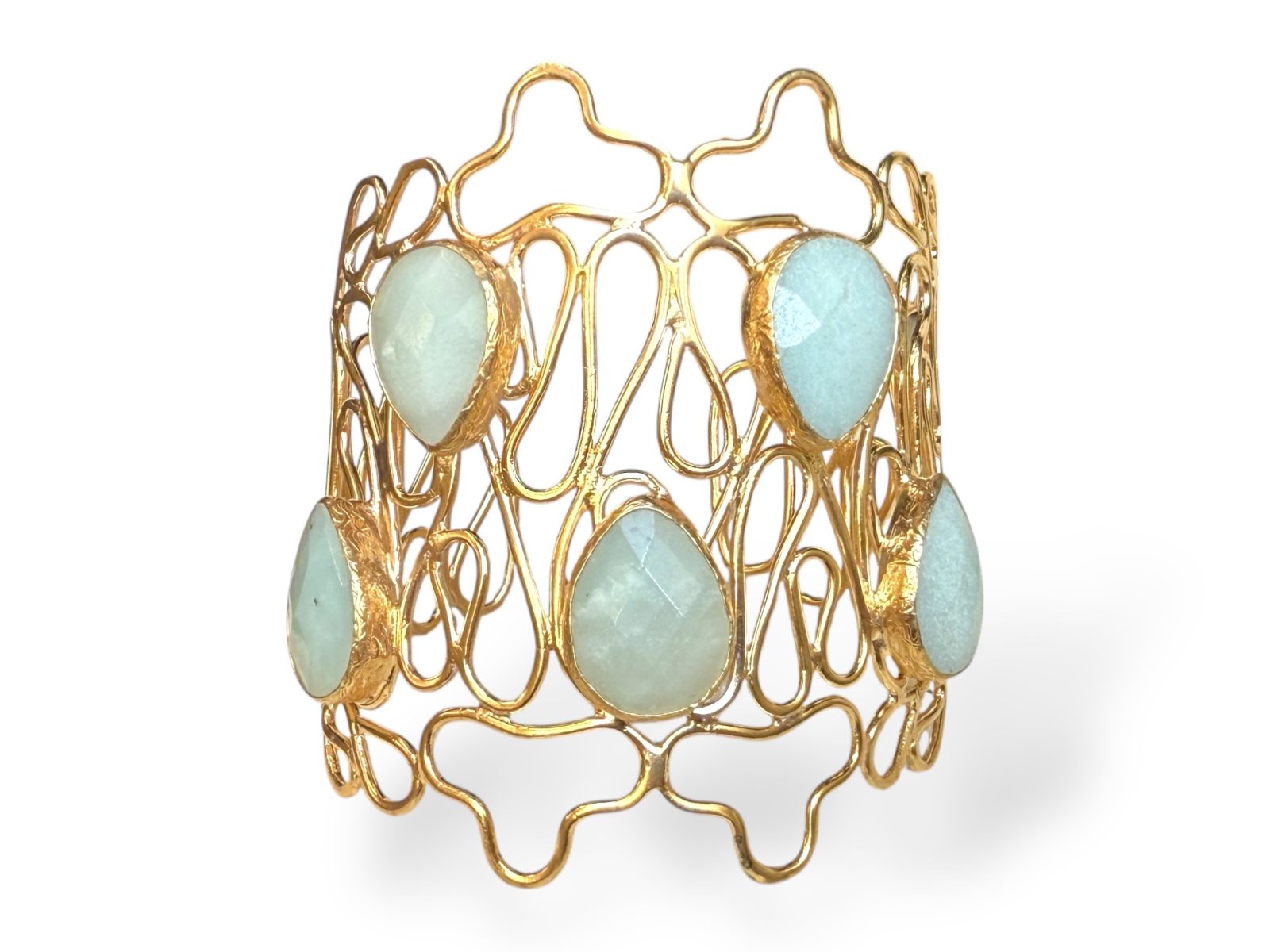 A Gold Plated, tapered band,  open cuff of curved bands, inlaid with five light blue domed facetted Glass teardrops, each set in a Gold Plated frame. Each framed teardrop is 1.2 cm in width,  0.4 cm in height, and 2.5 cm in drop length.The cuff is 7 cm in width at the centre, tapering down to 2.5 cm in width, at each end of the cuff. The inner diameter of the cuff is 6 cm, and is adjustable in size.