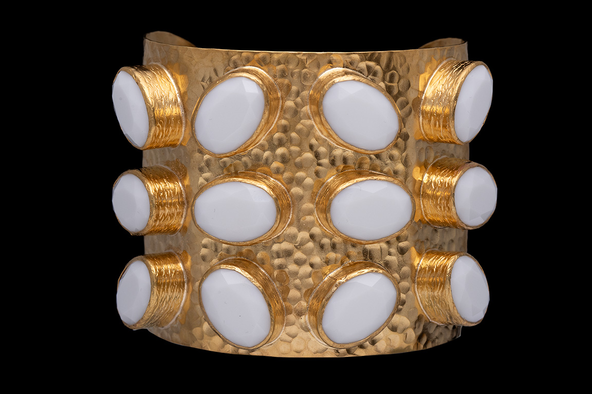 A Gold Plated, hammered surface, open cuff, decorated with twelve White Agate facetted oval cabochons, each set in a raised GoldPlated patterned frame. Each framed Agate oval is 0.4 inches in width, 0.6 inches in length, and 0.2 inches in height. The inner diameter of the cuff is 2.4 inches, (adjustable), and the cuff is 2.3 inches in width.