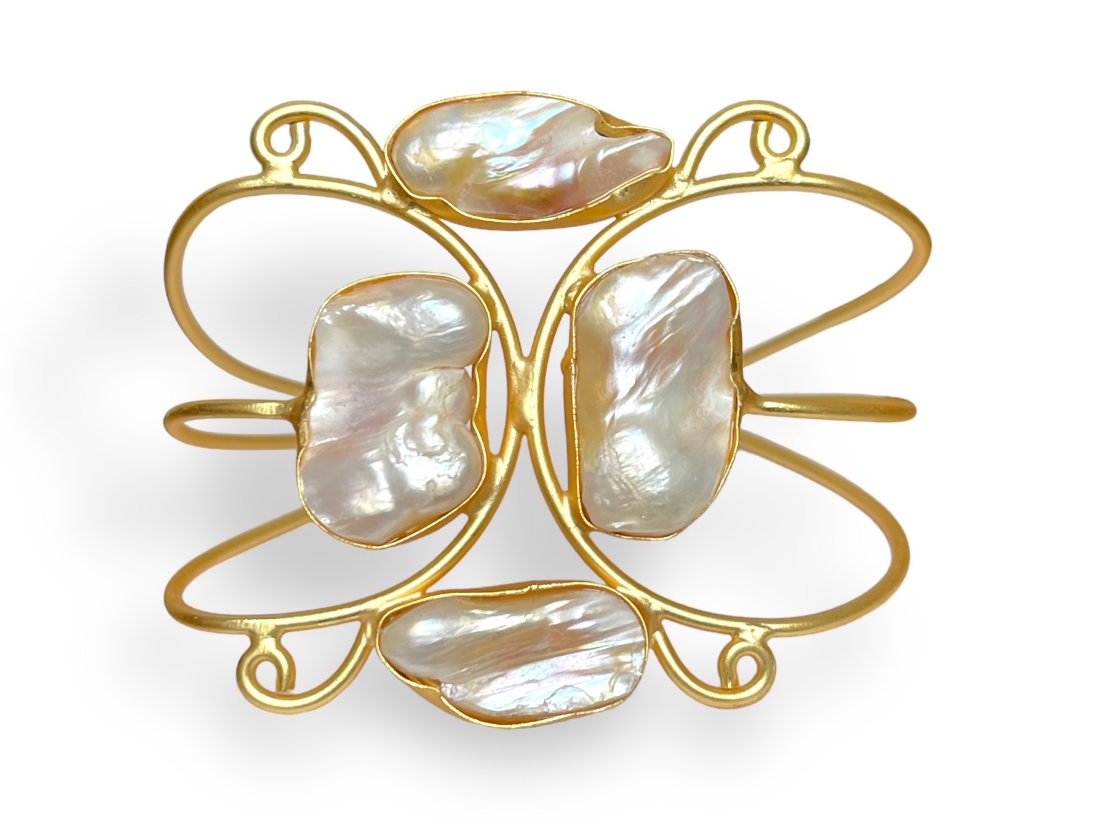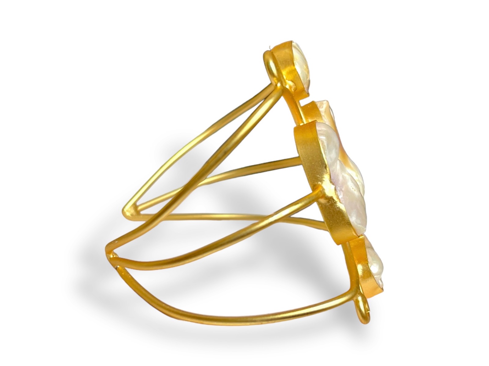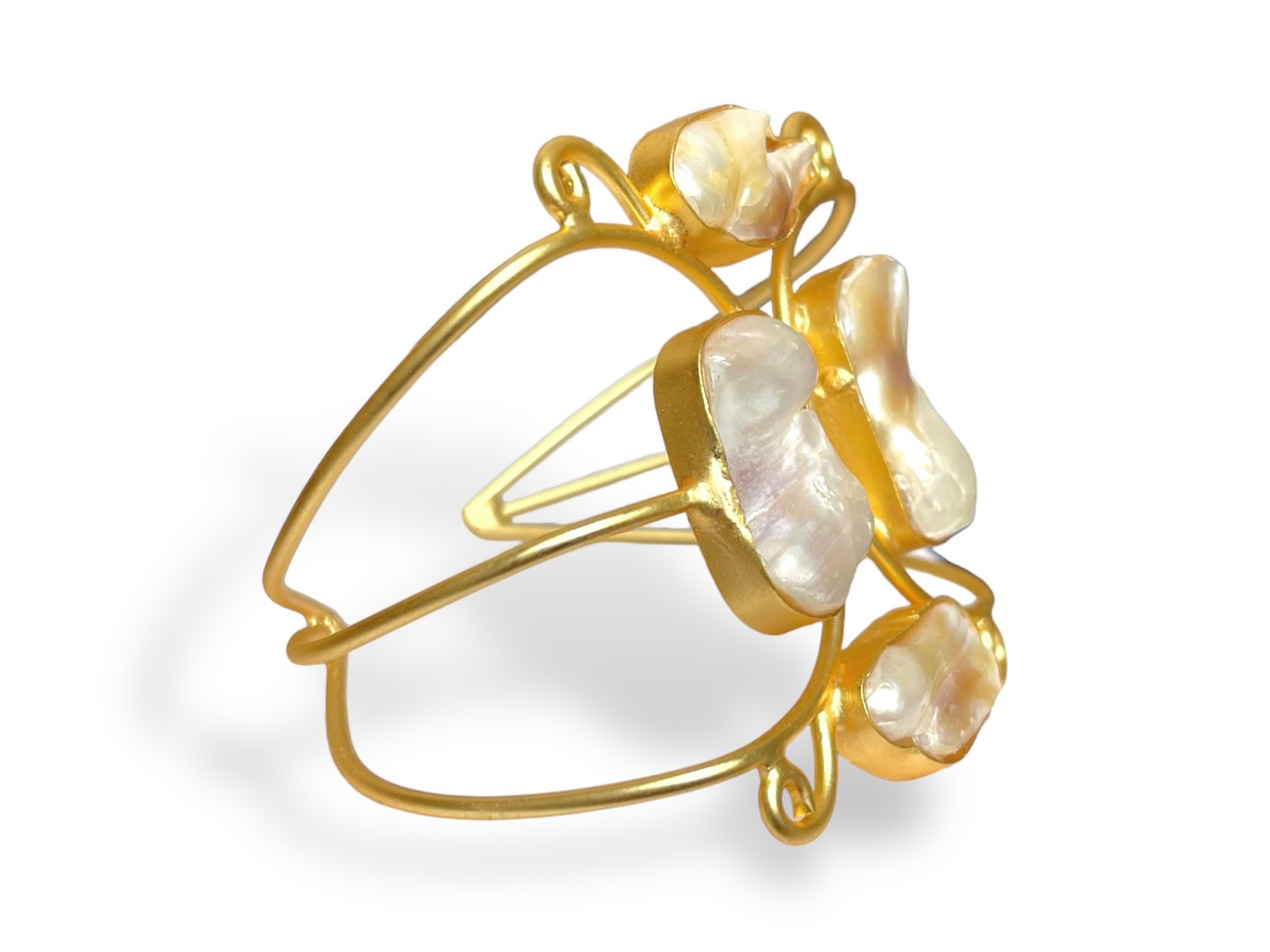 Be the first to review “A Gold Plated Three Band Open Cuff, Decorated With Four White Baroque Freshwater Pearls.”