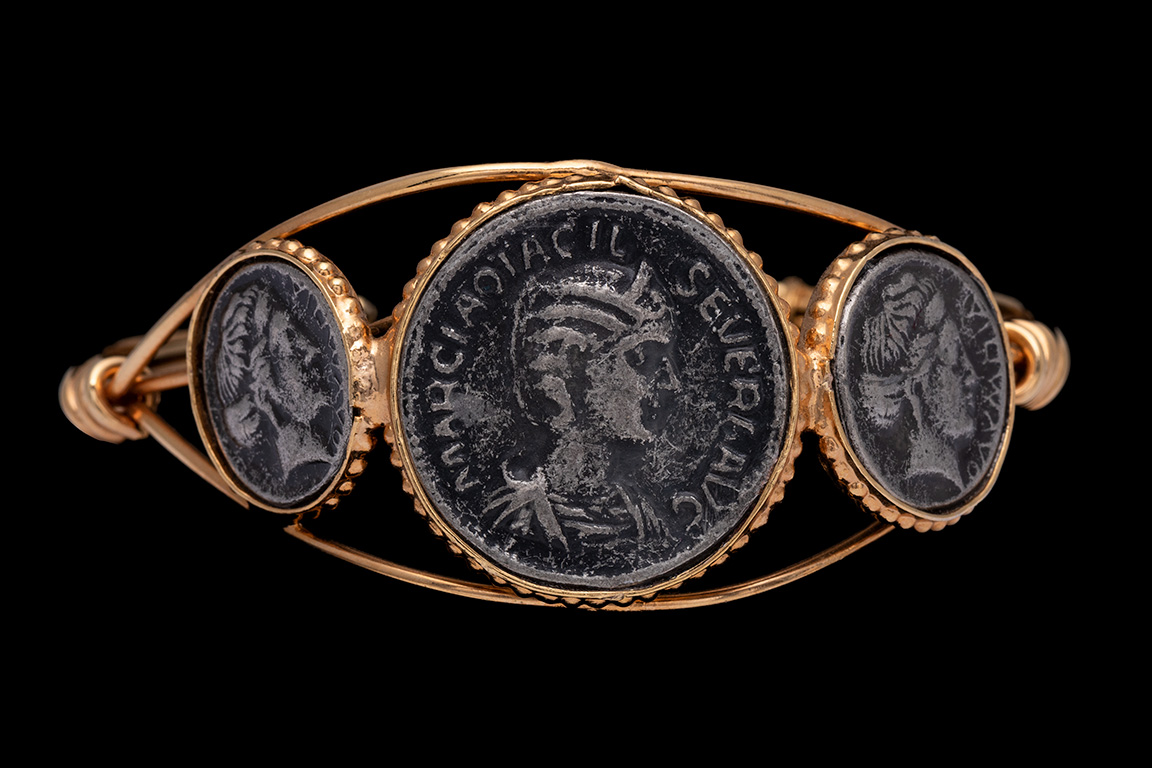 A Gold Plated three banded oval shaped open cuff. The cuff is decorated with three dark oxidised Silvered Metal copies of ancient Roman coins, each set in Gold Plated patterned frames. The large central coin is 1.2 inches in diameter, and the two smaller coins, on each side, are both 0.7 inches in diameter. The inner diameter of the cuff is 2.7 inches, and is adjustable. The cuff is 1.2 inches in maximum width.