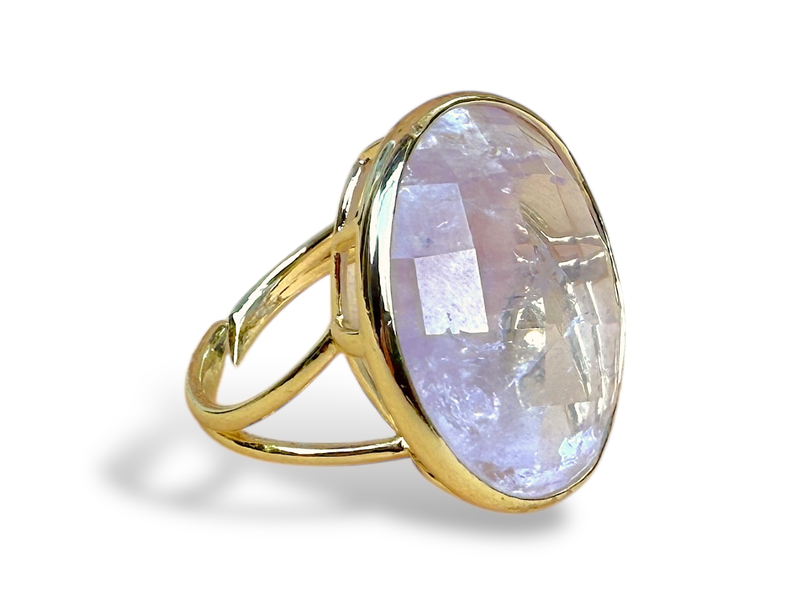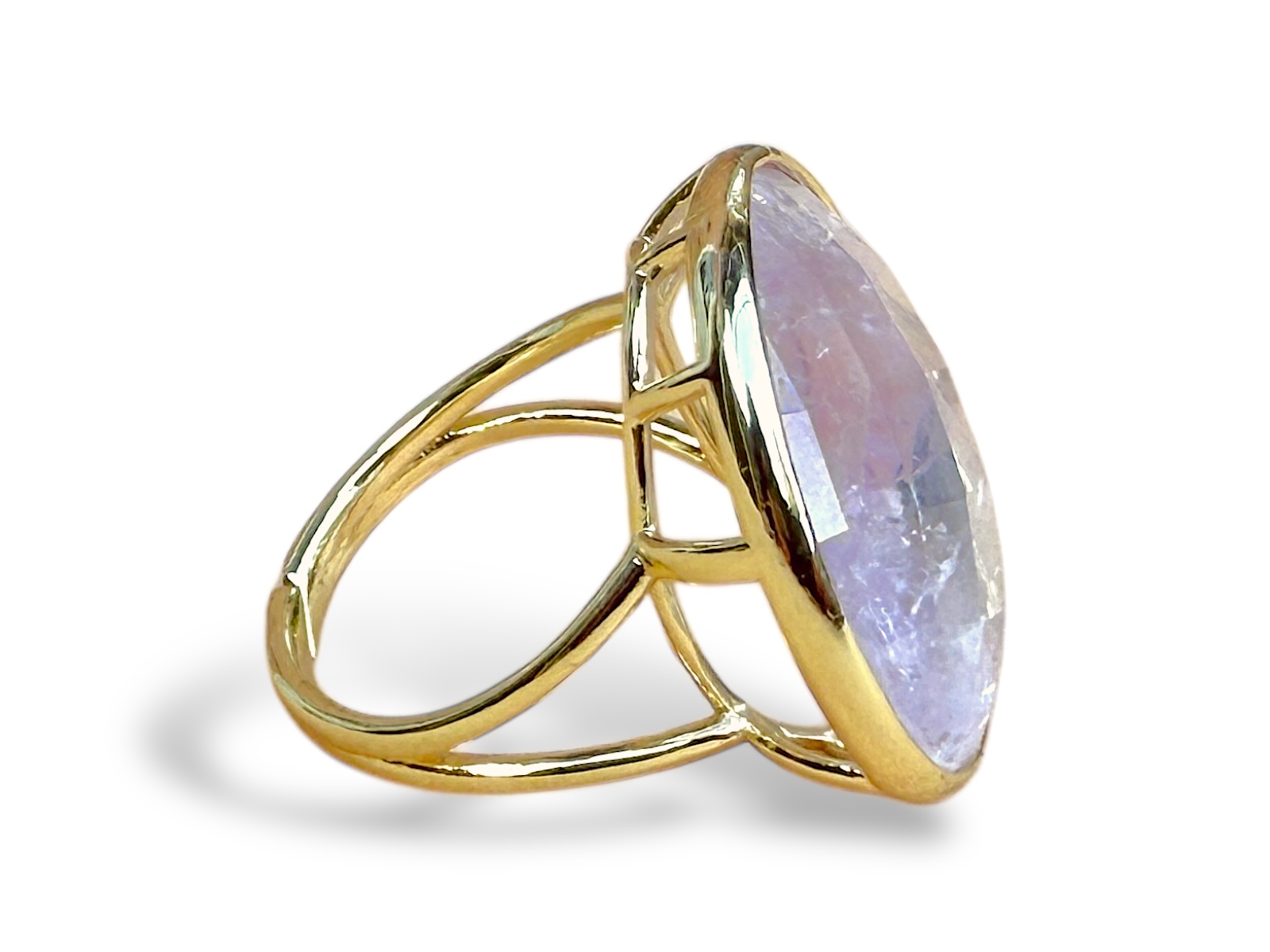 A Gold Plated two adjustable bands ring, with a circular top, inlaid with a Pale Amethyst domed facetted circular panel, set in a Gold Plated band border. The top of the ring is 2.5 cm in diameter and 0.4 cm in height. The inner diameter of the ring band is 2 cm, and is adjustable in size.