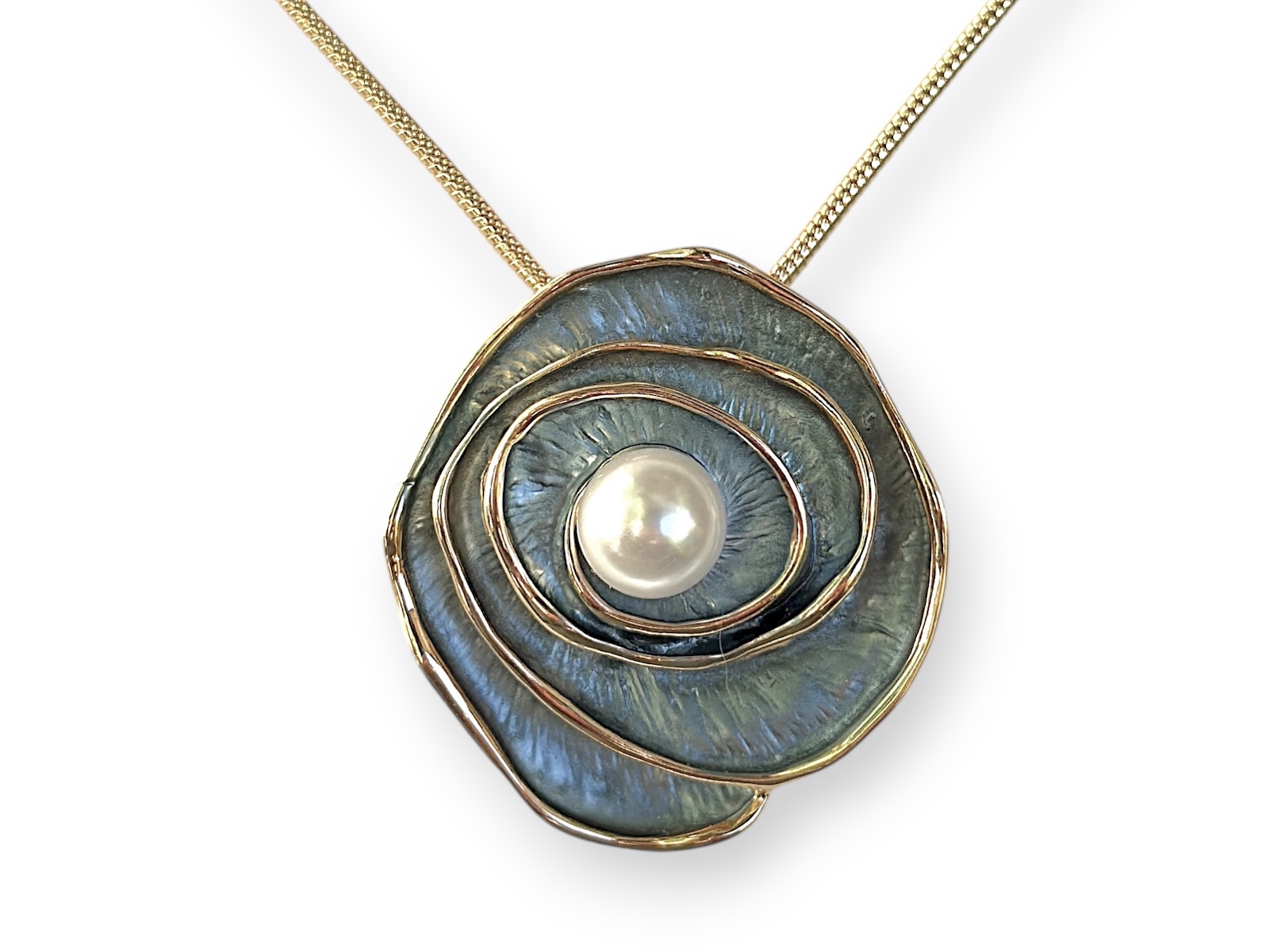 A Golden Metal, (Nickel free), flower pendant, of an irregular shaped coiled band, with blue enamelling and Golden Metal borders. At the centre of the pendant is a round white Glass faux pearl. The pendant is suspended from a Golden Metal, (Nickel free), braided chain necklace. The pendant is 3.6 cm in width, 4 cm in length, and, in the centre of the pendant, 1 cm in height. The length of the chain is adjustable from 43 cm to 49 cm, and the necklace is attached by a Golden Metal oyster clasp, and a 6 cm chain, (for adjustable sizing).