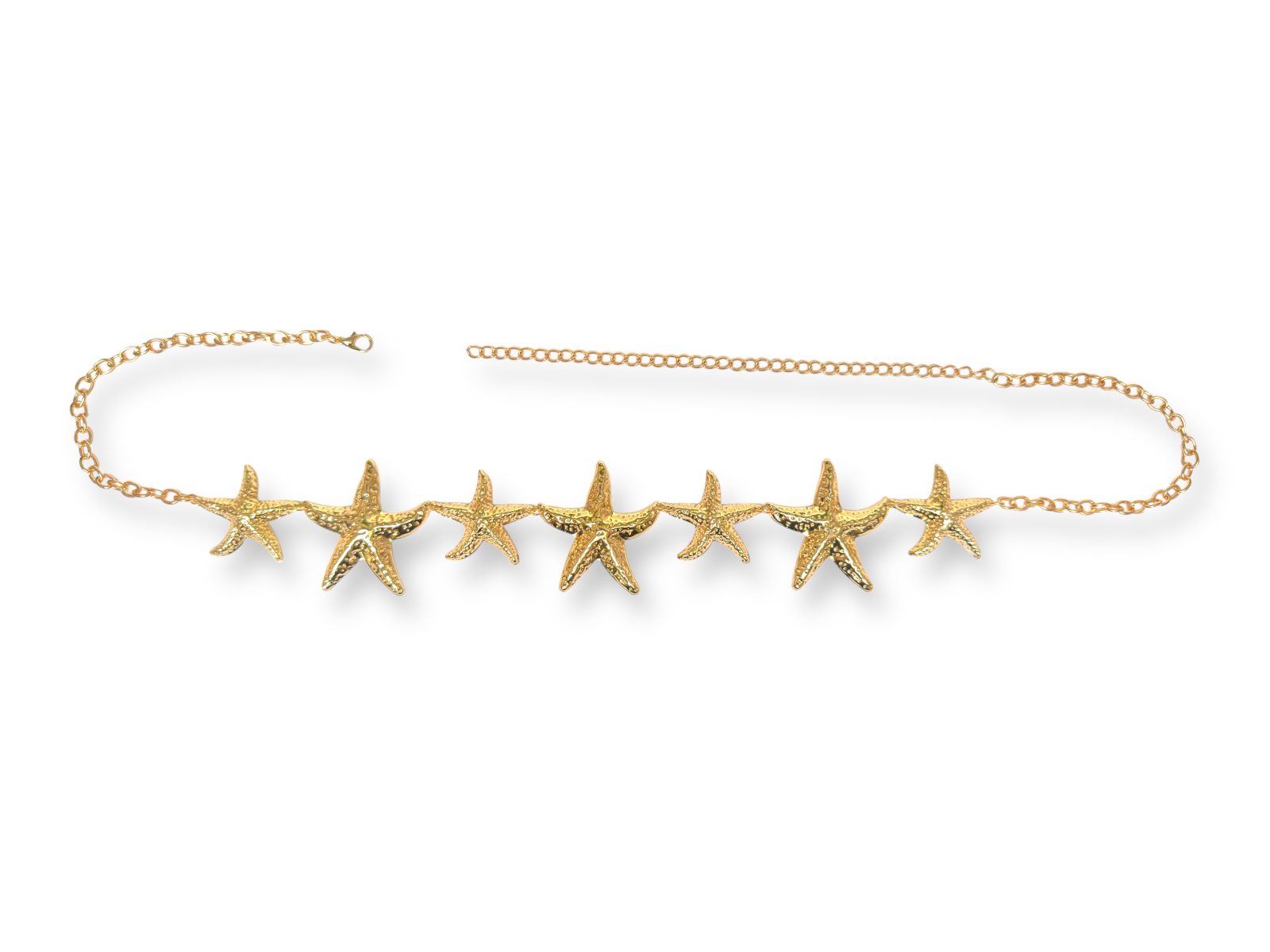 A Golden Metal, (Nickel free), chain belt, decorated with three large, and four smaller, linked patterned, five pointed star shaped hollow panels. The large star shaped panels are 5 cm in diameter, and the smaller star shaped panels are 4 cm in diameter. The maximum length of the belt is 86 cm, and the belt is attached by a Golden Metal oyster clasp, and a Golden Metal long chain, (for adjustable sizing).