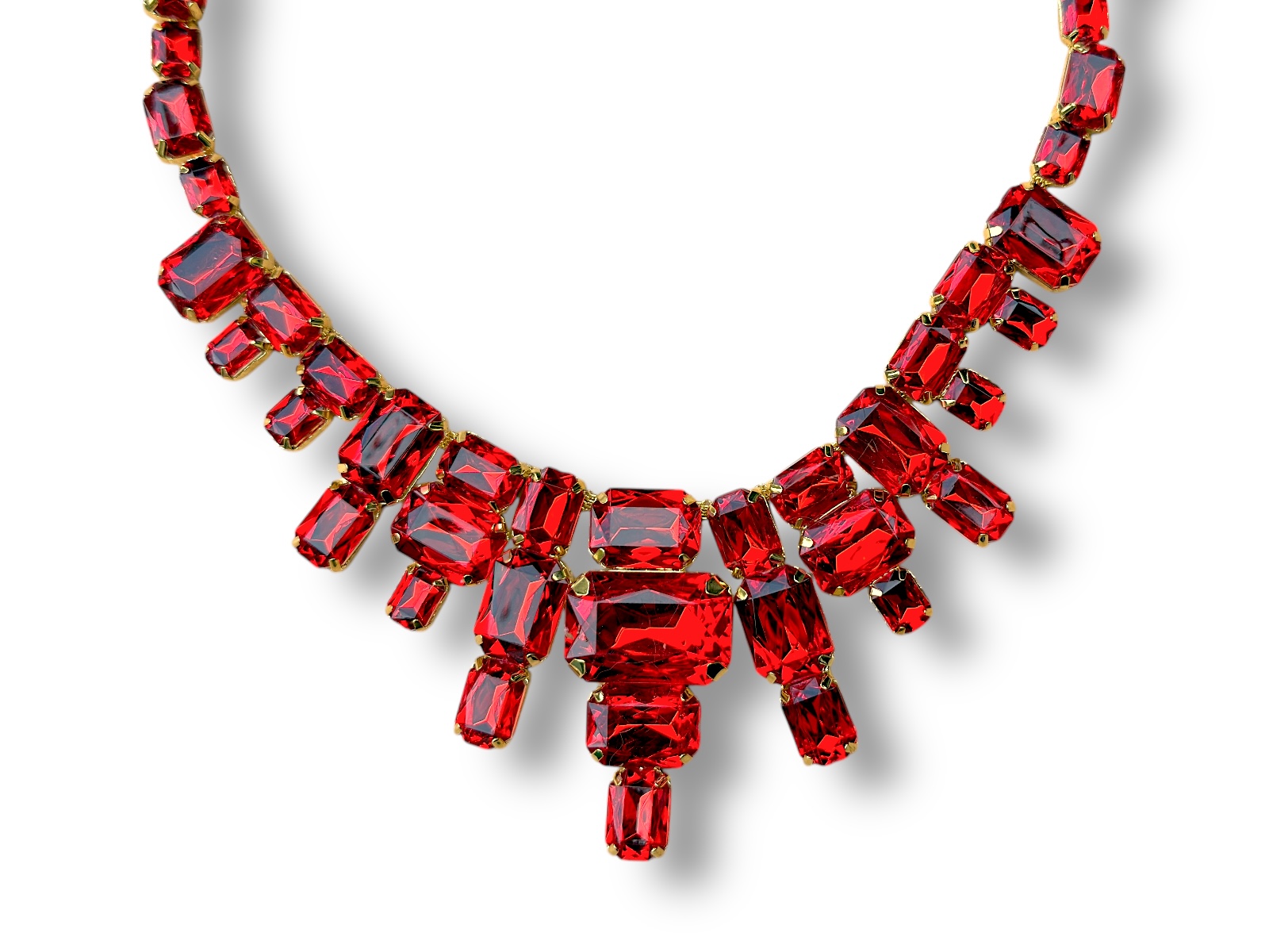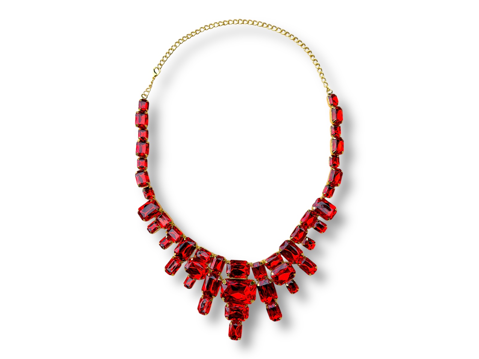A Golden Metal, (Nickel free), chain necklace, decorated with red facetted Resin, mixed shaped and sized rectangular and square shaped panels, each set in a Golden Metal frame. The longest four panel pendant is 2.5 cm in width, 0.5 cm in depth, and 5.5 cm in drop length. The shortest two panel pendant is 1.5 cm in width, 0.5 cm in depth, and 2 cm in drop length. The length of the necklace is adjustable from 40 cm in length to 58 cm in length, and the necklace is attached by a Golden Metal oyster clasp, and an 18 cm chain, (for adjustable sizing).