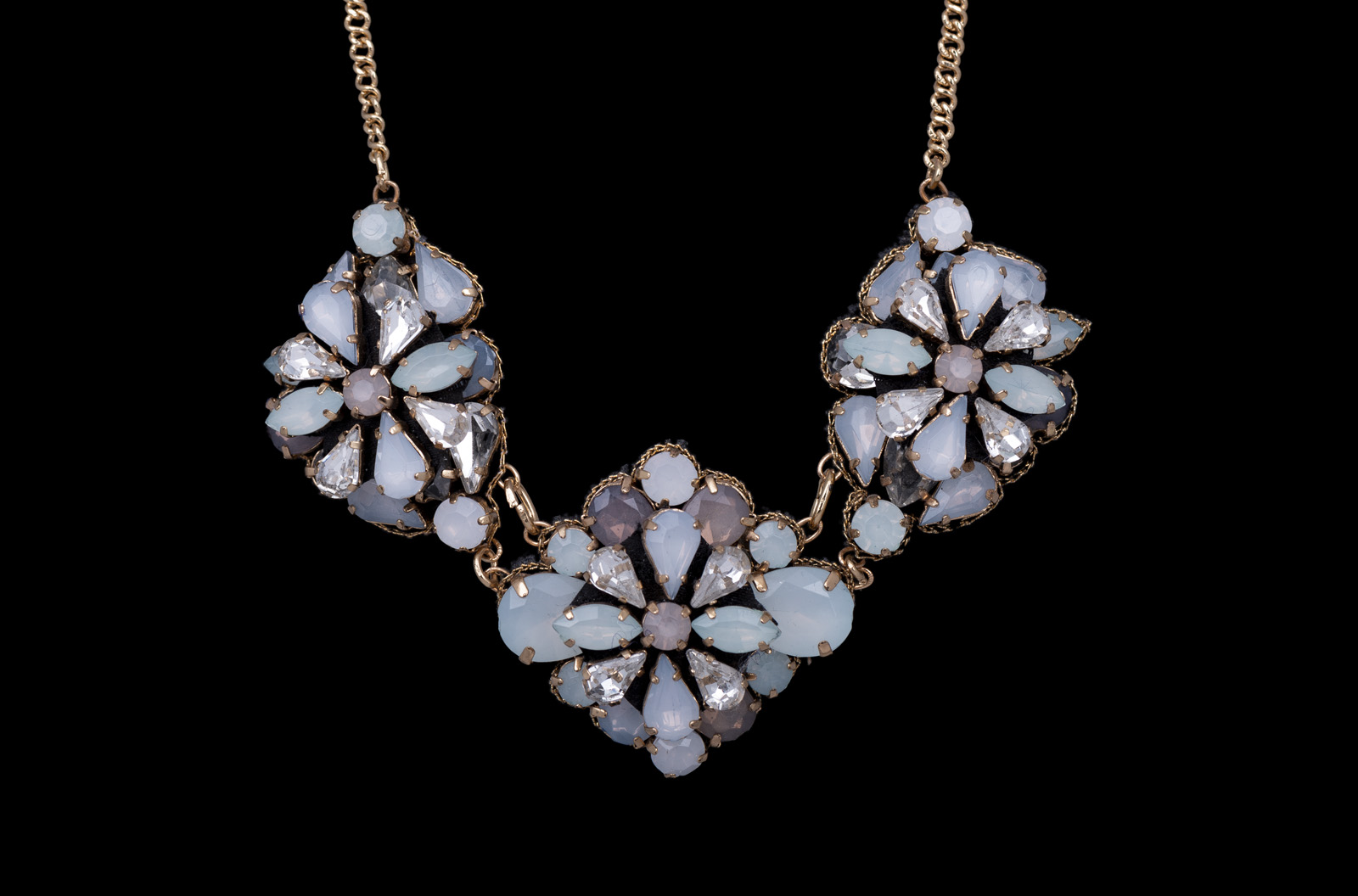 Be the first to review “A Golden Metal Chain Necklace Decorated With Three Floral Patterned Panels, Each Inlaid With Clear And Opalescent Resin Cabochons”