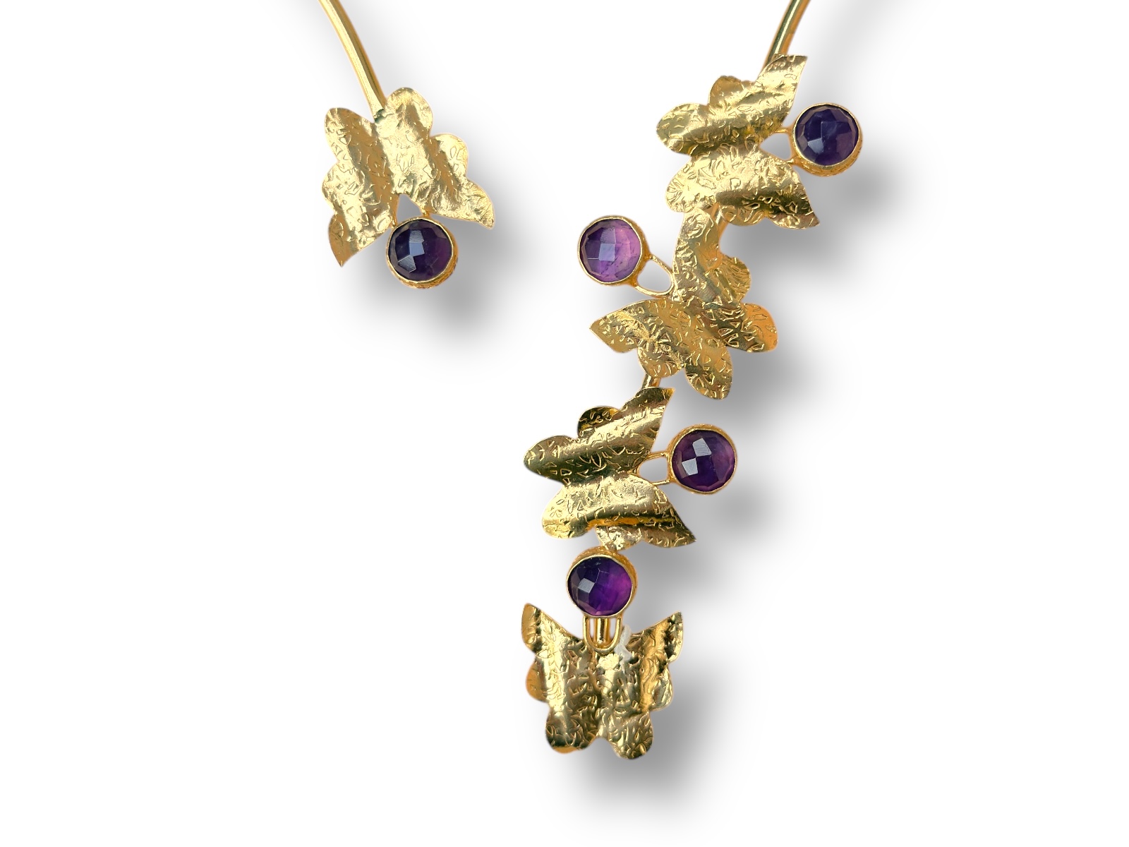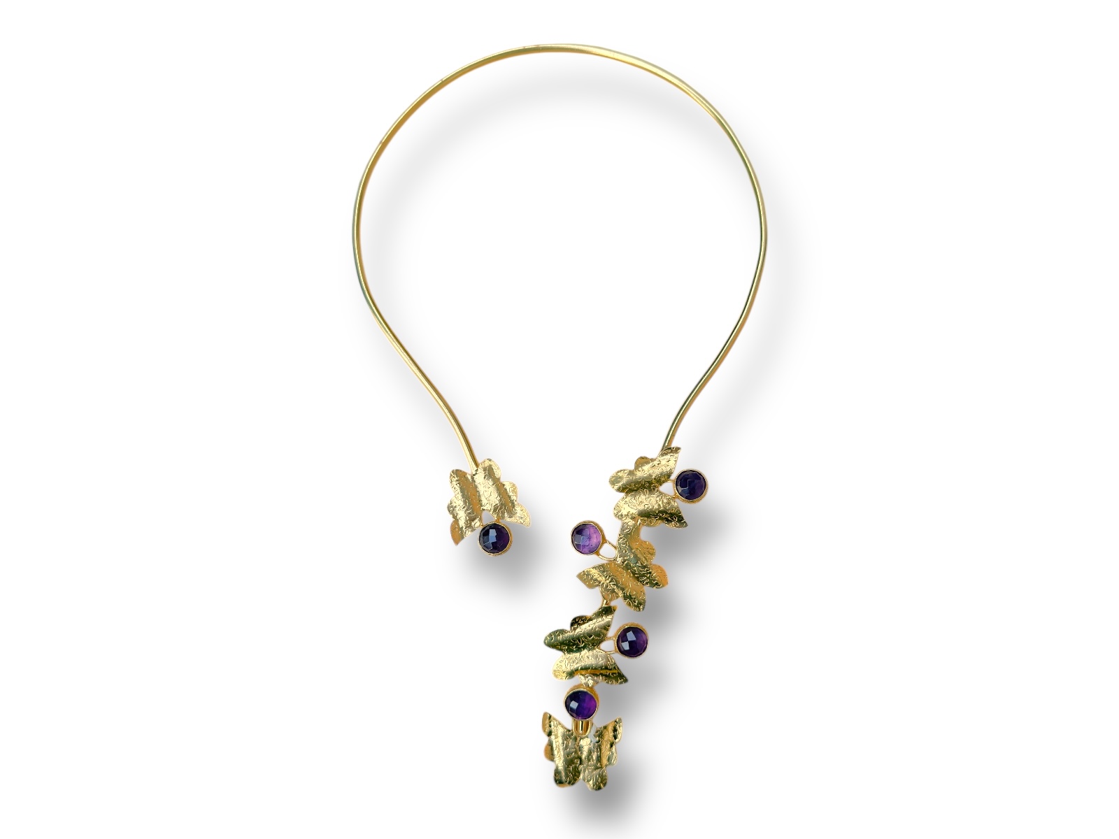 A Golden Metal, (Nickel free), curved open band long necklace, with, at one end of the band, a Golden Metal patterned butterfly panel, and an Amethyst domed facetted circular bead, set in a Golden Metal circular case, and, at the other end of the band, four Golden Metal butterfly patterned panels,, and four Amethyst domed facetted circular beads, each set in a Golden Metal case. Each butterfly panel is 2.5 cm in width, and 2.5 cm in length. Each encased Amethyst is 1.1 cm in diameter and 0.5 cm in depth. The inner diameter of necklace band is 13 cm, and the drop length of the necklace is 25.5 cm.