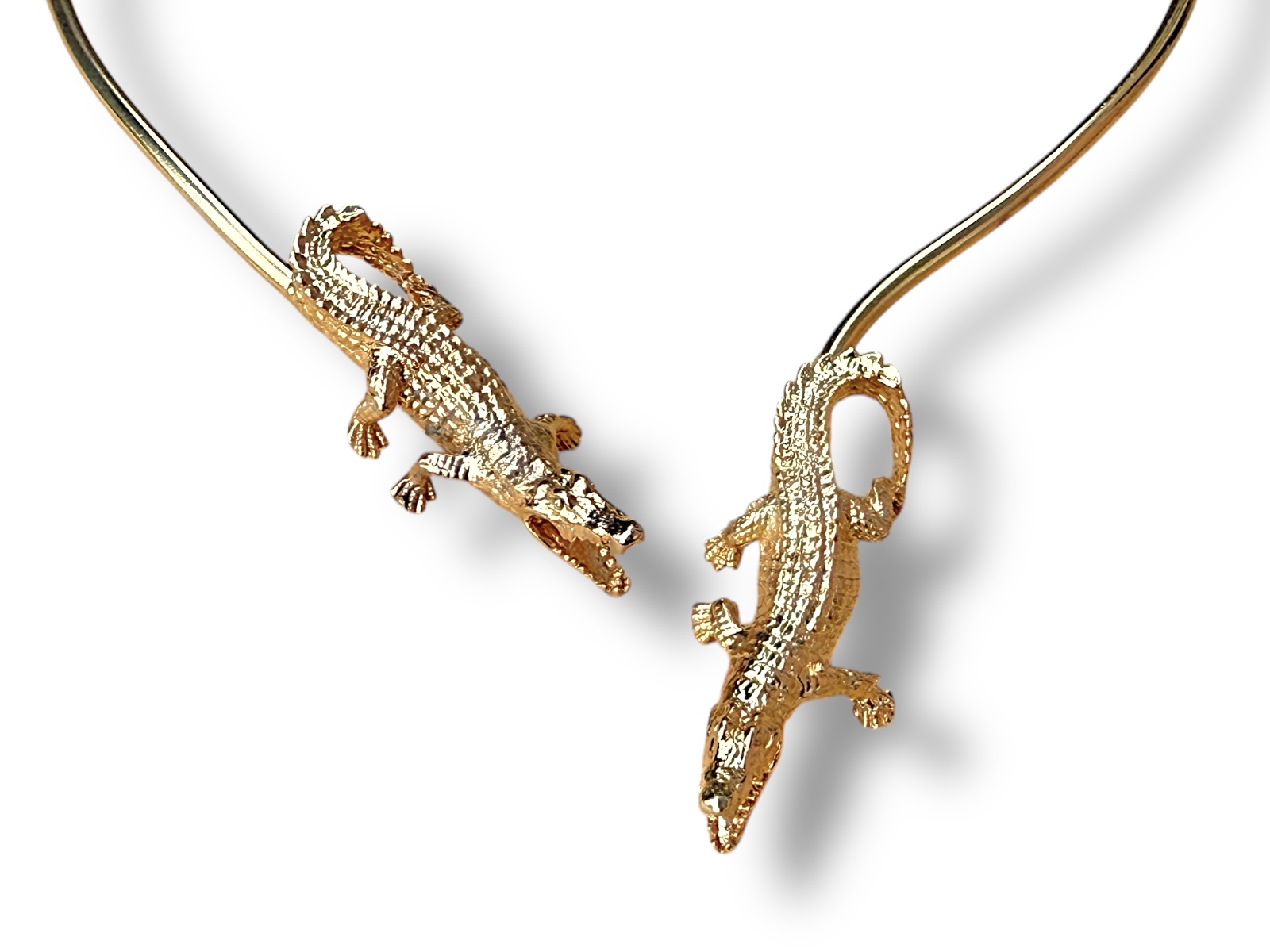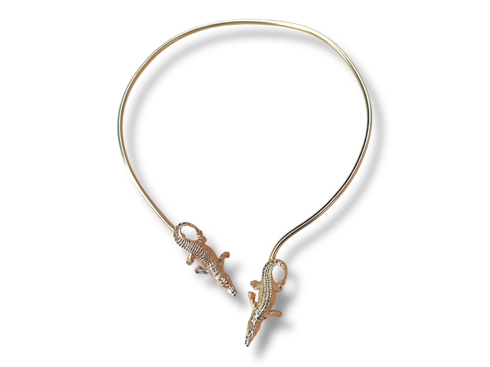 A Golden Metal, (Nickel free), curved band necklace with two crocodile finials. Each crocodile is 2 cm in width, 4.5 cm in length, and 1 cm in height. The necklace is 17.5 cm in drop length. The inner diameter of the curved band is 13 cm, and is adjustable in size.