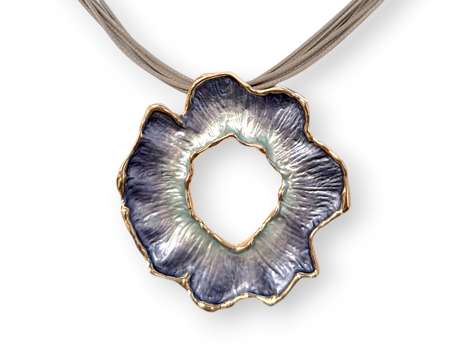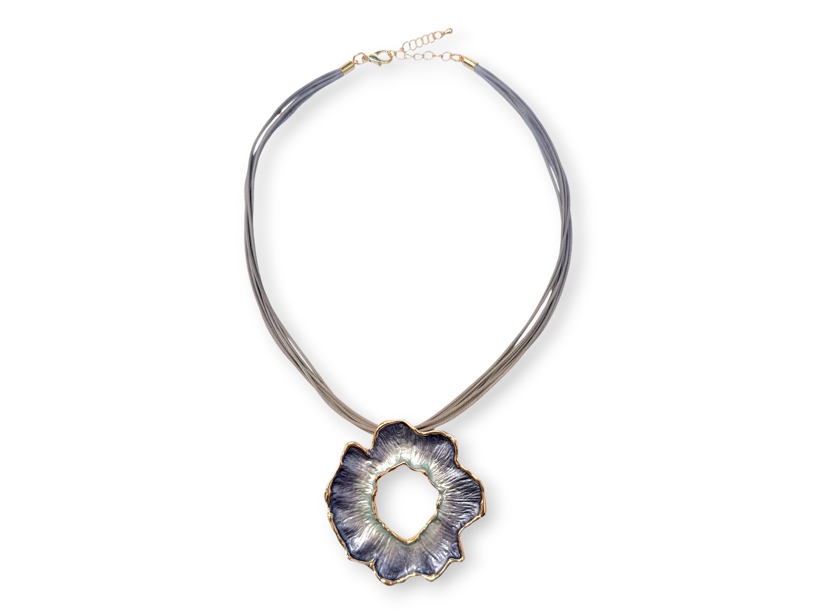 A Golden Metal, Nickel free), light blue to dark blue, enamelled band flower pendant with Golden Metal wavy band borders. The pendant is suspended from a four grey cords long necklace. The width of the band of the pendant varies from 1 cm in width to 1.5 cm in width. The pendant is 6 cm in width, and 6 cm in drop length. The drop length of the pendant and necklace is adjustable from 26 cm to 29 cm, and the necklace is attached, by a Golden Metal, (Nickel free), oyster clasp, and a 6 cm Golden Metal, (Nickel free) chain, (for adjustable sizing).