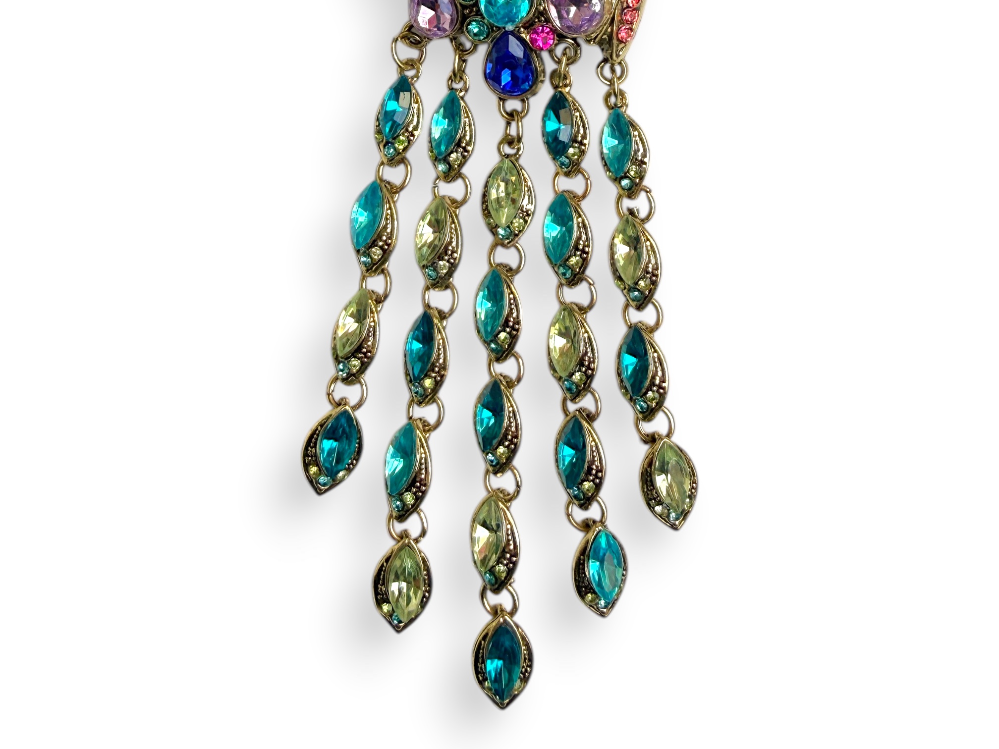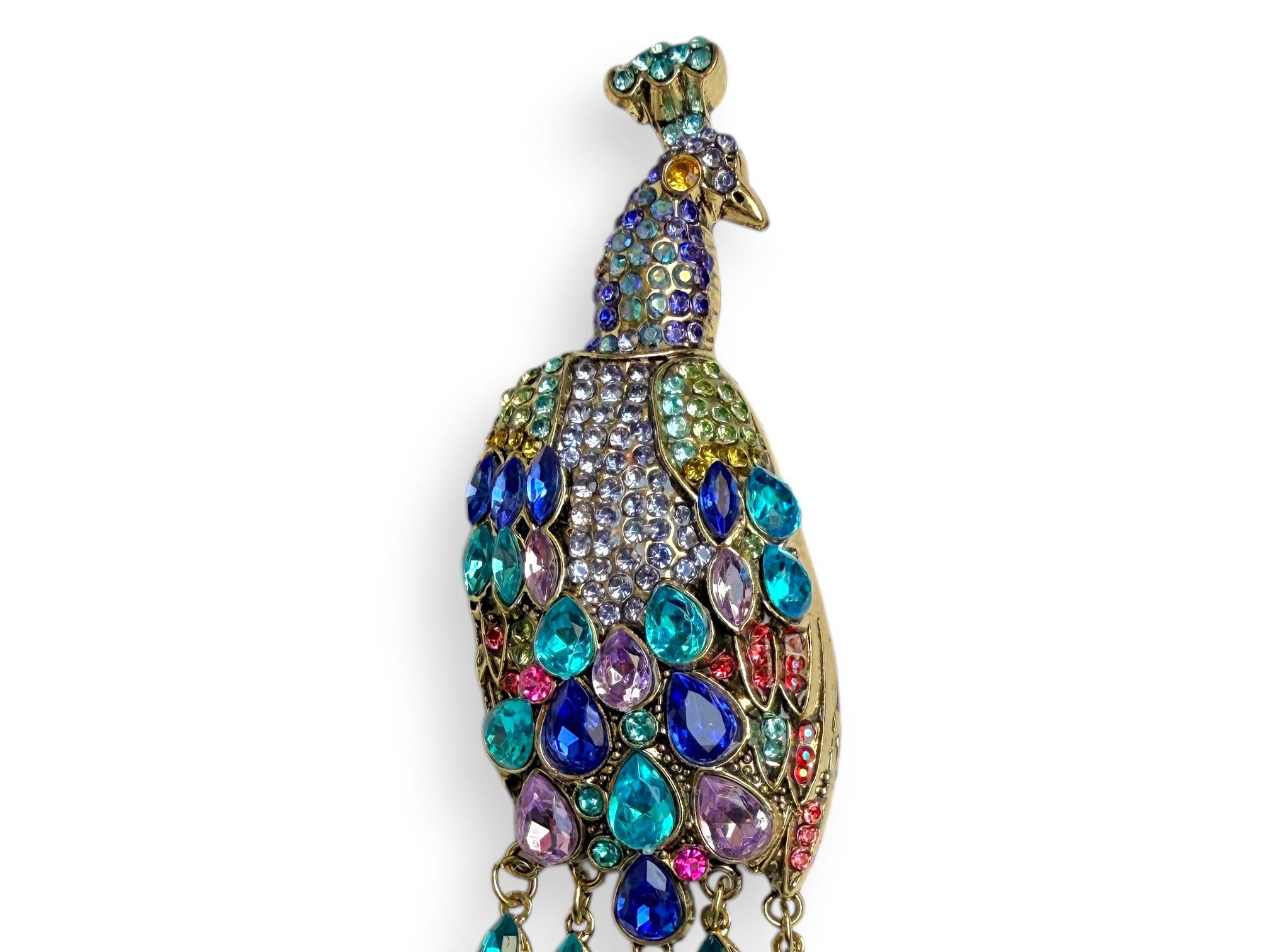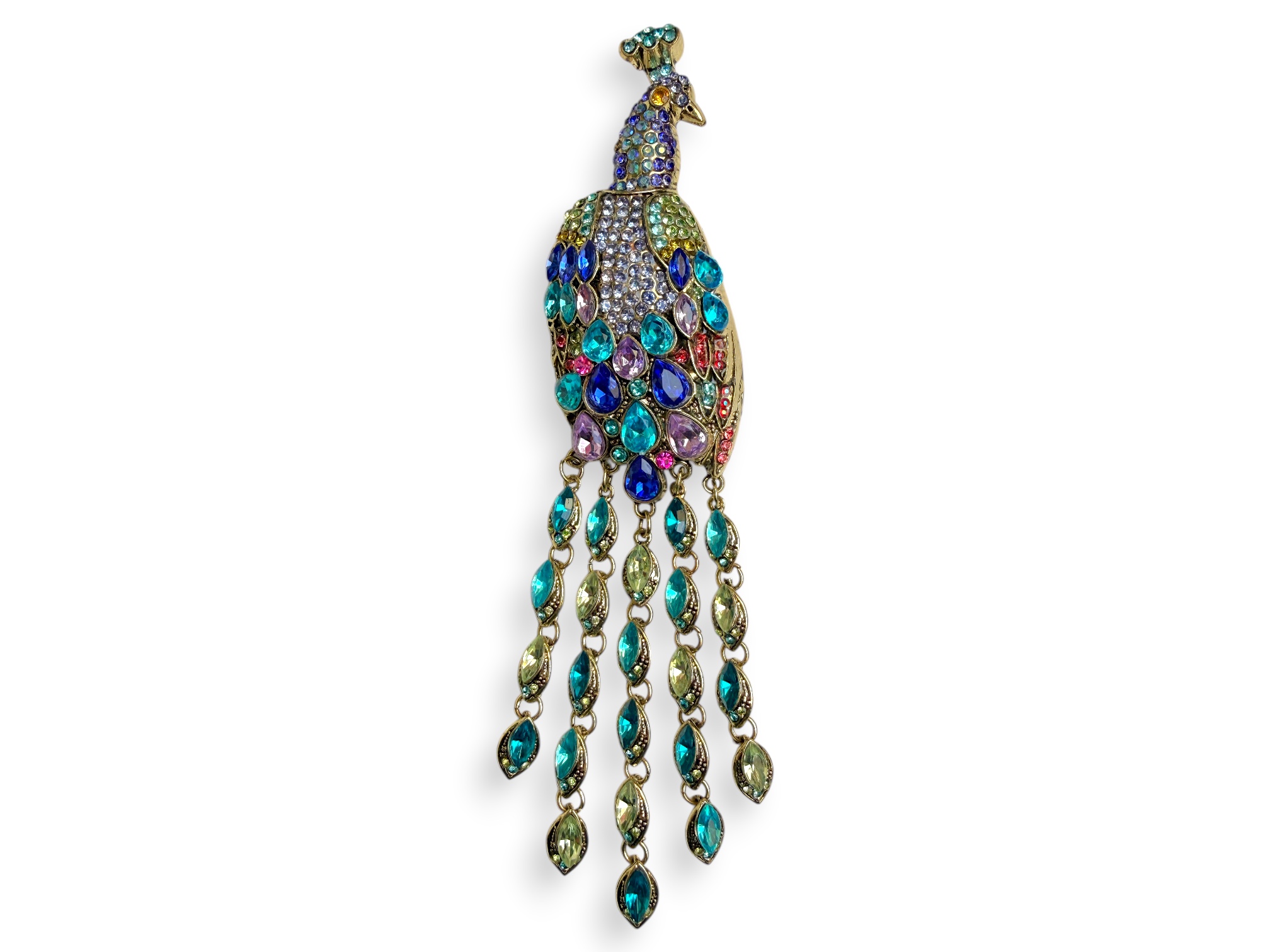 A Golden Metal, (Nickel free), long peacock brooch, inlaid with small multicoloured facetted Glass cabochons. The body of the peacock is inlaid with small facetted domed circular multicoloured Glass cabochons, and larger domed facetted teardrop and domed facetted pointed oval multicoloured Glass cabochons. The ‘tail’ of the peacock is made up with five Golden Metal chains, each inlaid with blue, turquoise and light golden domed facetted pointed oval cabochons. The brooch is attached, at the back, by a Golden Metal pin and catch. The brooch is 4 cm in width, 1 cm in depth, and 18 cm in drop length.