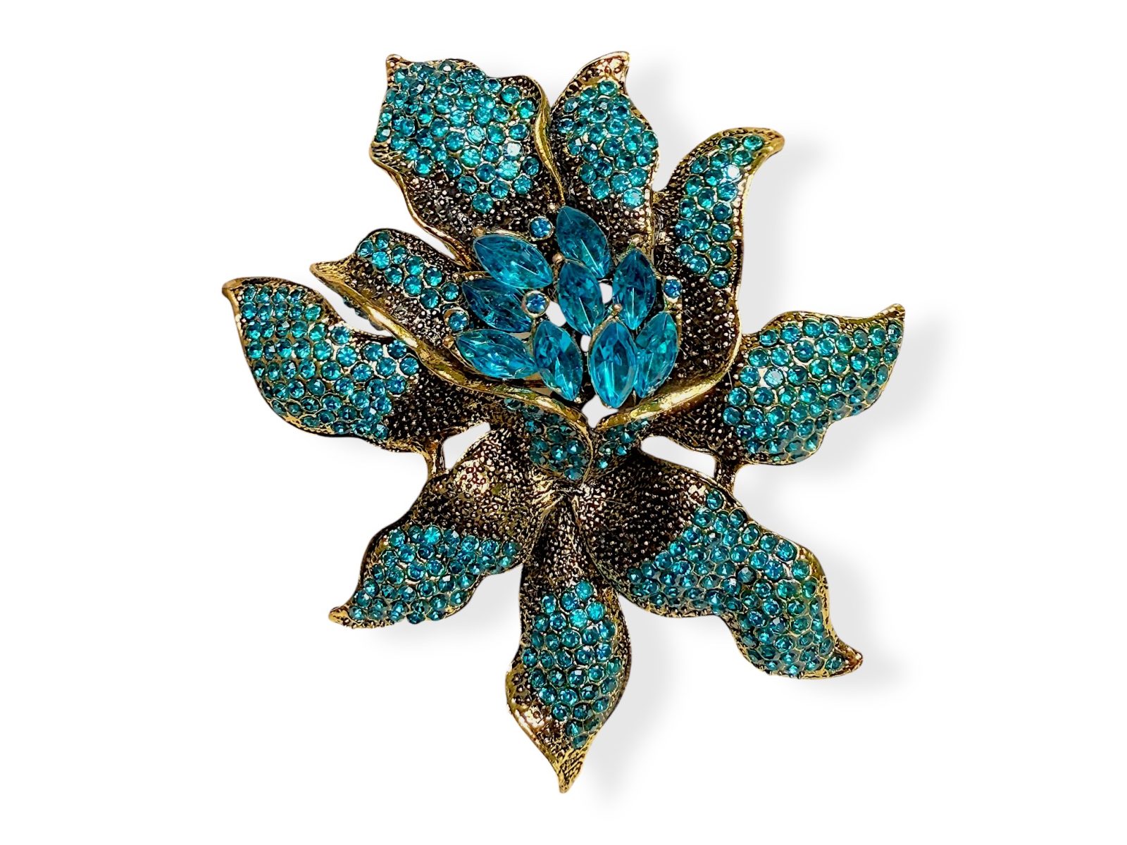 A Large Golden Metal, (Nickel free), nine petalled flower brooch, inlaid with small dark turquoise facetted Glass beads, and a cluster of nine dark turquoise d0med pointed oval Glass bead in the centre of the brooch. The brooch is attached, at the back, by a Golden Metal, (Nickel free), pin and catch. The brooch is 8 cm in width, 1.5 cm in maximum depth, and 9 cm in drop length.