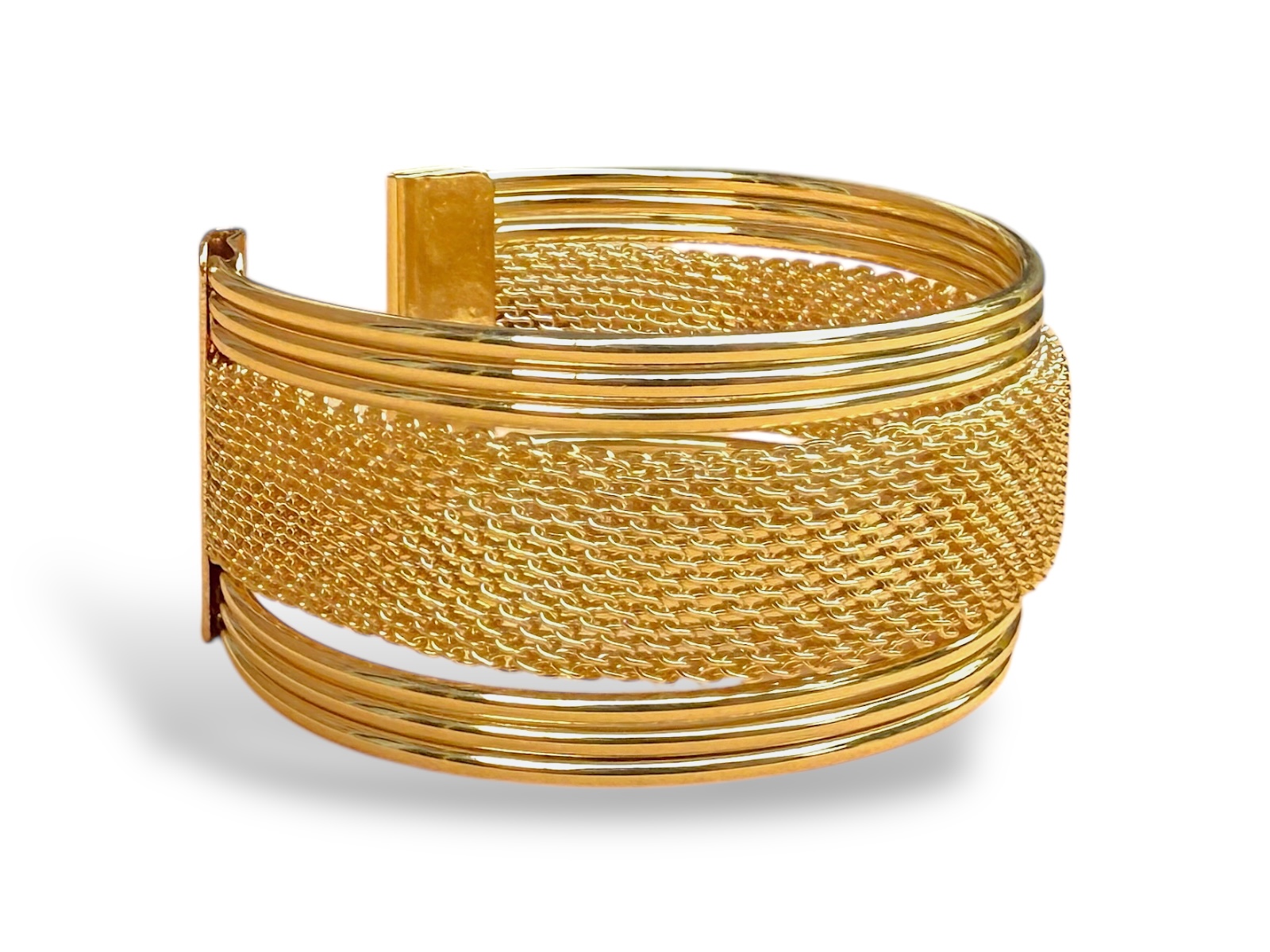A Golden Metal, (Nickel free), open cuff of six narrow bands, and a central wide band of braided wires. There is a folded Golden Metal rectangular panel at each end of the cuff. The band of the cuff is 2.8 cm in width, and the inner diameter of the cuff is 6.5 cm.