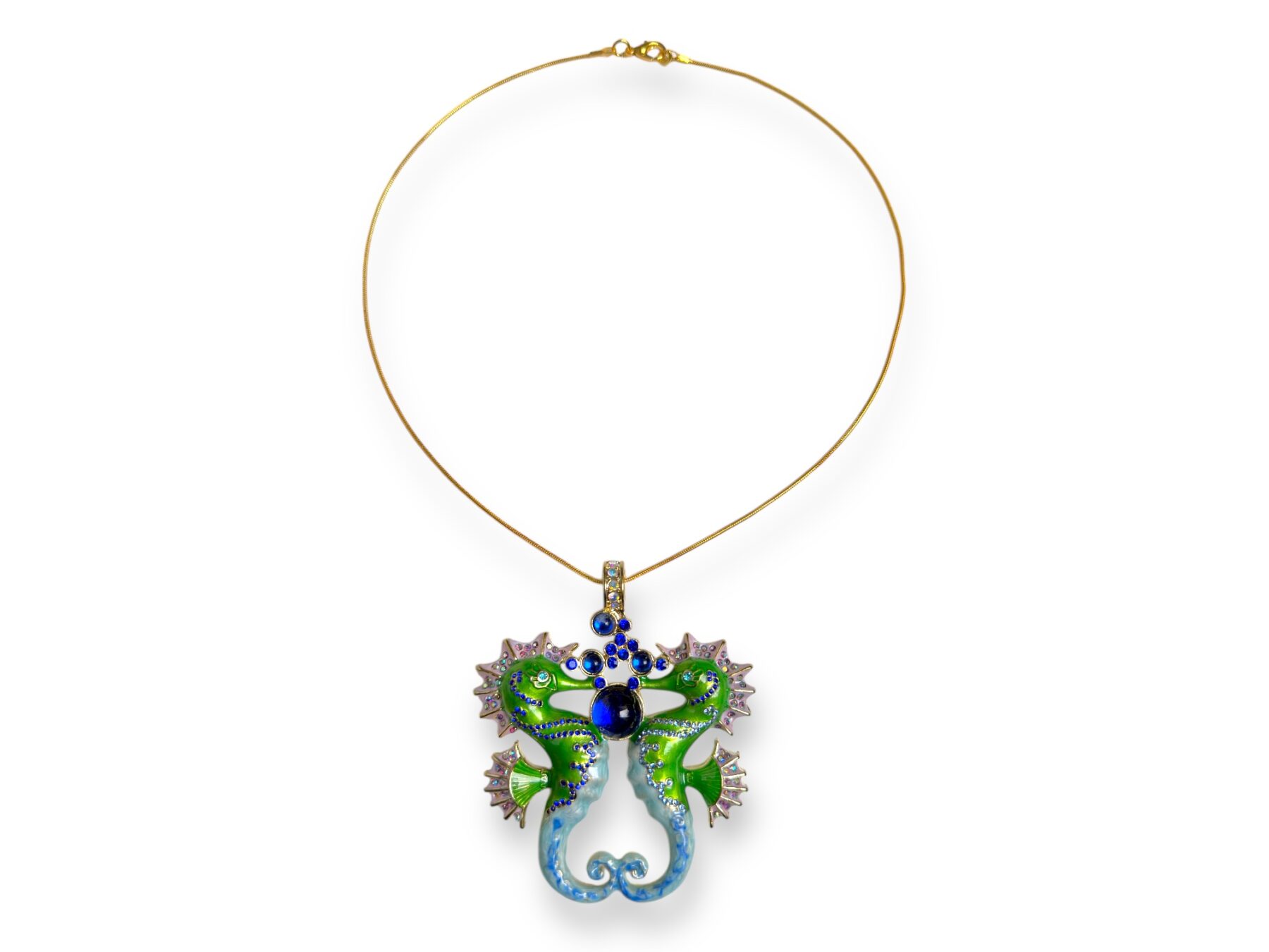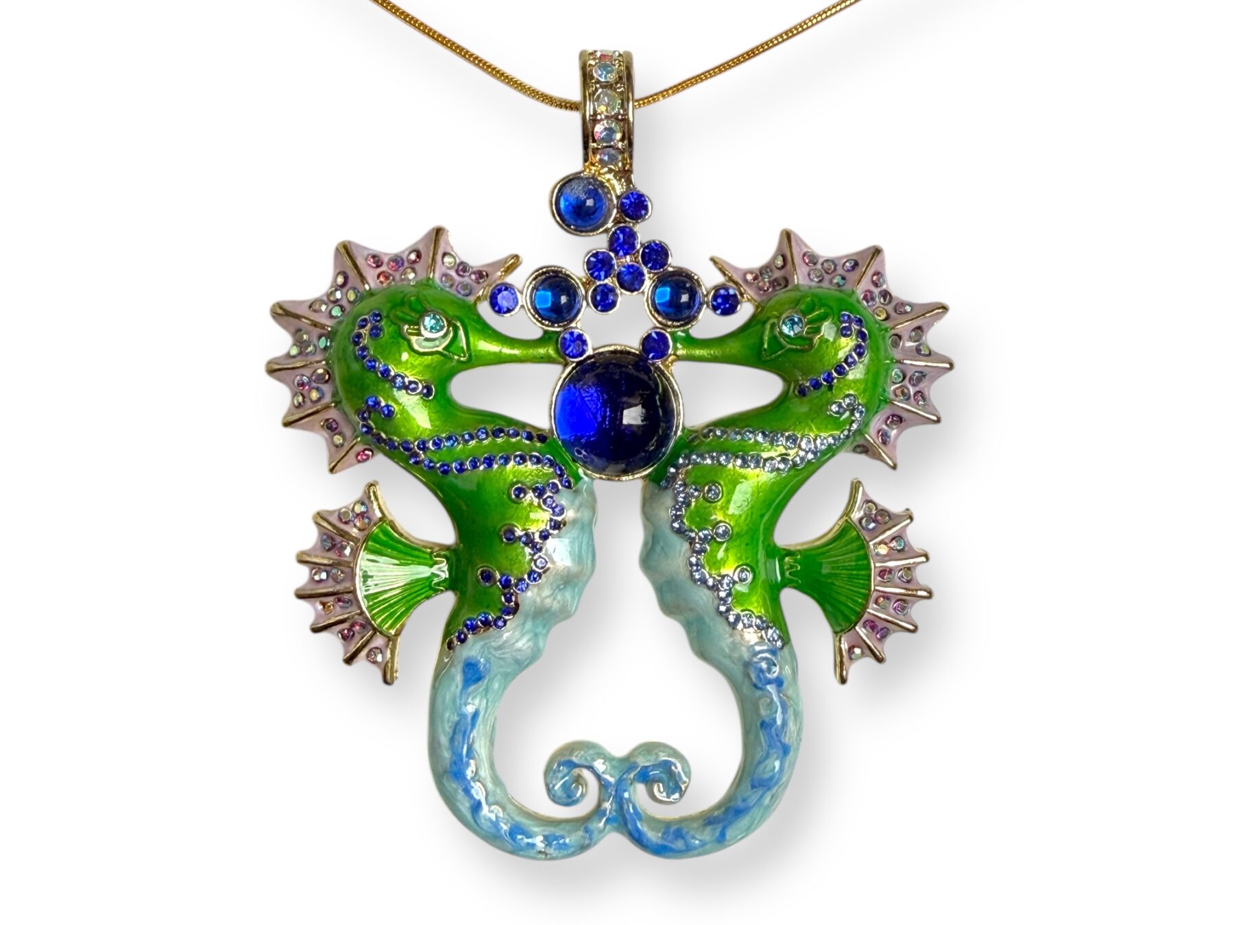 A Golden Metal, (Nickel free), pendant of two sea horses, each with light blue and green enamelling, and curved bands of very small blue, purple, and iridescent, facetted Glass bead inlays.  At the centre of the top of the pendant are inlays of ten small dark blue, facetted Glass beads, three domed circular dark blue Glass beads, and one large domed circular dark blue Glass bead, each bead set in a Golden Metal circular frame. The pendant is suspended,  by a Golden Metal ring inlaid with ten small iridescent facetted Glass beads, from a Golden Metal, (Nickel free),  braided chain necklace.
