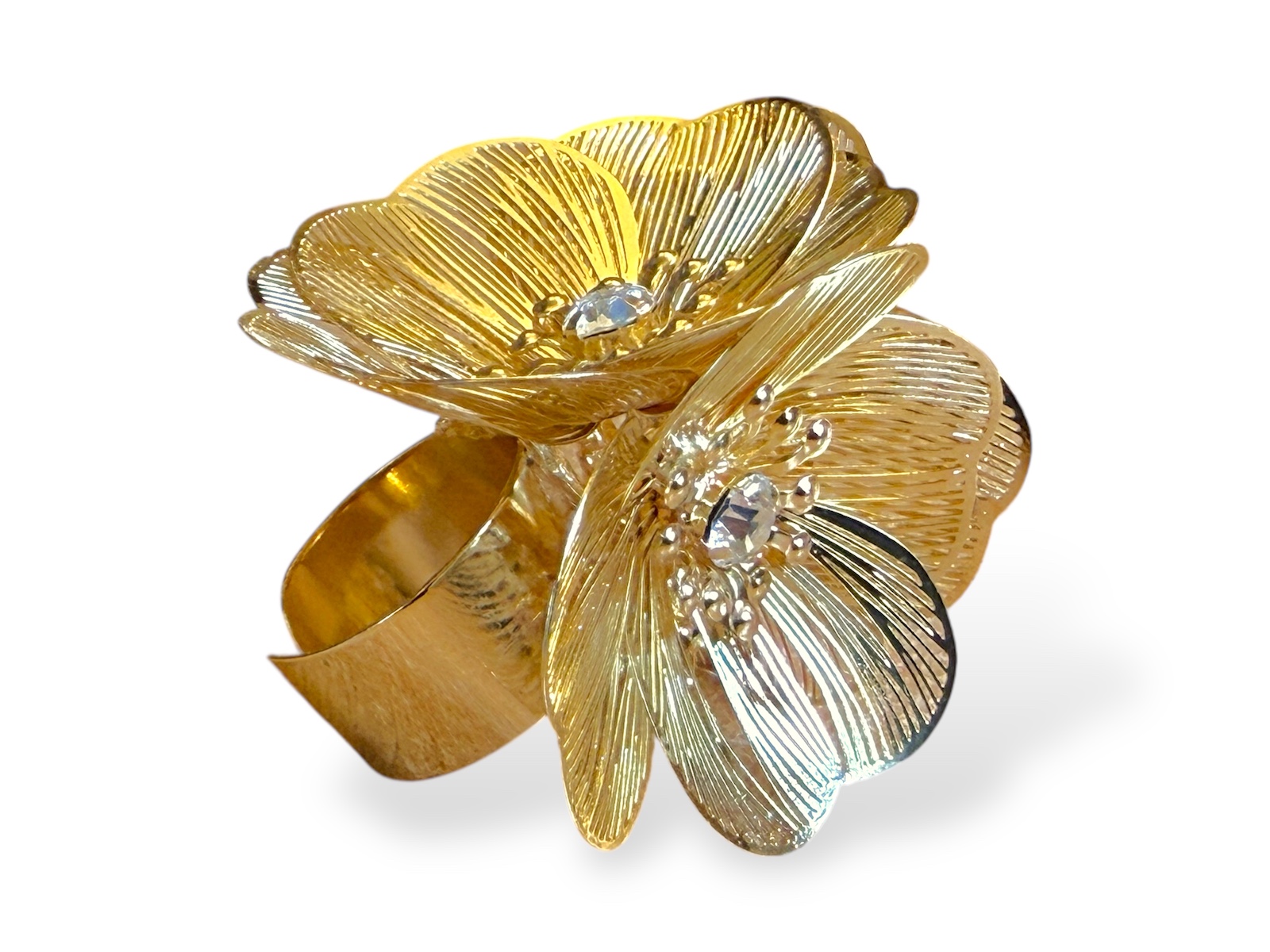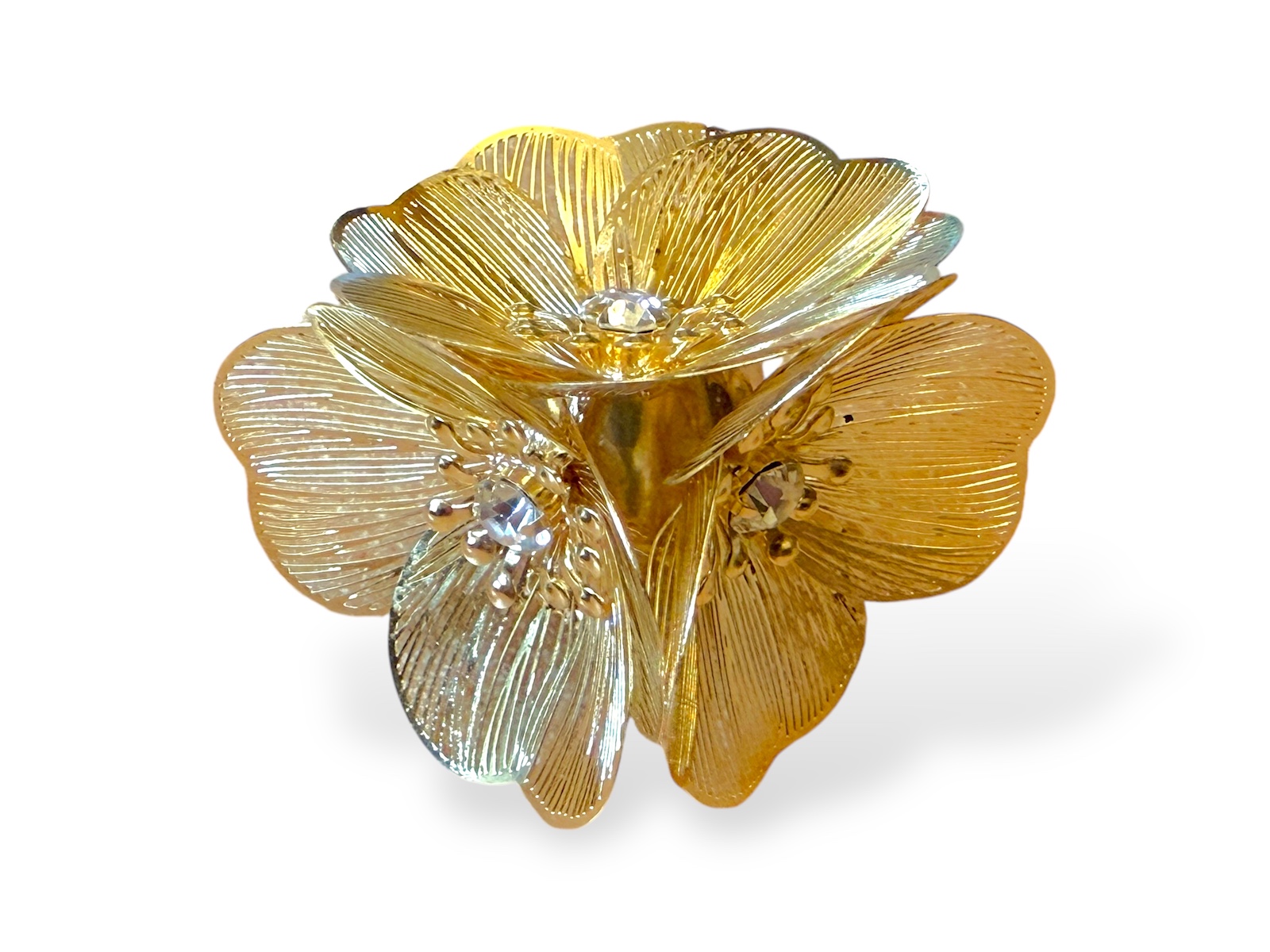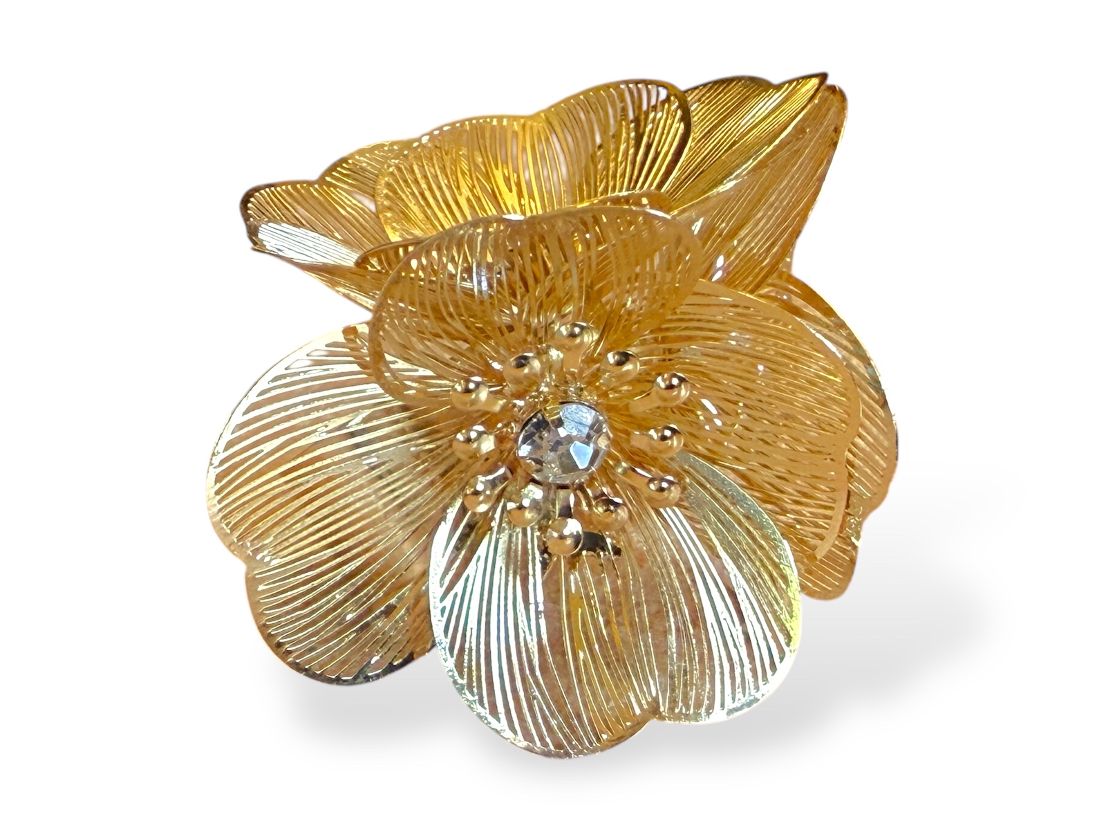 A Golden Metal, (Nickel free), wide, adjustable, open band ring. At the top of the ring are three, multi-petalled flowers of Golden Metal wire bands, each flower with a clear facetted Glass bead in the centre, bordered with small Golden Metal round beads on stalks. Each flower is, approximately, 3.5 cm in diameter and 0.5 cm in height. The ring band is 1 cm in width, and the inner diameter of the ring band is 1.5 cm, and is adjustable in size.