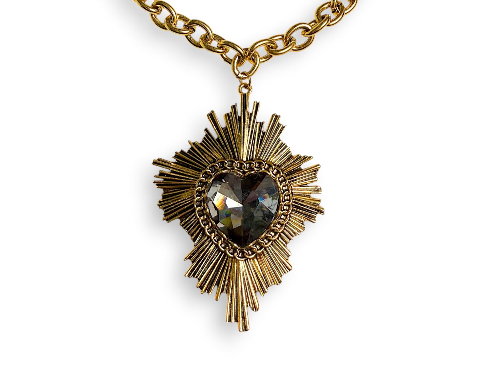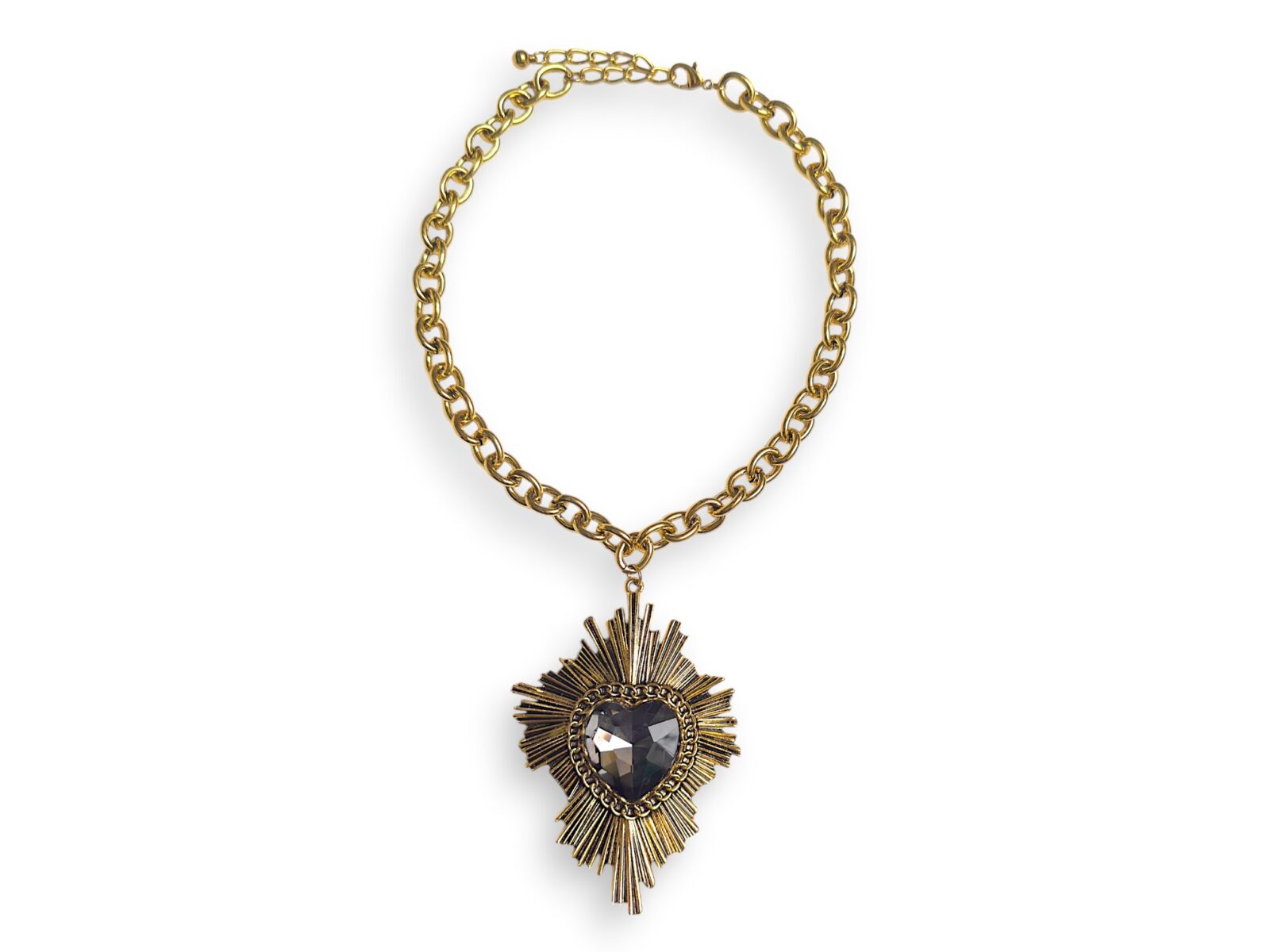 Golden Metal, (Nickel free) starburst pendant with a domed facetted black Glass heart shaped centre, on a Golden Metal chain necklace. The pendant is 7 cm. in width and 9 cm. in drop length. The necklace is attached by a Golden Metal oyster clasp, and an 8 cm. chain, so the drop length of the necklace and pendant is adjustable from 30 cm to 38 cm.