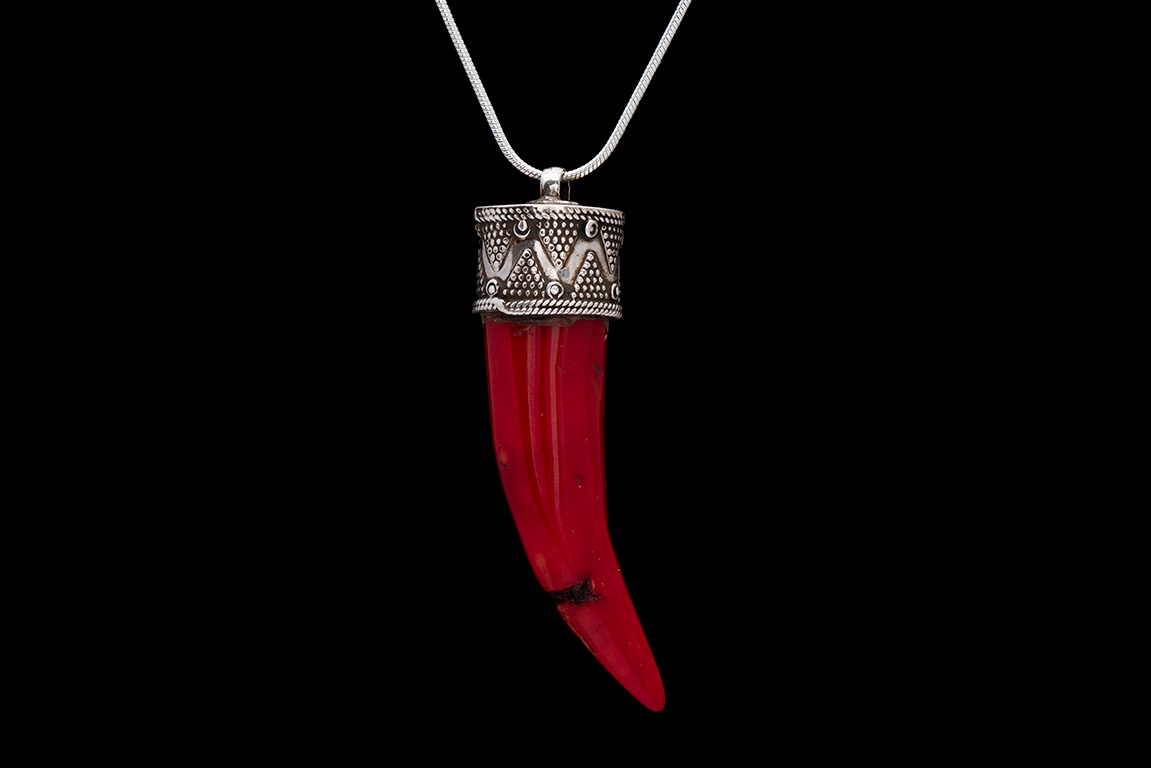A Kazak Red Dyed Sea Bamboo Coral Long Pointed Pendant With A Patterned Silver Plated Top