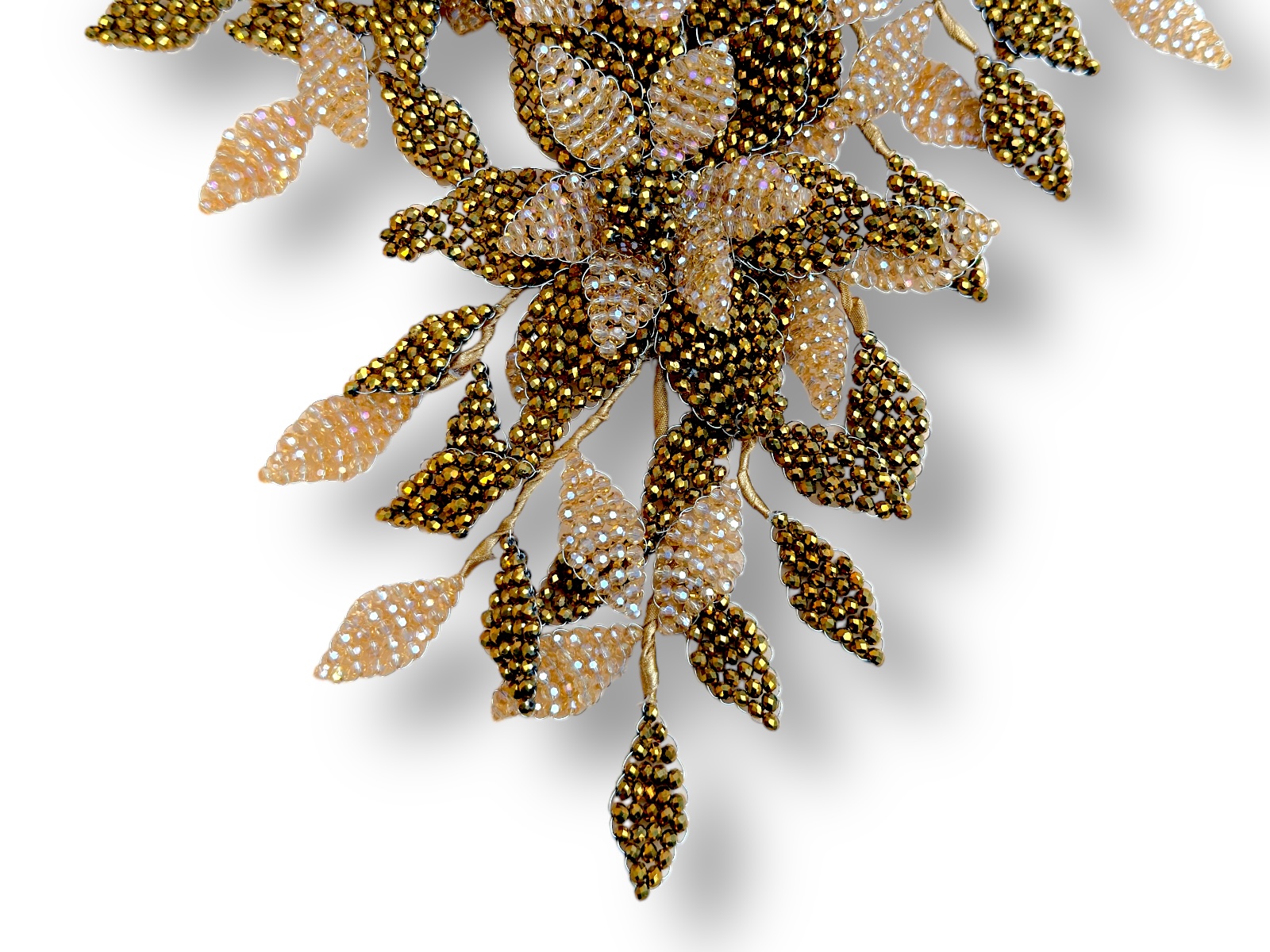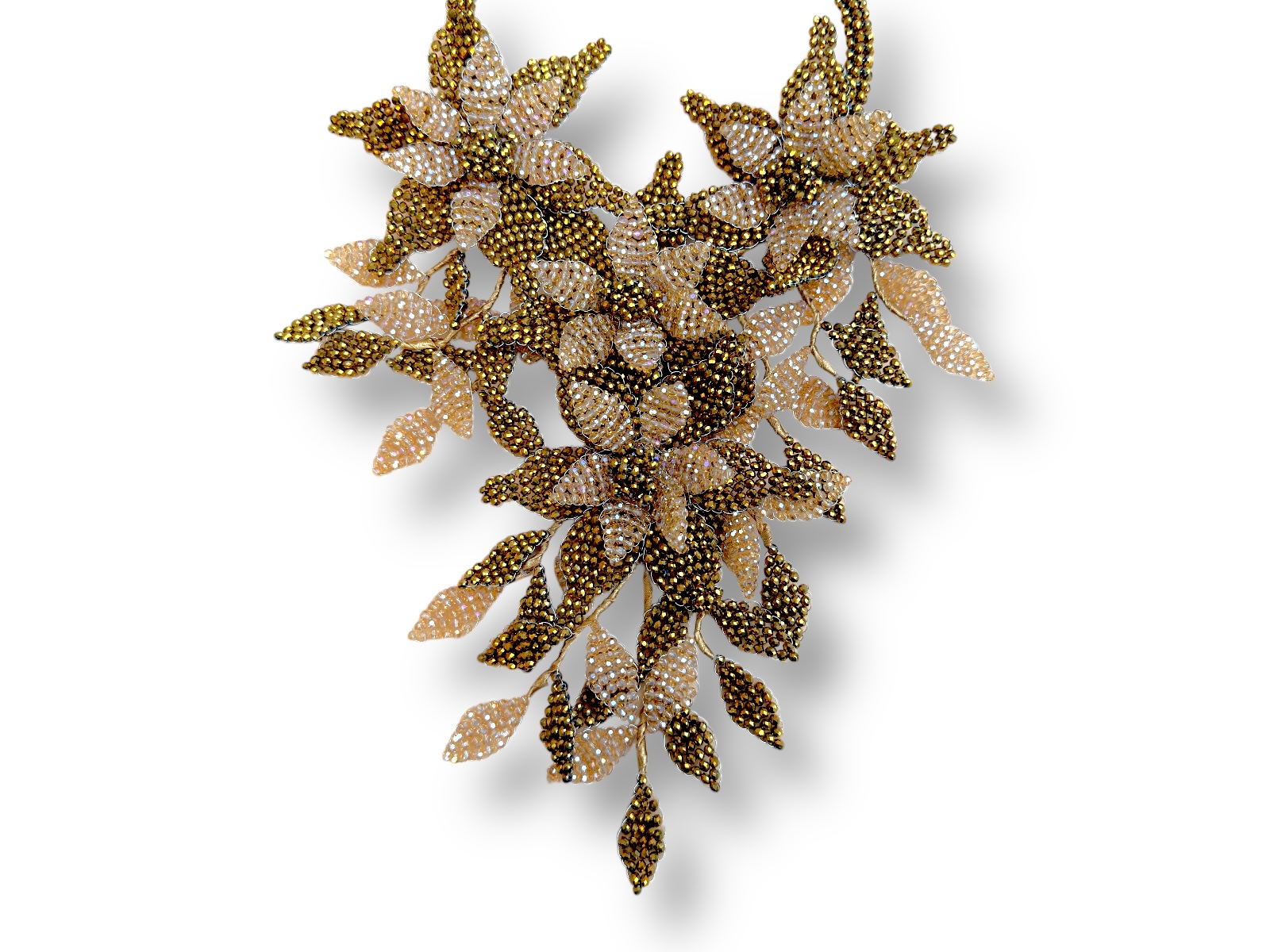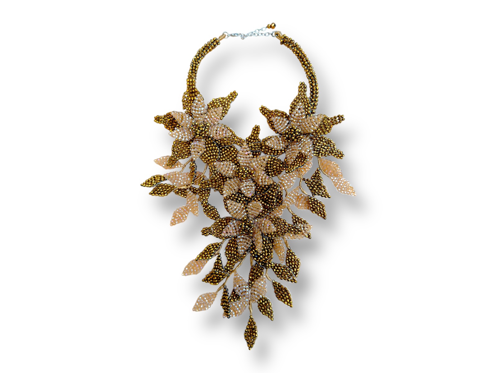 A large curved bands necklace, each band with lines of small dark golden Resin facetted round beads, and a long floral patterned bib, of mixed shaped wire panels decorated with light and dark golden Resin small round facetted beads , each panel attached to golden cloth covered bands. The necklace is 21 cm in width and the drop length of the necklace is adjustable from 34 cm to 42 cm. The necklace is attached by a Silvered Metal, (Nickel free), oyster clasp and an 8 cm Silvered Metal chain, (for adjustable sizing).