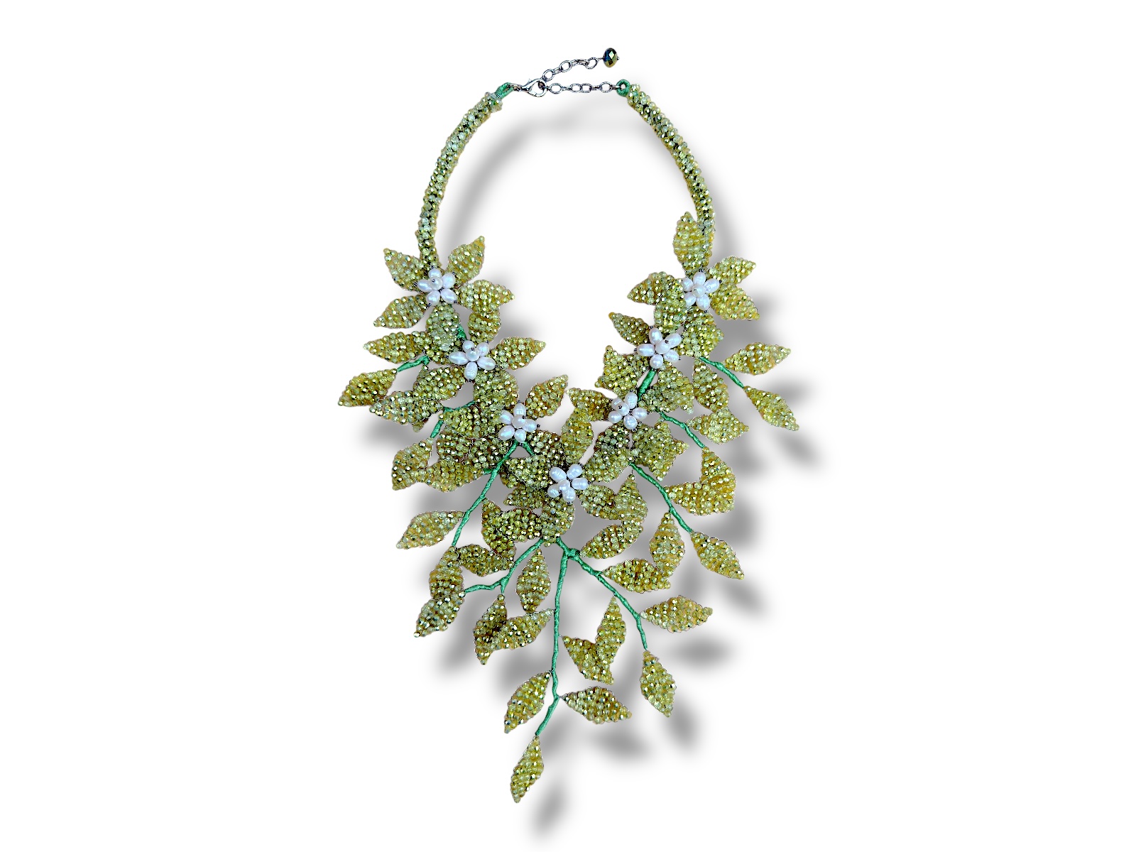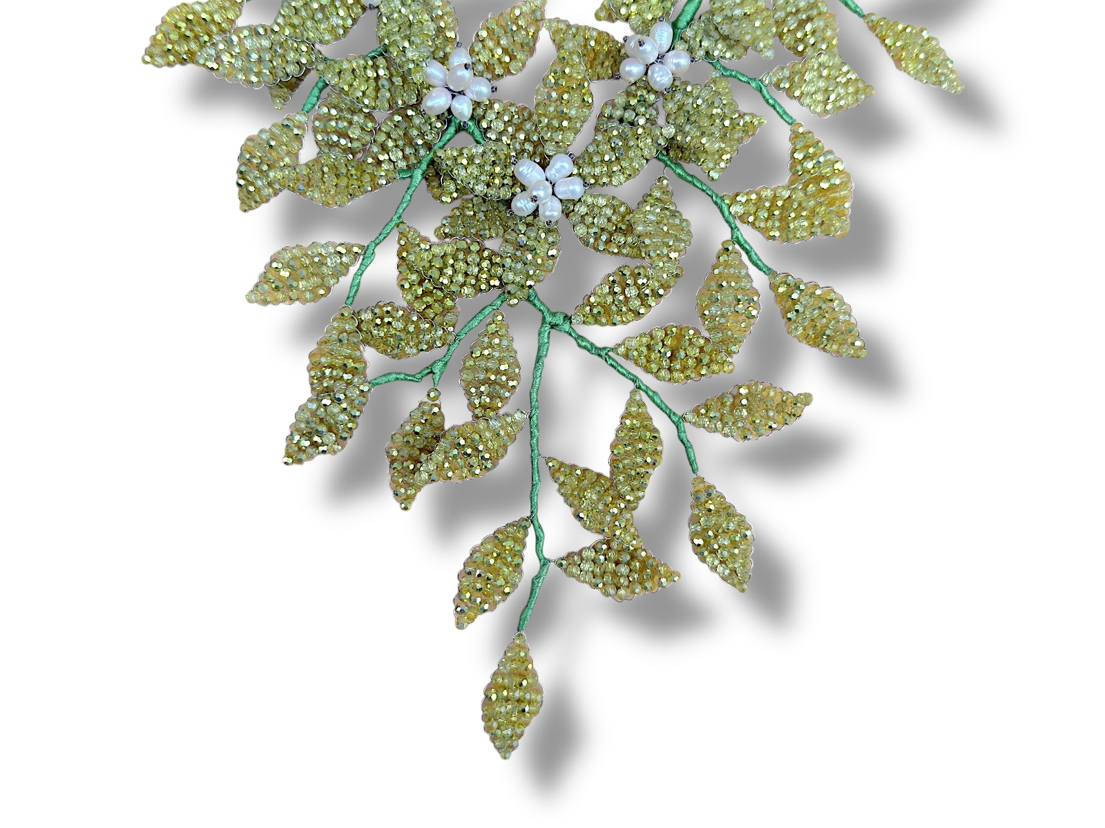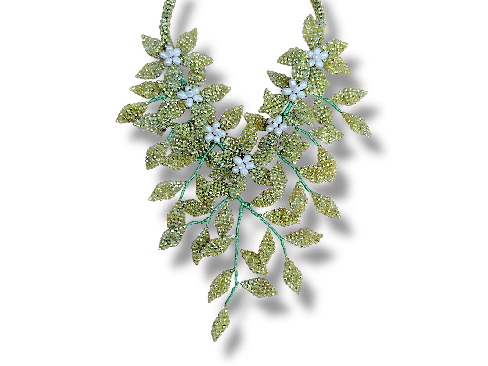 A Large Thai necklace of two curved bands, each decorated with small, light green, facetted Glass beads, and seven large flowers, each with five petals of small light green facetted Glass beads, and, in the centre of each flower, five white oval Freshwater Pearls. Around the flowers are seven green Silk covered bands with leaves of small light green facetted beads. Each flower is 7. cm in diameter and 1.5 cm in height. The inner diameter of the necklace is 14.5 cm. The necklace is 23 cm in width, 1.5 cm in depth, and the drop length is adjustable from 35 cm to 43 cm. The necklace is finished with a Silver Plated oyster clasp, and an 8 cm chain, (for adjustable sizing).