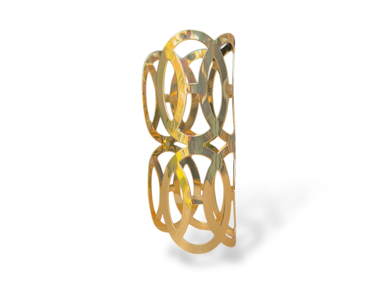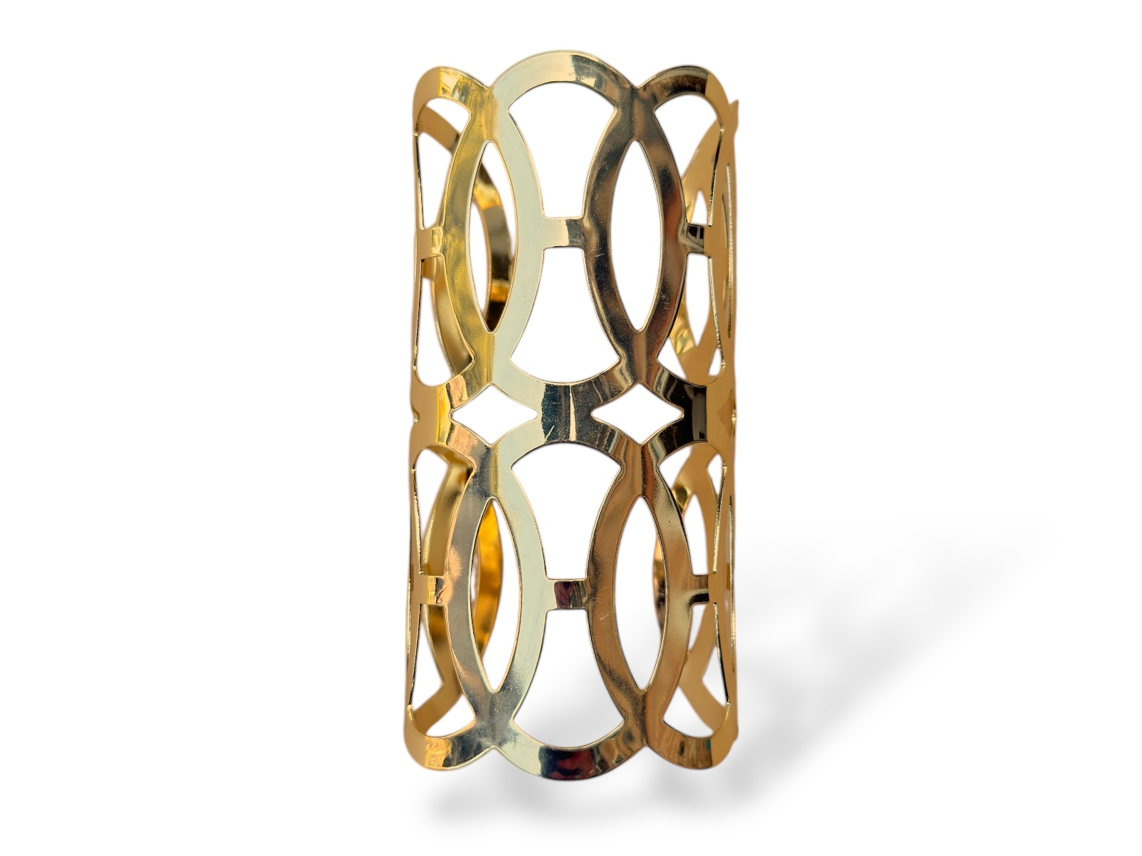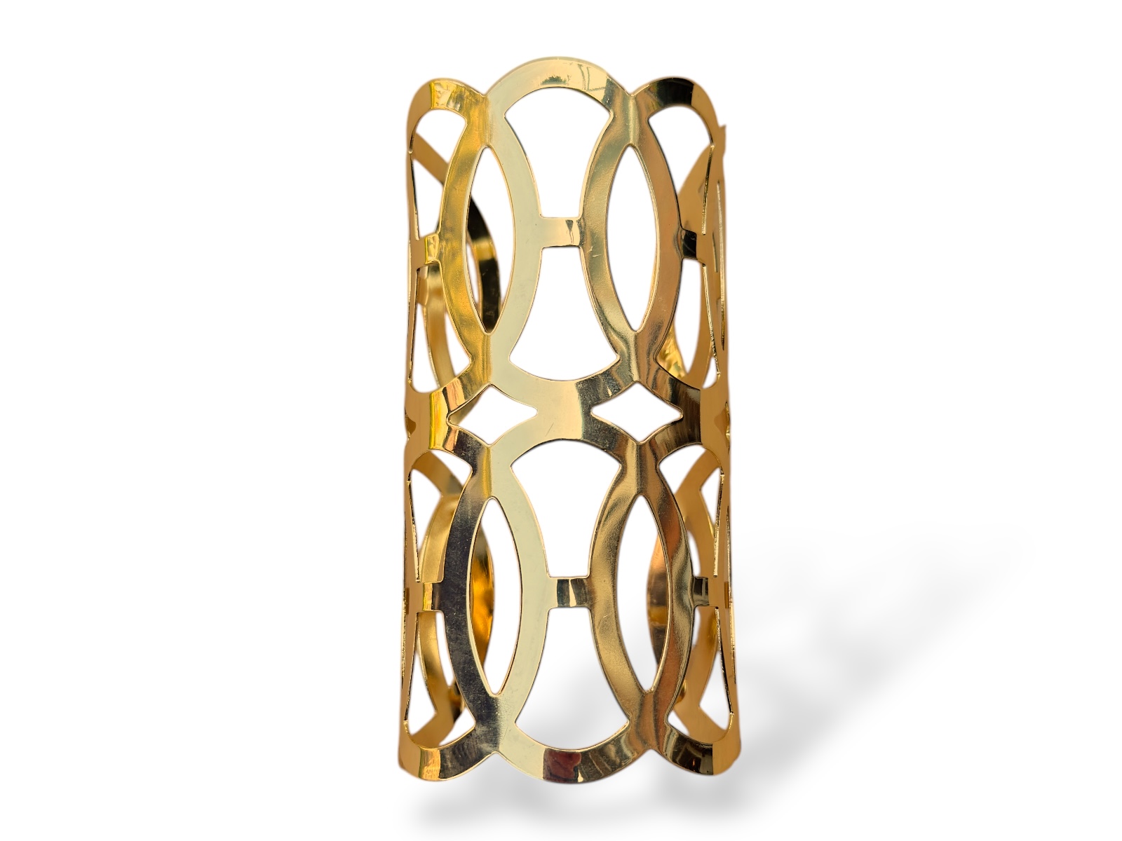A Golden Metal, (Nickel free), long curved open cuff with two rows of five interlocking flat oval bands. Each oval band is 4 cm in width and 6 cm in length. The inner diameter of the band of the cuff is 6 cm, (adjustable), and the cuff is 12 cm in length.