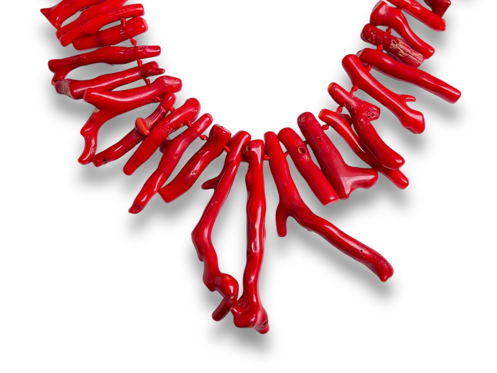 Be the first to review “A Long Knotted Necklace Of Sixty-Two Graduated Red Dyed Sea Bamboo Coral Branch Drops.”