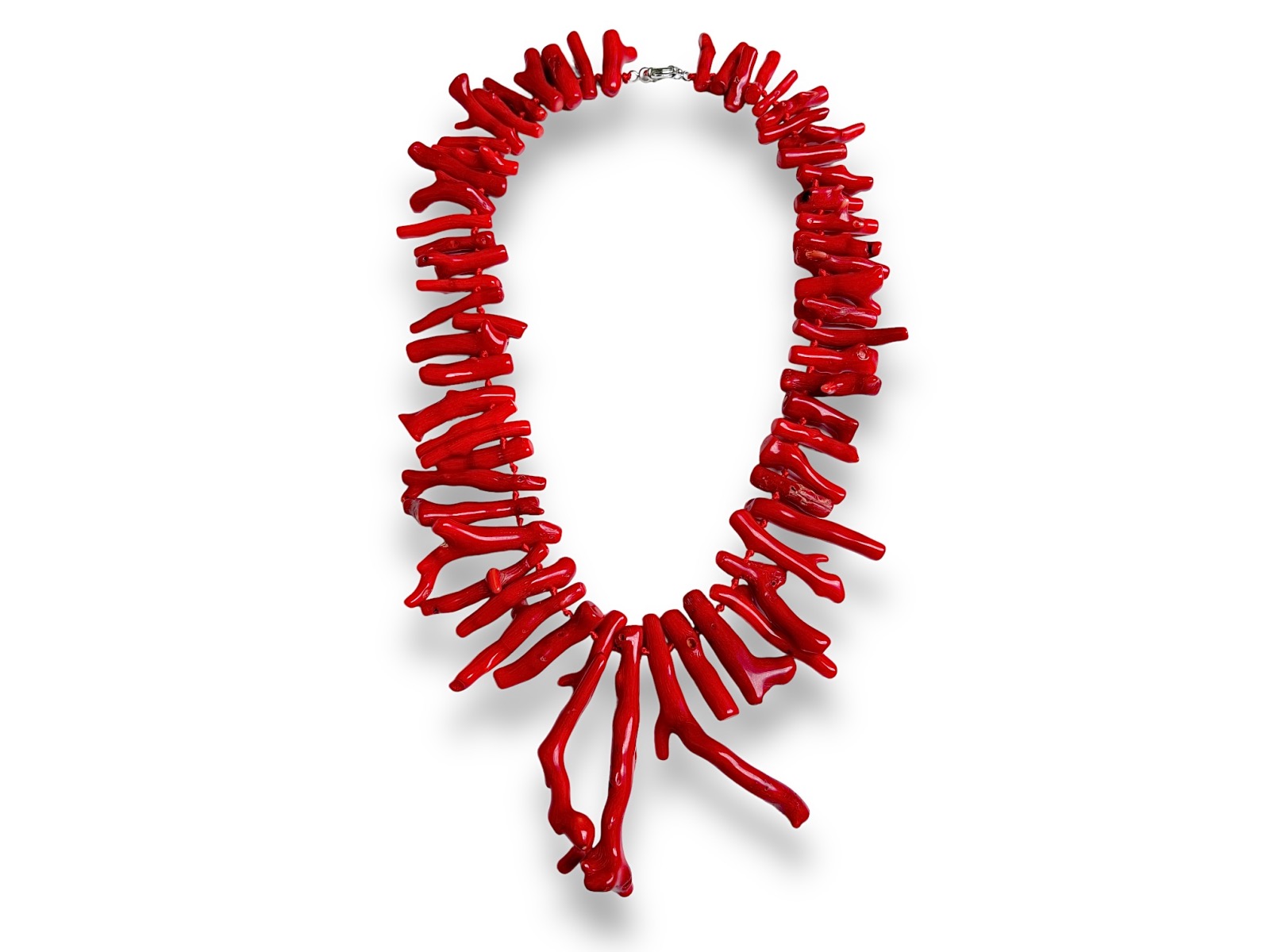 A long knotted necklace of sixty-two graduated red dyed Sea Bamboo Coral branch drops .The longest branch is 7.5 cm in drop length, and the shortest is 2.5 cm in drop length. The necklace is 35 cm in drop length, and is finished with a Silver Plated circular clasp and ring.