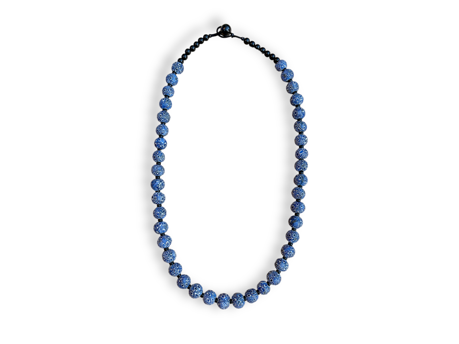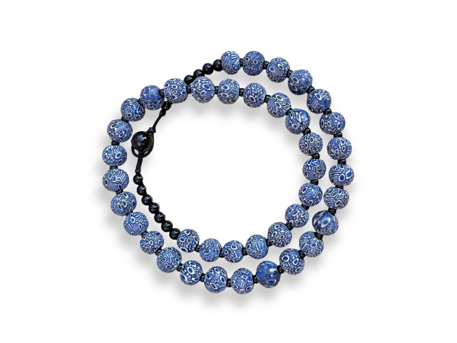 A long necklace of round handmade round blue and white Javanese glass beads, with small round black onyx spacer beads, finished with a macrame loop and black onyx toggle