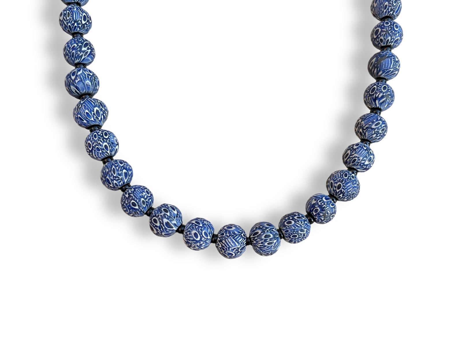 A Long Necklace Of Blue And White Patterned Javanese Glass Beads