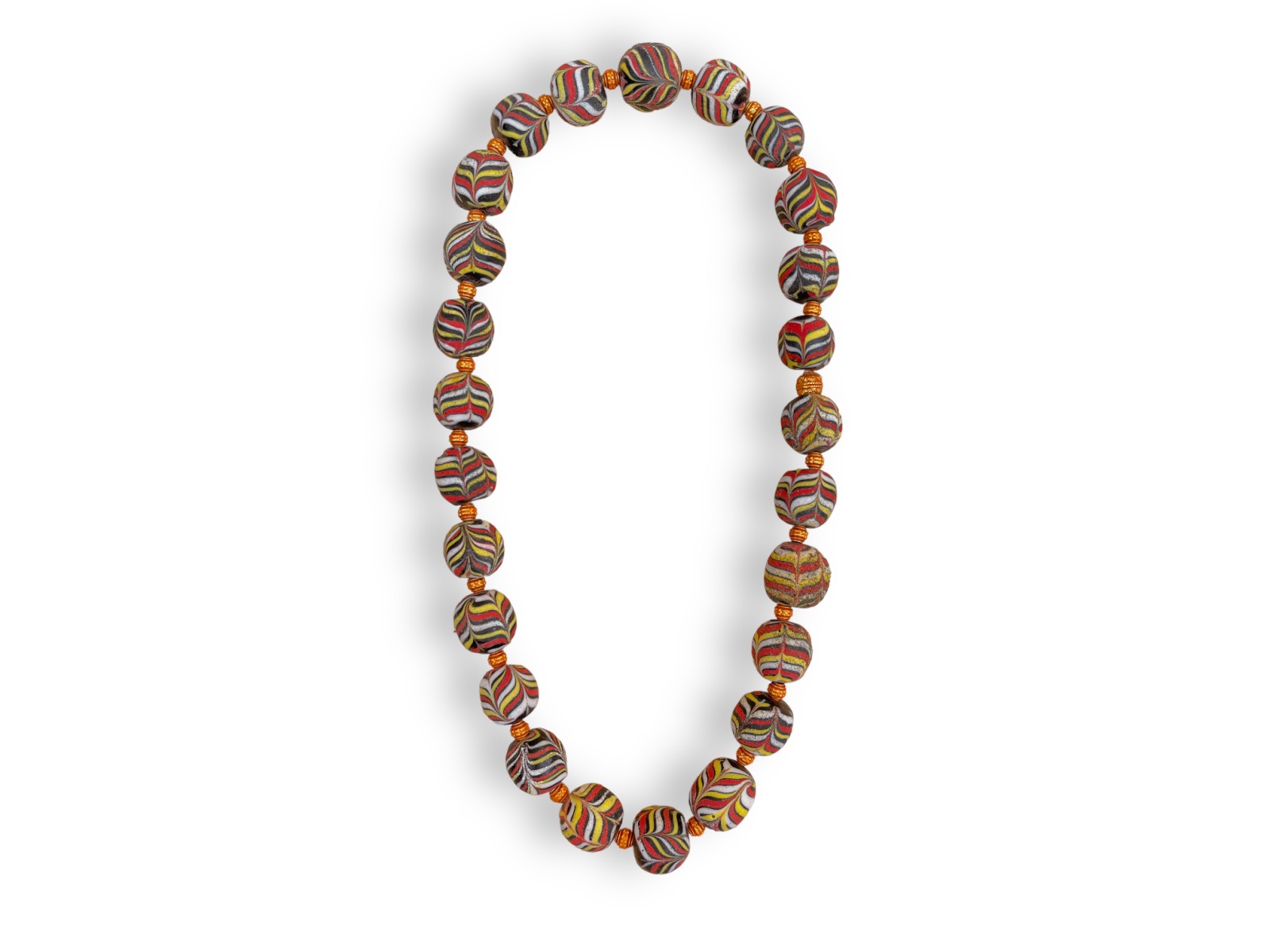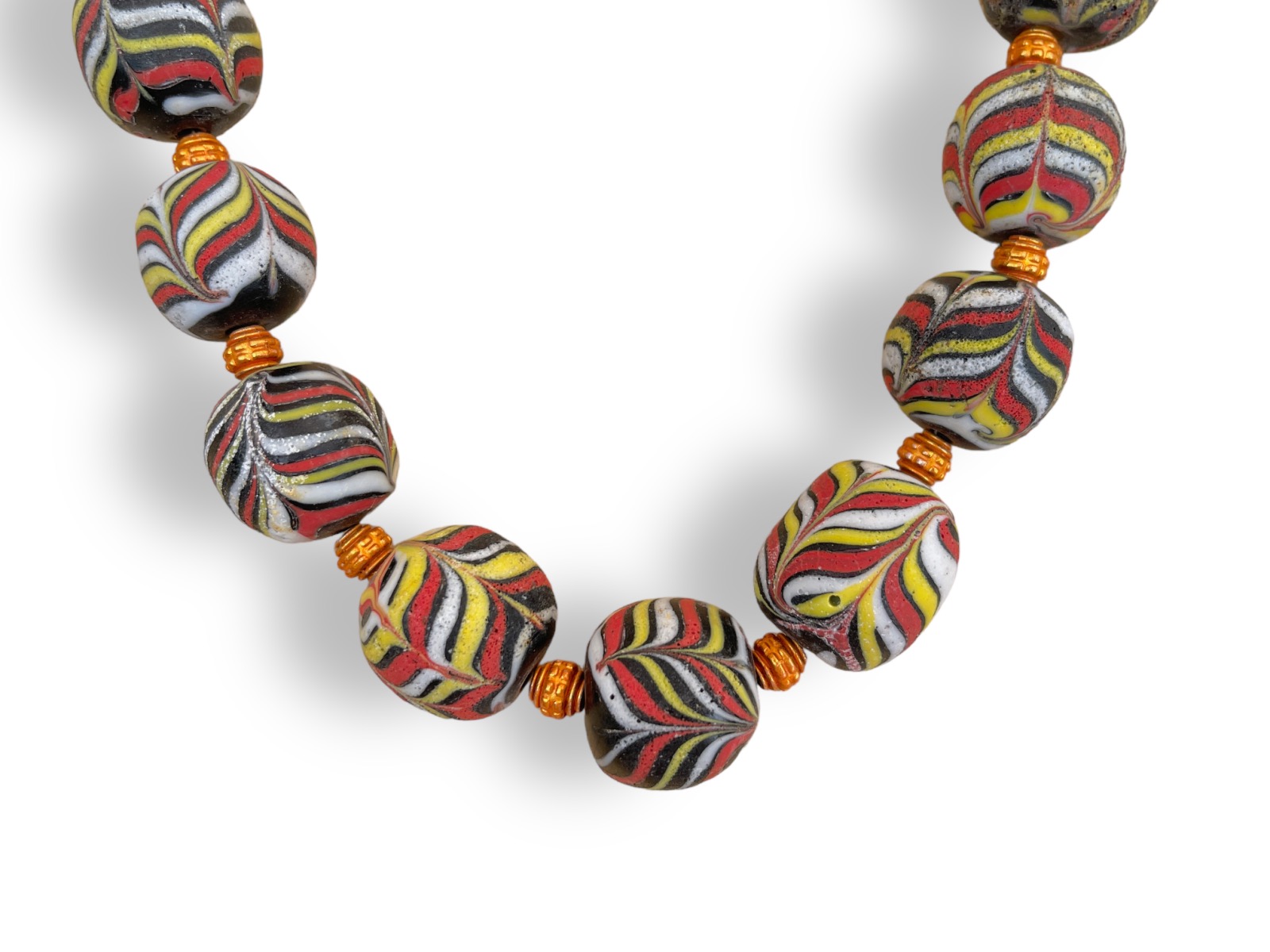 A long necklace of twenty-five large Javanese multicoloured stripe patterned Glass beads and twenty-five small Golden Metal round patterned spacer beads.