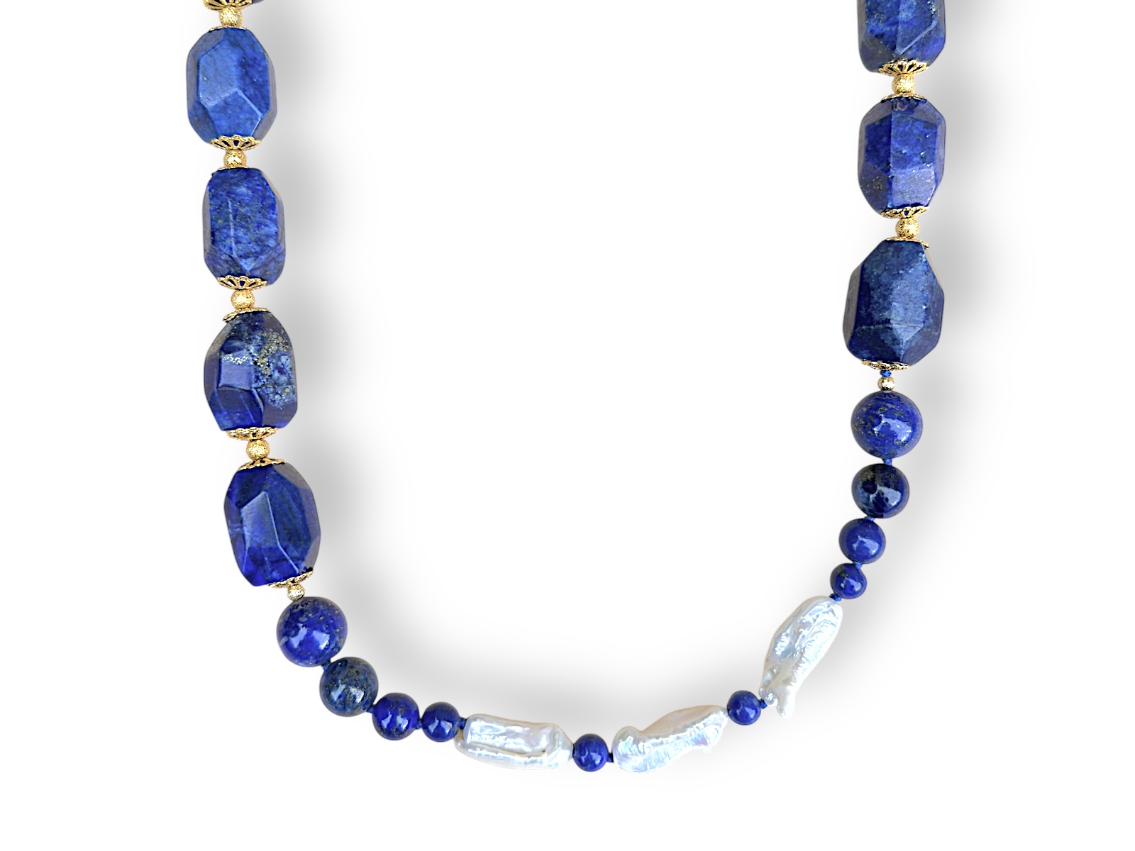 A long necklace of ten Lapis Lazuli large facetted oval beads, thirty-six Lapis Lazuli mixed sized small round beads, three long white baroque Freshwater Pearls, fourteen small Gold Plated round patterned spacer beads, and twenty Gold Plated small flat circular floral patterned panels. Each large Lapis Lazuli facetted oval bead is, approximately, 1.4 cm in diameter and 2 cm in length. Each Baroque Freshwater Pearl is 2 cm in length. The necklace is 30 cm in drop length, and is attached, at the top, by a Gold Plated oyster clasp and ring.