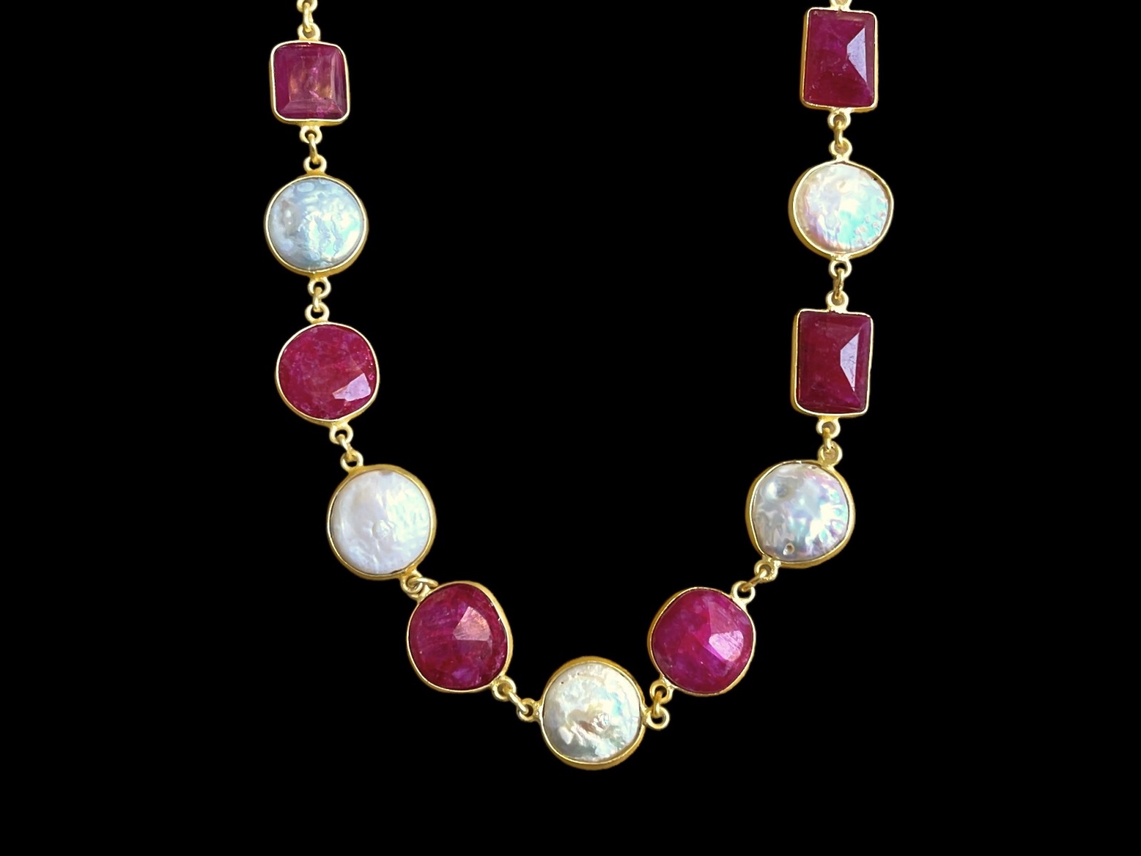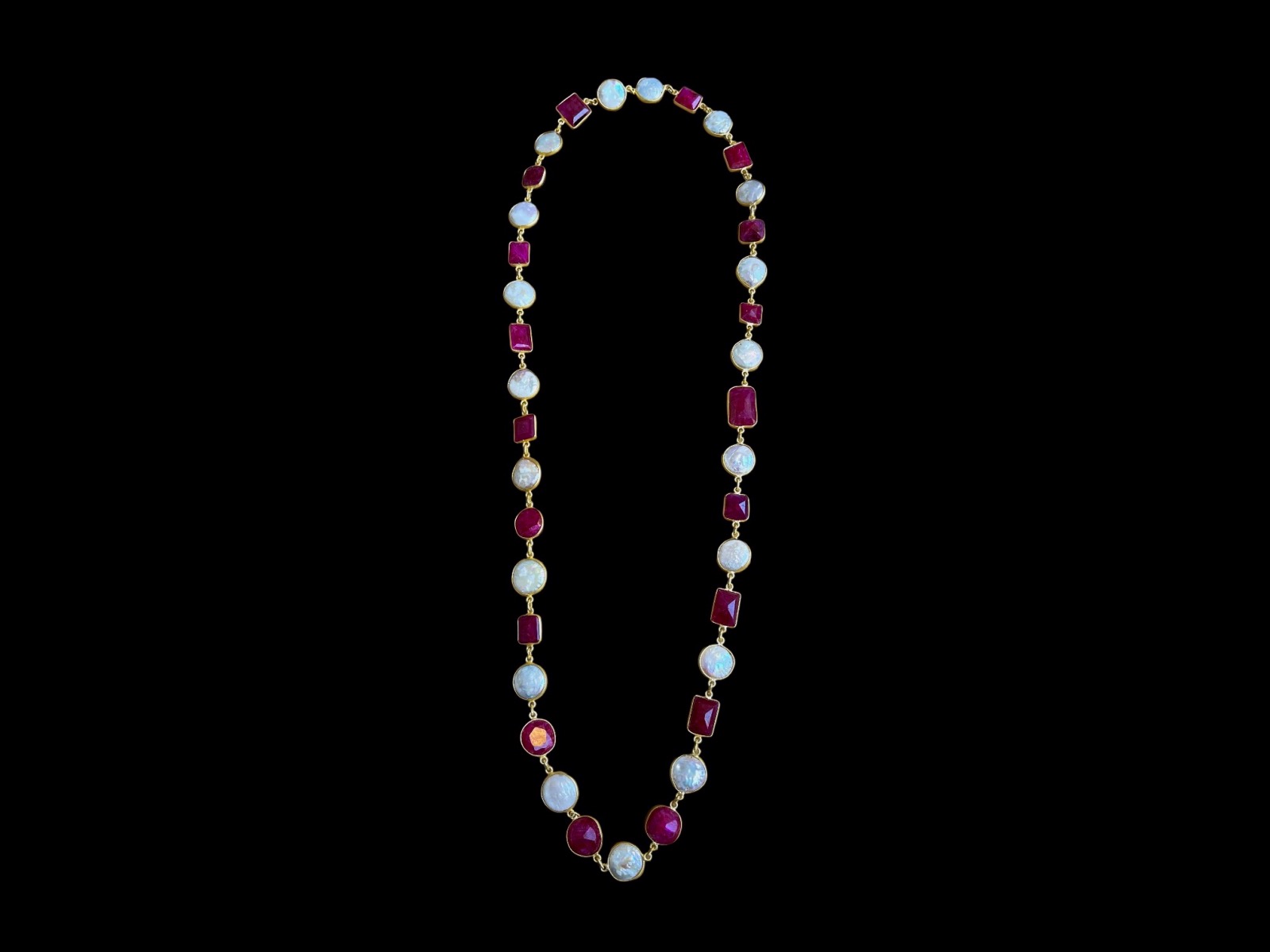 A long necklace of eight square, six rectangular, and five circular, domed facetted Ruby beads, and nineteen white freshwater coin Pearls, each set in a matt Gold Plated frame.