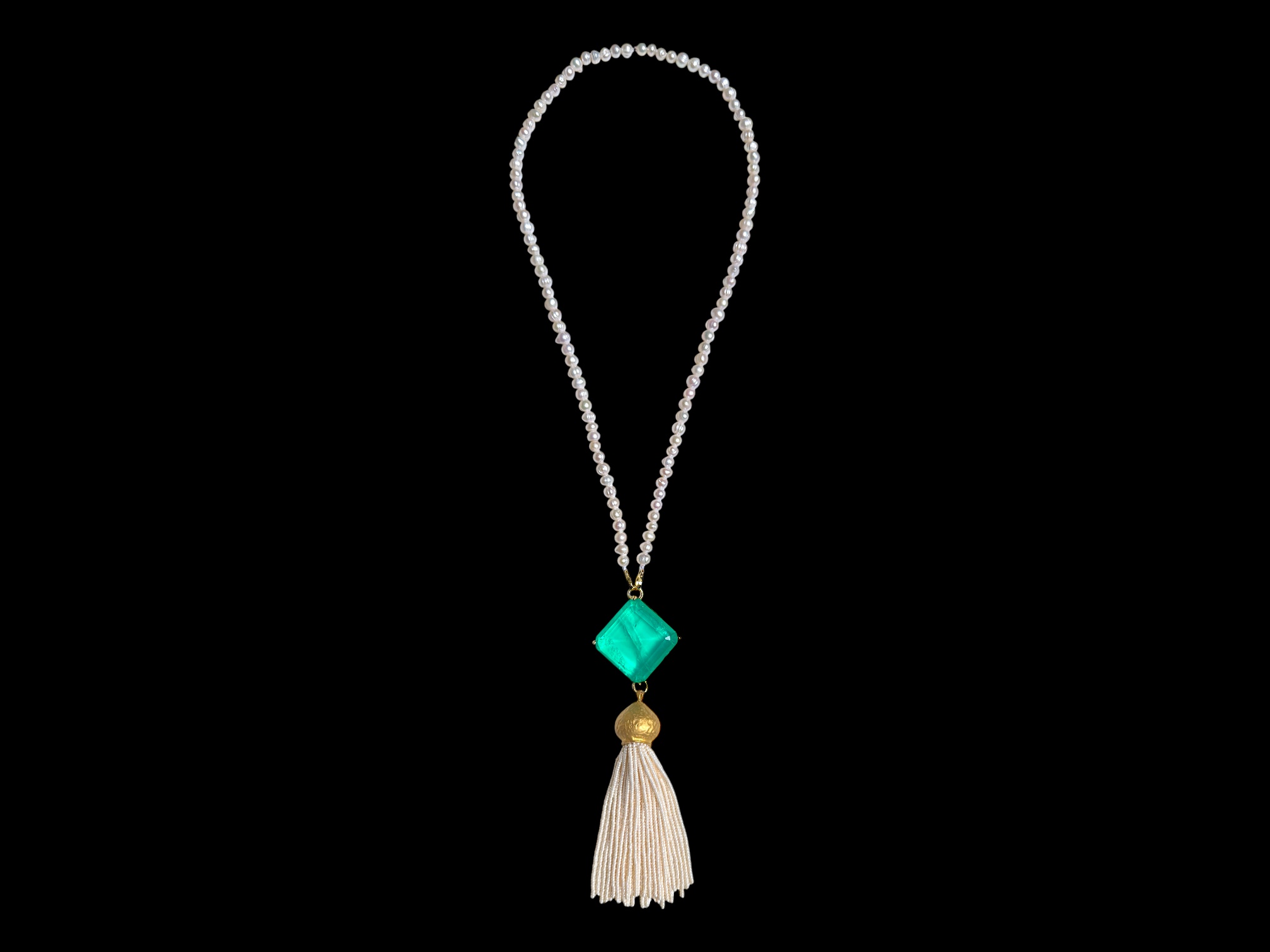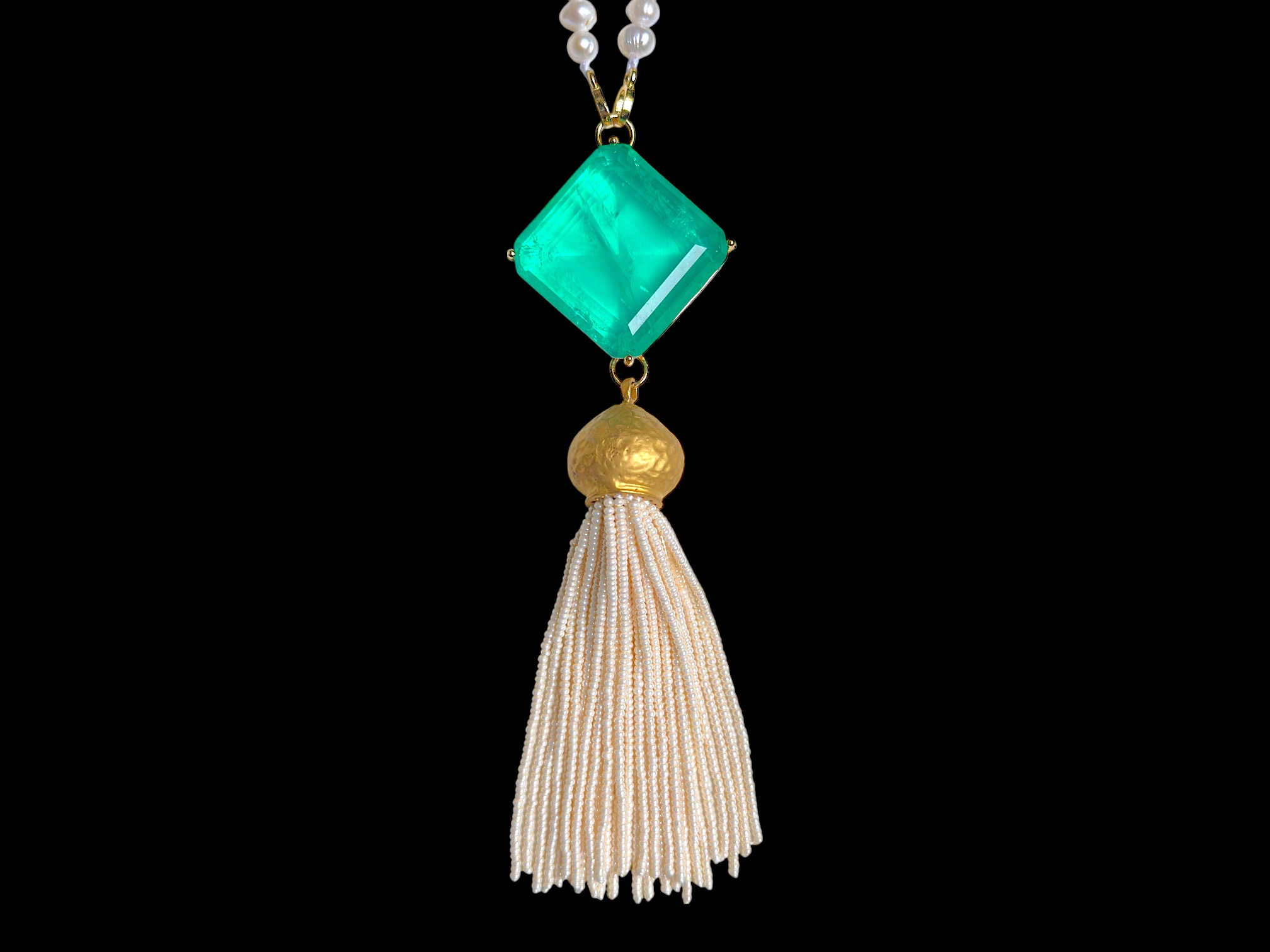 A long necklace of one hundred and eighty-six white Freshwater Pearls, with an emerald green electroplated Rock Crystal, diamond shaped, pendant, set in a Golden Metal, (Nickel free), diamond shaped panel of small rectangular bands, and , beneath the pendant, a fringe of thirty-two long strands of small white Glass ‘faux pearls, suspended from a matt Golden Metal domed circular top. The pendant is 3.5 cm in length and breadth, and 1 cm in depth. The fringe, including the Golden Metal top, is 2 cm in diameter and 11.5 cm in drop length. The total drop length of the necklace, pendant and fringe, is 52 cm.