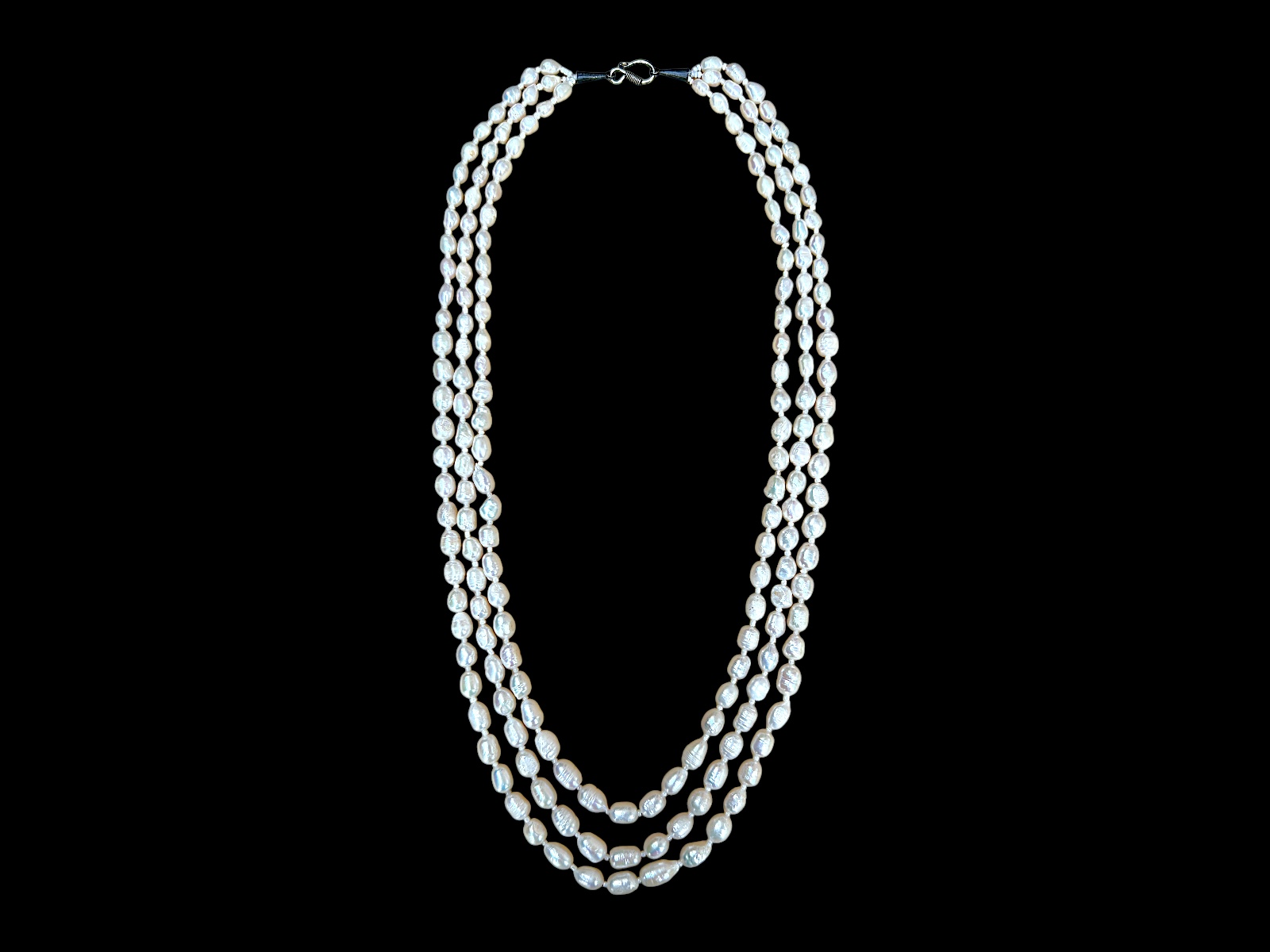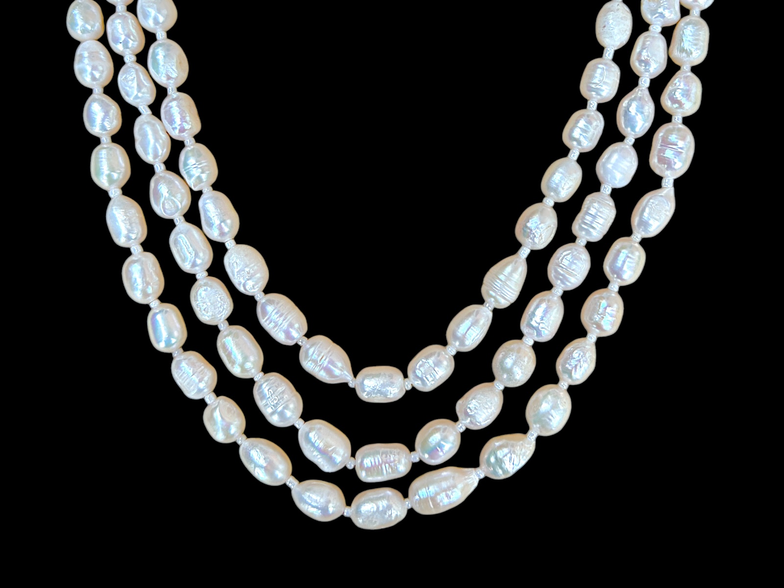 A long necklace with three graduated strands of white oval Freshwater Pearls, with very small white Glass spacer beads. Each oval Pearl is, approximately, 0.5 cm in diameter and 0.8 cm in length. The necklace is 42 cm in drop length, and is finished with a Silver Plated ‘S’ clasp and ring.