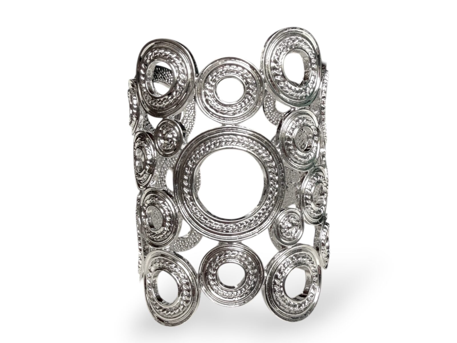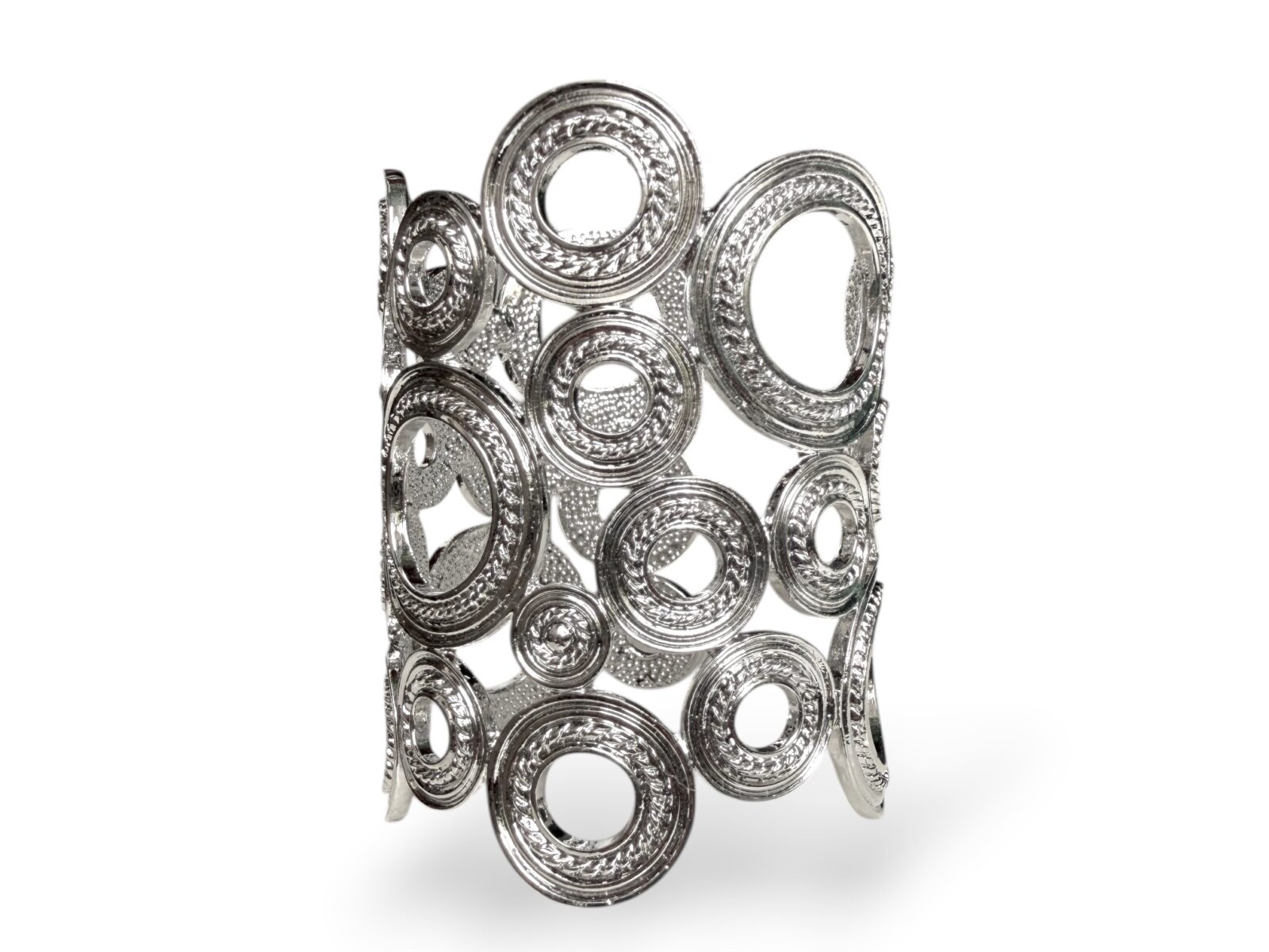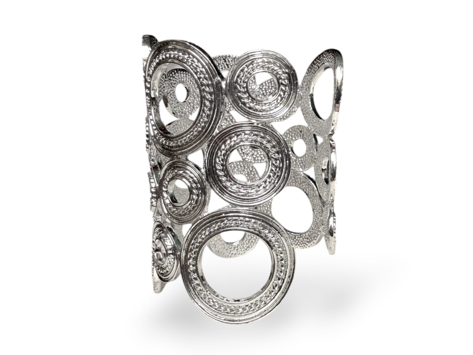 A long Silvered Metal, (Nickel free), open cuff, with a band of mixed sized patterned band rings. The cuff is 8.5 cm in length, and the inner diameter of the cuff is 6.5 cm.