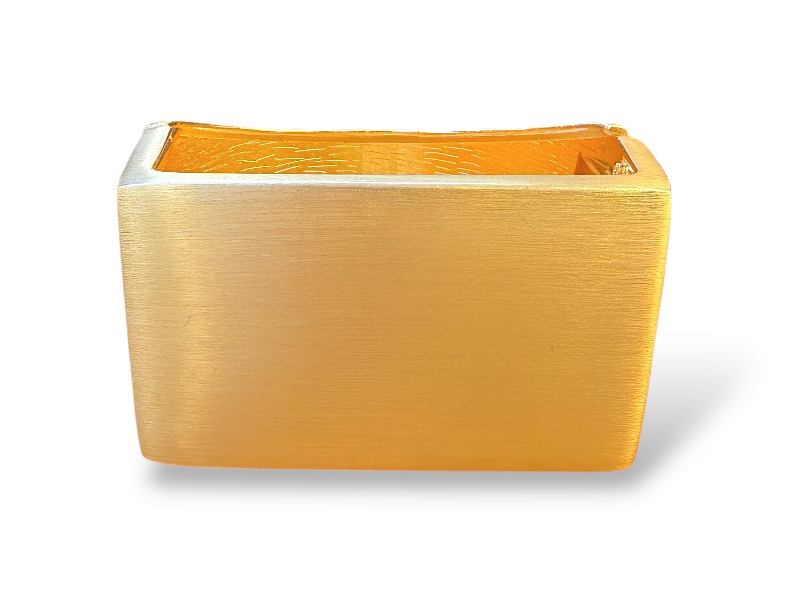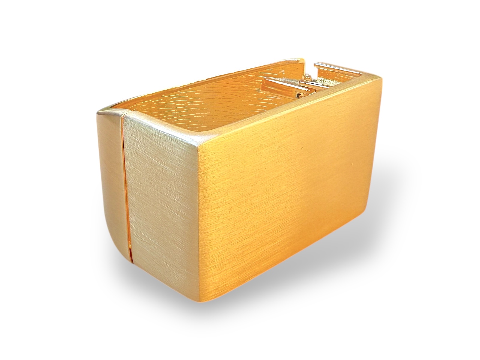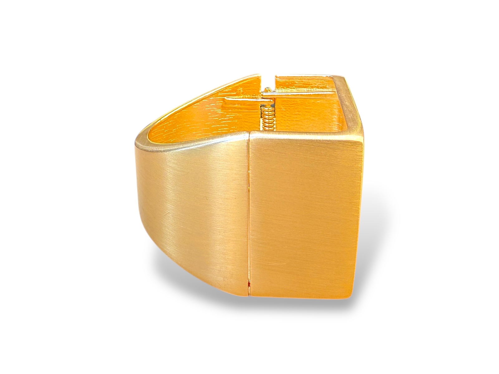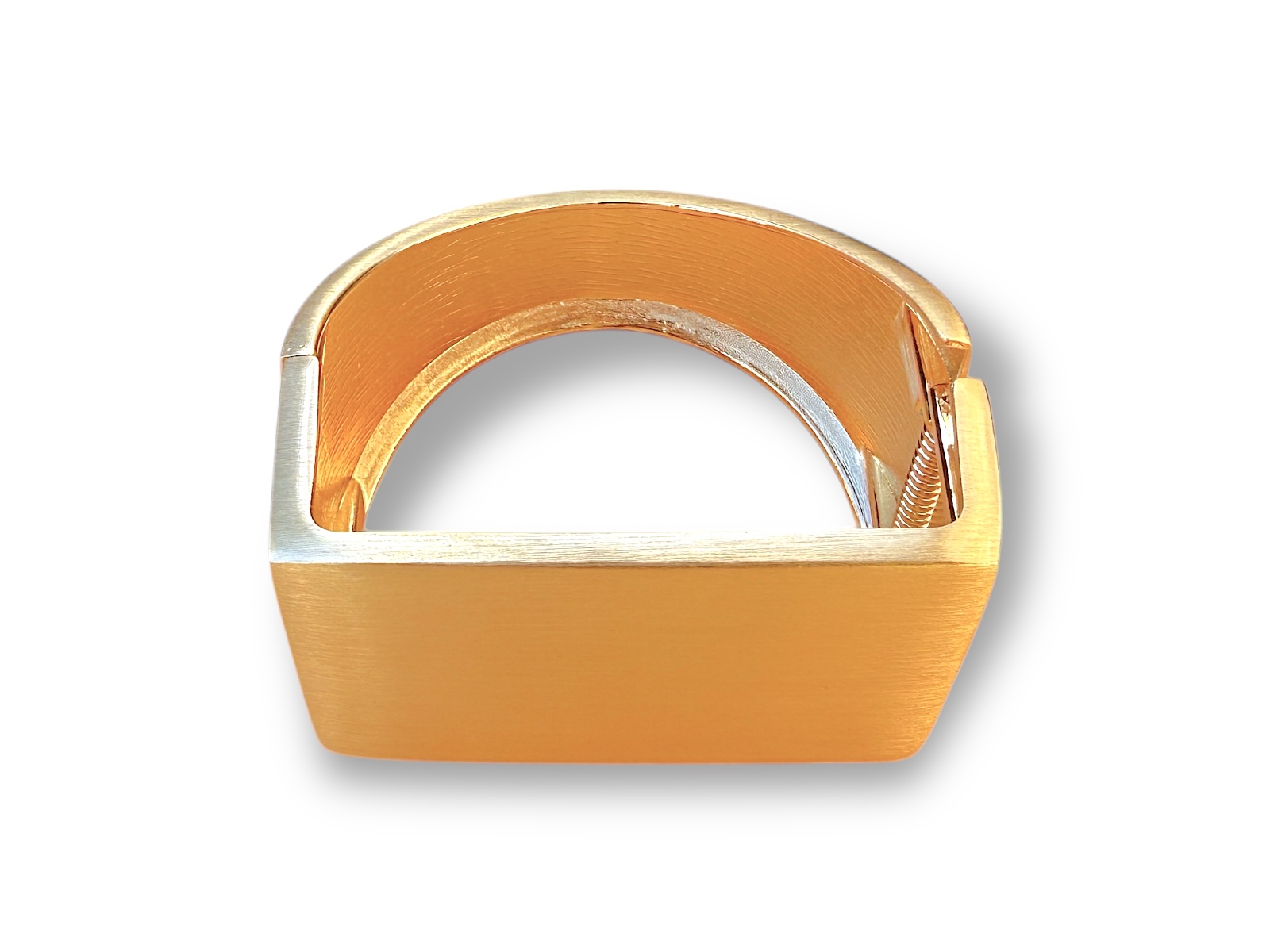 A matt Golden Metal, (Nickel free), hinged bangle, with a flat rectangular panel at the front, two rectangular panels at the sides, and a curved panel at the back of the bangle. The front panel is 4 cm in width and 6.5 cm in length. The two rectangular side panels are 4 cm in width and 2 cm in length, and the curved back panel is 4 cm in width, with an inner diameter of 5.8 cm.