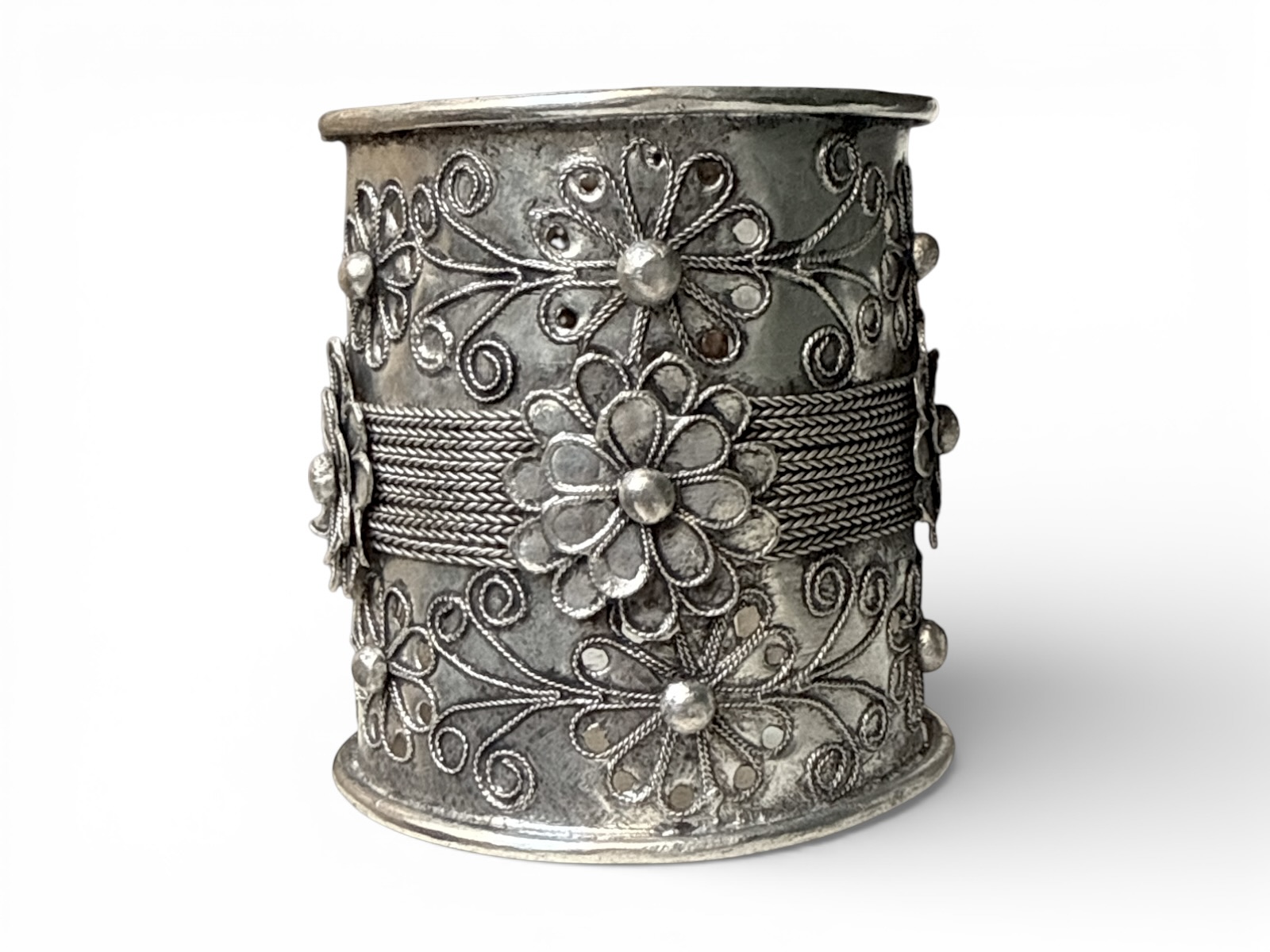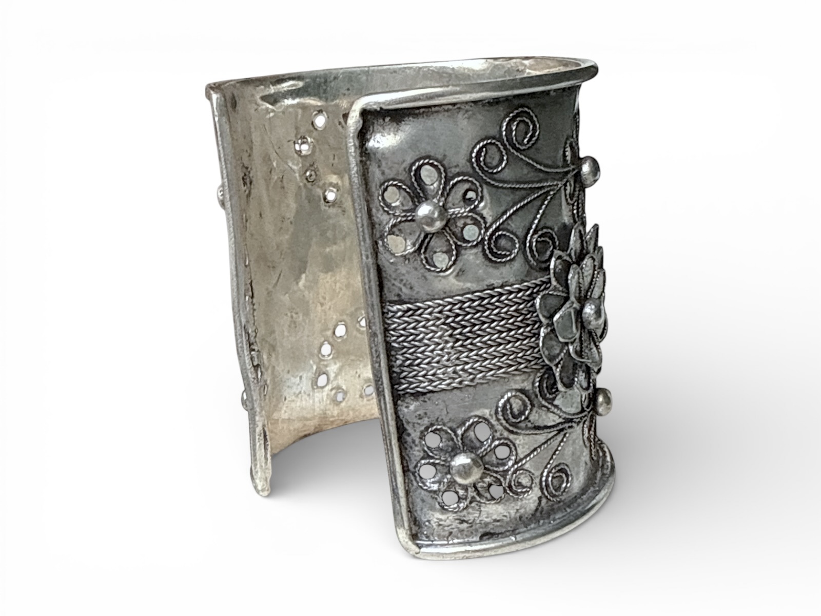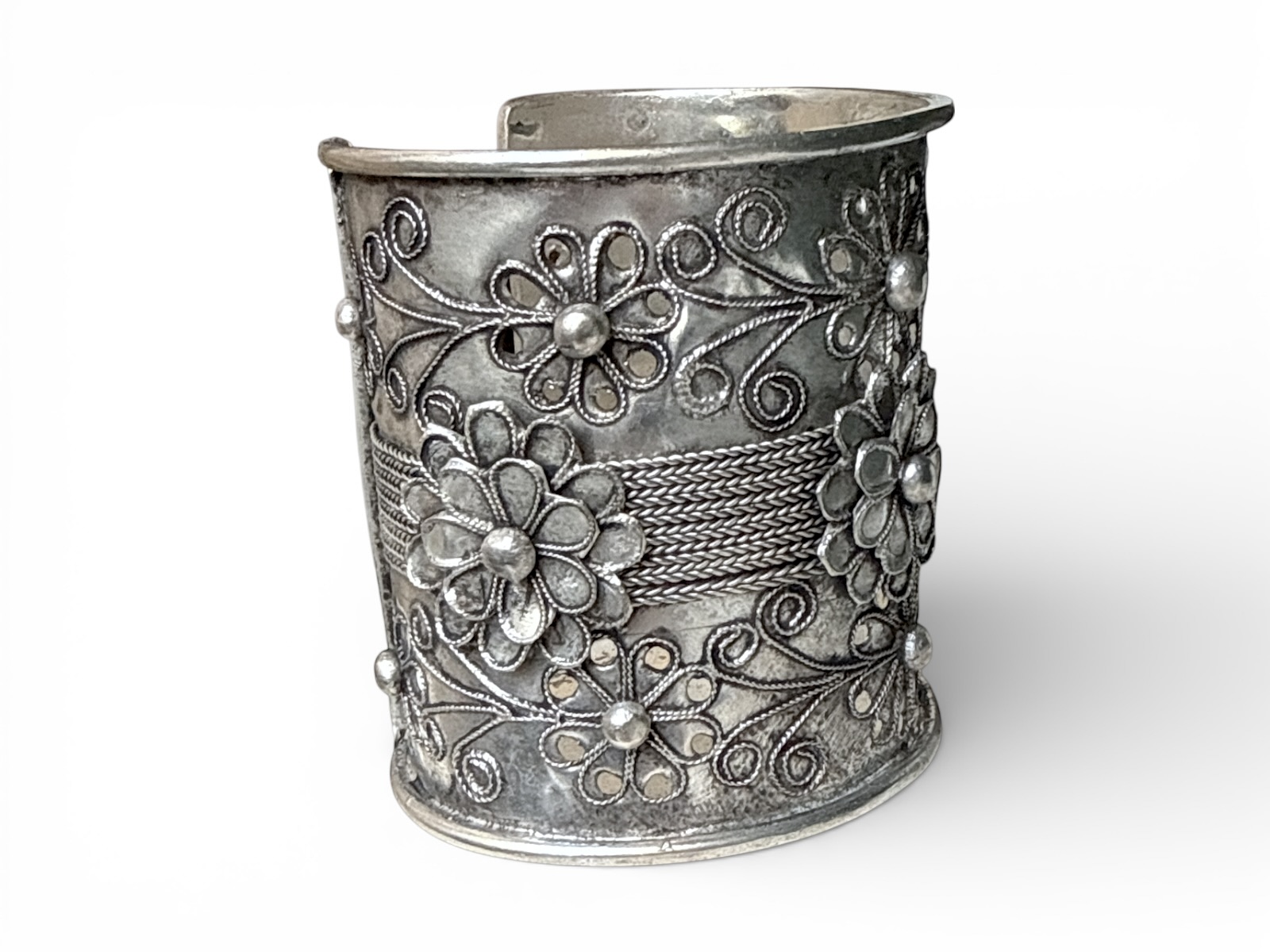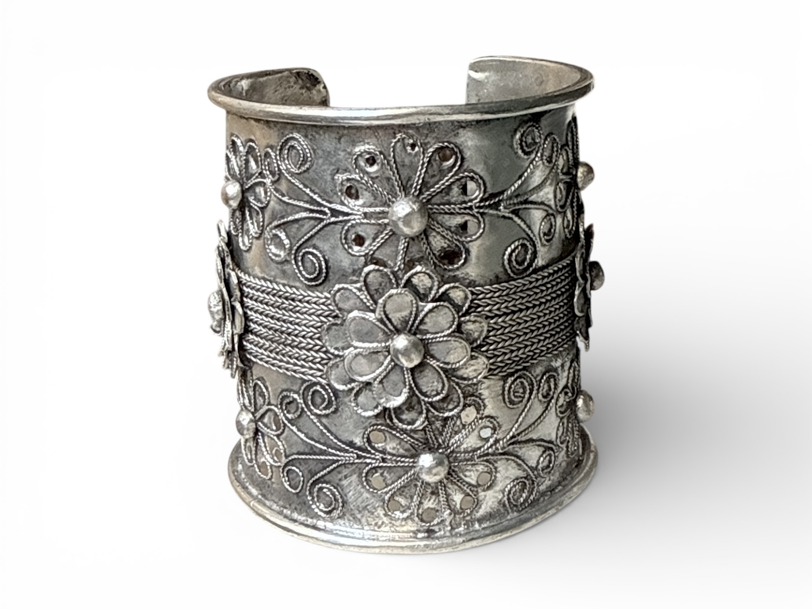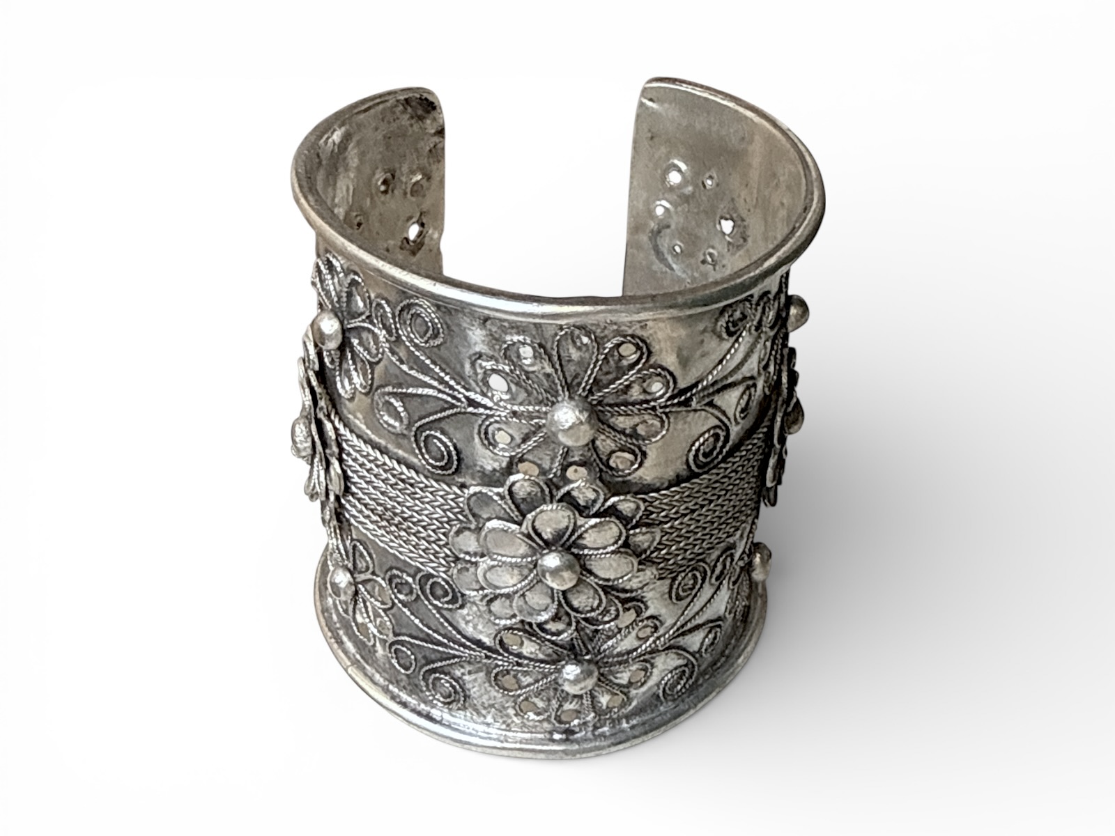 A Miao Silver Plated open cuff, patterned with flowers and leaves. China. The cuff is 7.5 cm in width, and the inner diameter of cuff is 7.2 cm, and is adjustable in size.