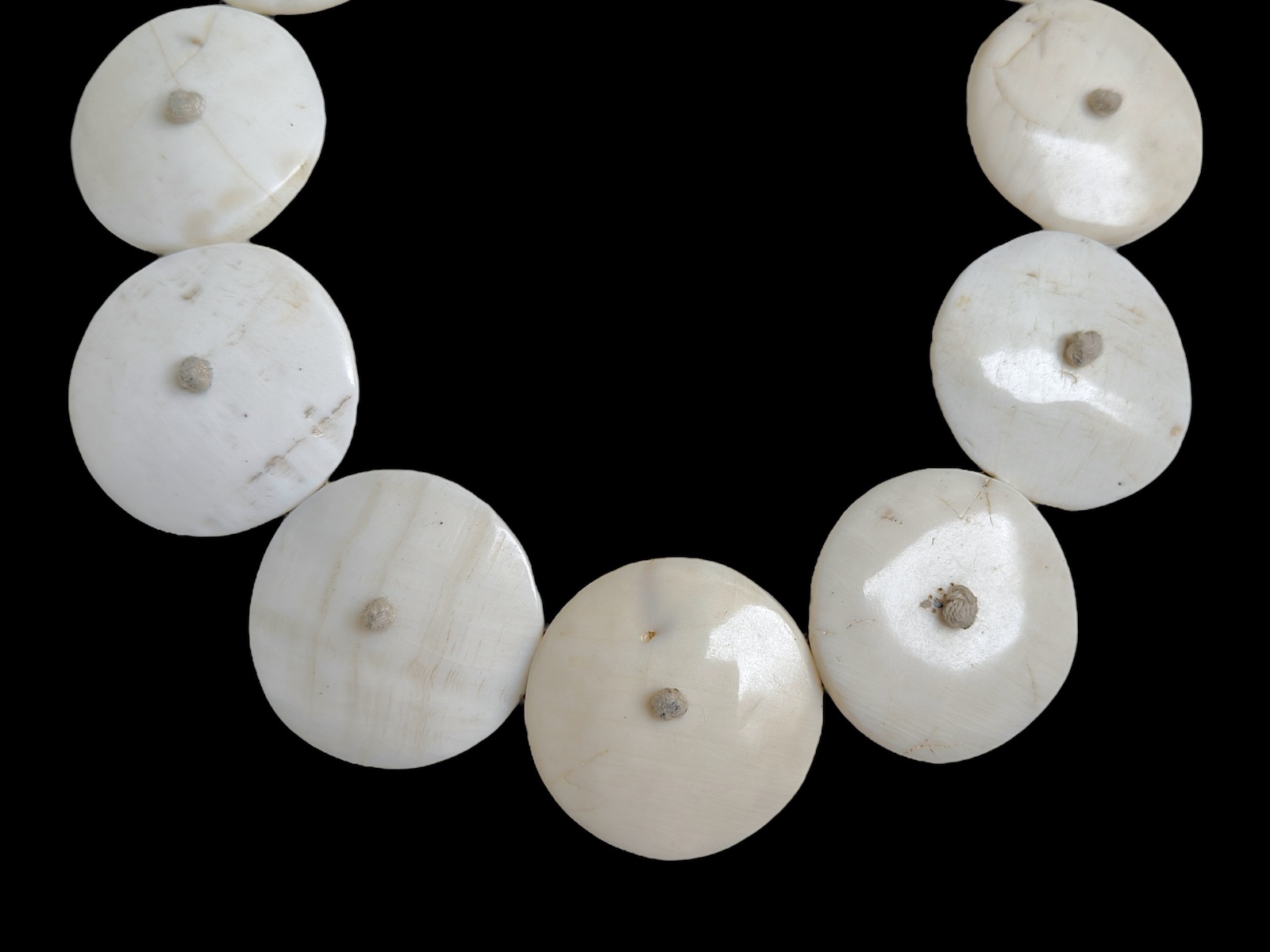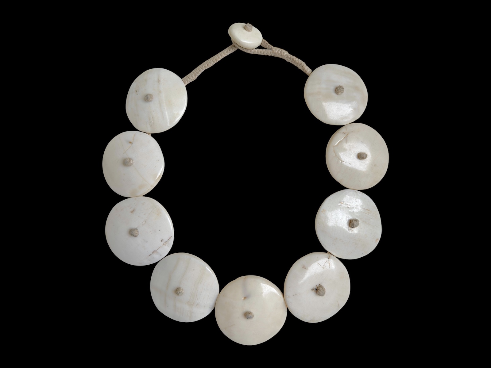 A Naga Vintage Necklace Of Nine Large White Circular Conch Shells On A Beige Braided Cotton Band.