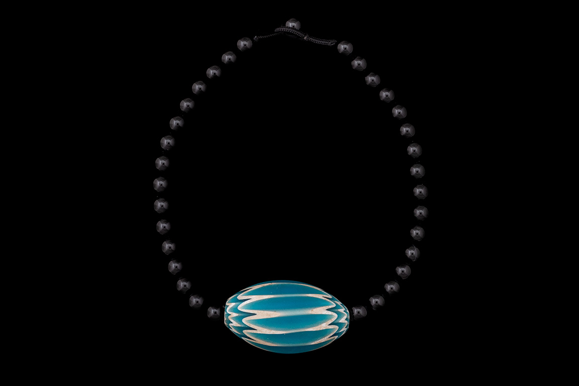 A necklace of thirty-two Black Onyx round beads with a large turquoise and white Glass chevron patterned oval bead in the centre. The Black Onyx beads are 0.3 inches in diameter. The chevron Glass bead is 1.2 inches in diameter and 2.1 inches in length. The necklace is 17 inches in length, and is finished with a black cotton macrame loop, and a Black Onyx round toggle.