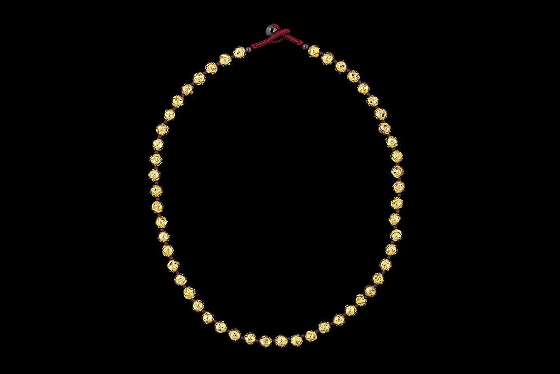 A Necklace Of Fifty Gold Electroplated Pitted Lava Round ‘Moon’ Beads With Glass Round Spacers