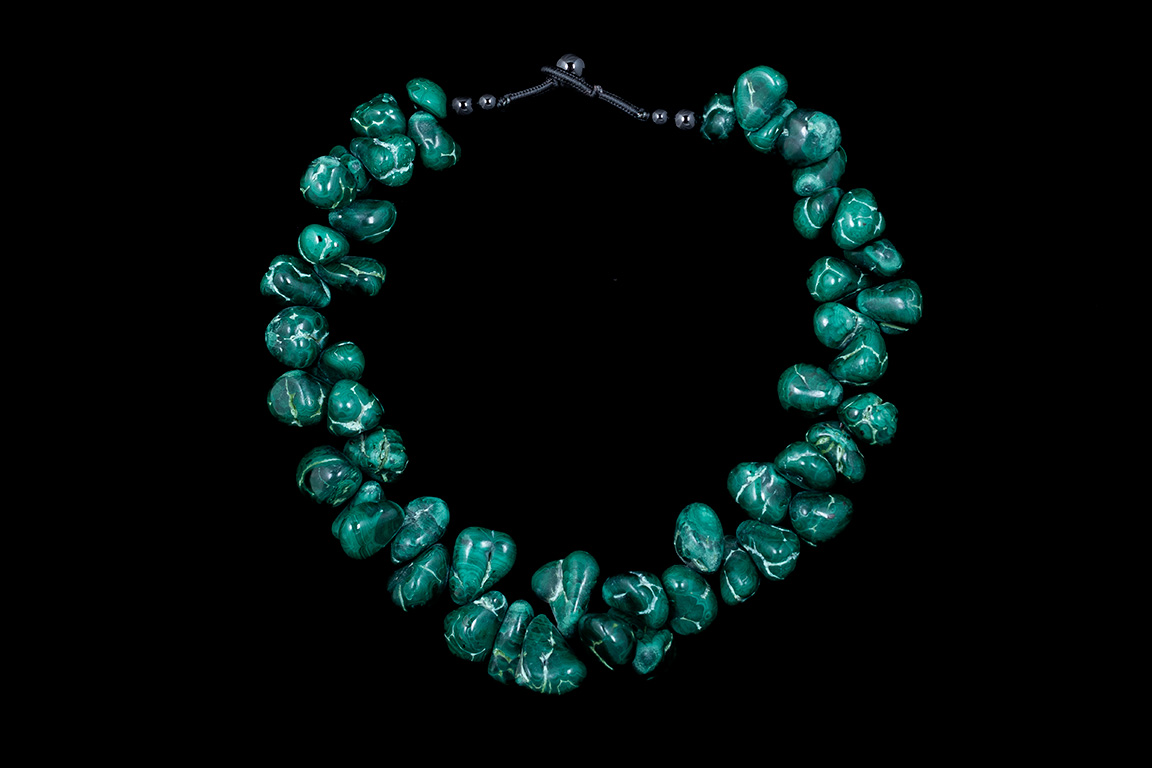 A necklace of fifty-three Malachite graduated bunched nugget drops. Democratic Republic of Congo. At each end of the necklace are two Black Onyx round beads. The largest Malachite nugget is 0.5 inches in width, 0.4 inches in depth, and 0.7 inches in drop length. The smallest nugget is 0.3 inches in width and depth, and 0.5 inches in drop length. The necklace is 18 inches in length, and is finished with a black cotton macrame loop, and a Black Onyx round toggle.