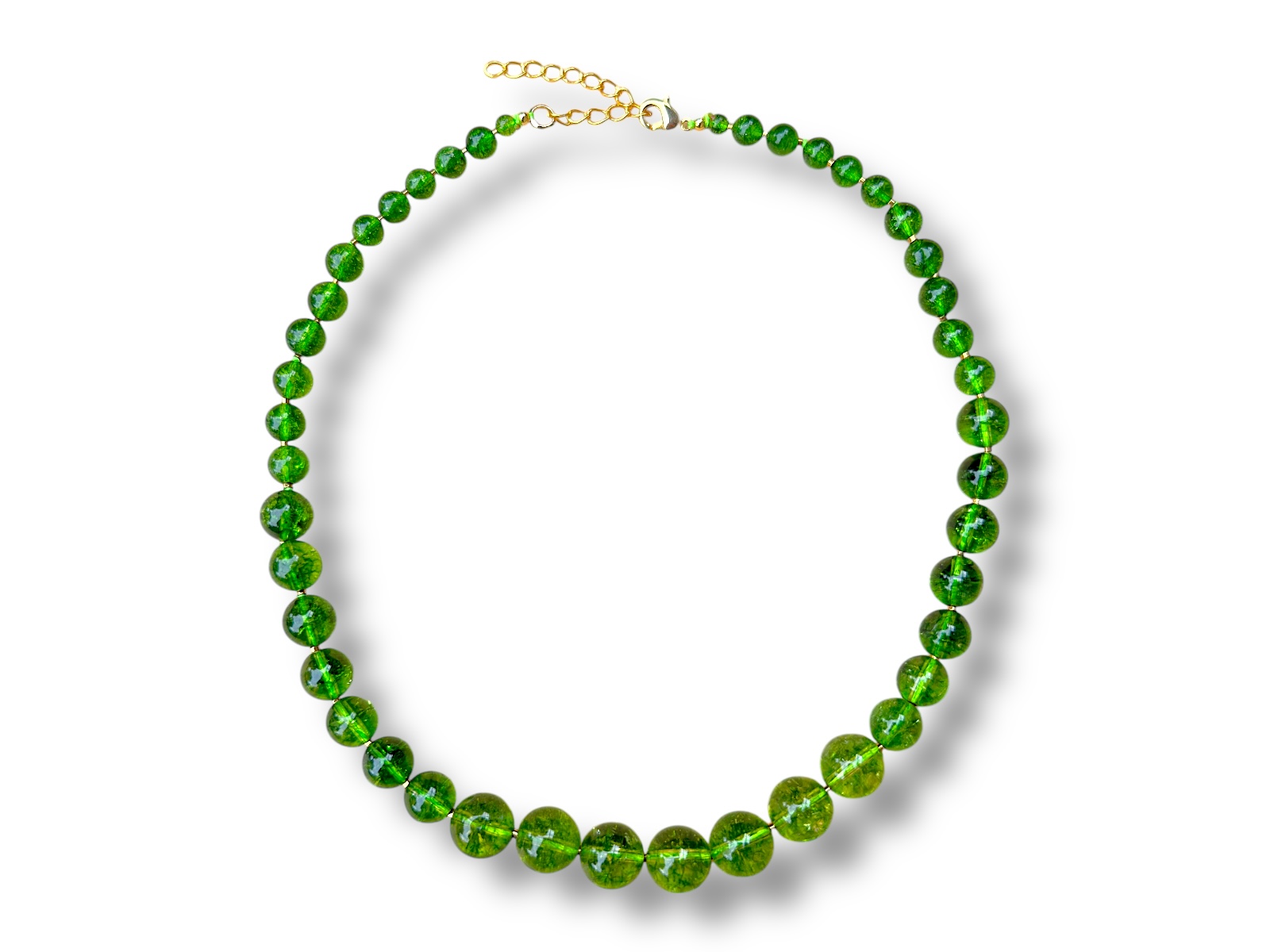 A necklace of forty-four green electroplated Rock Crystal graduated round beads, and small Gold Plated barrel beads. The largest bead is 1 cm in diameter and the smallest bead is 0.4 cm in diameter. The length of the necklace is adjustable from 44 cm in length to 49 cm in length, and the necklace is finished with a Gold Plated oyster clasp, and a 5 cm chain, (for adjustable sizing).