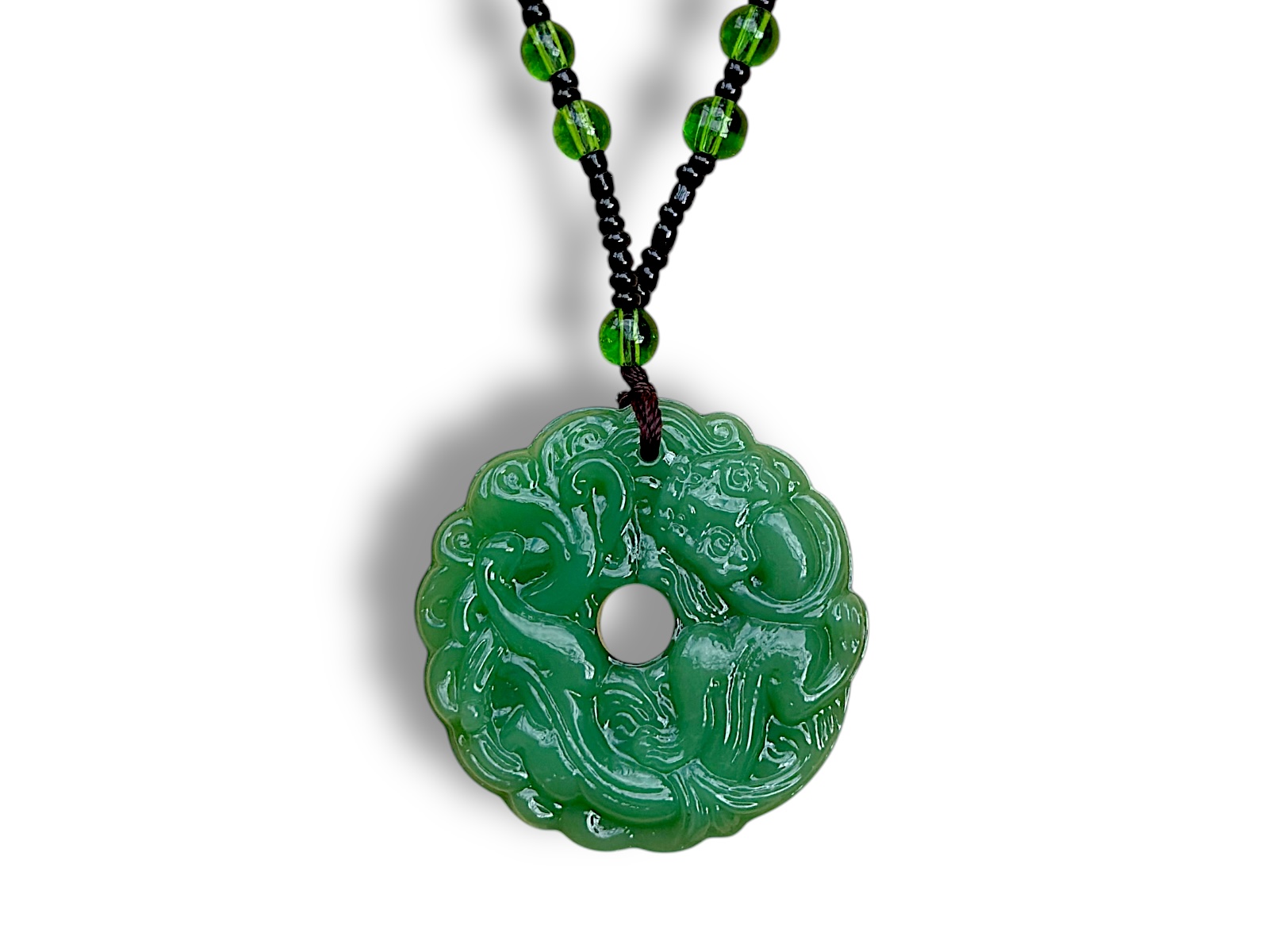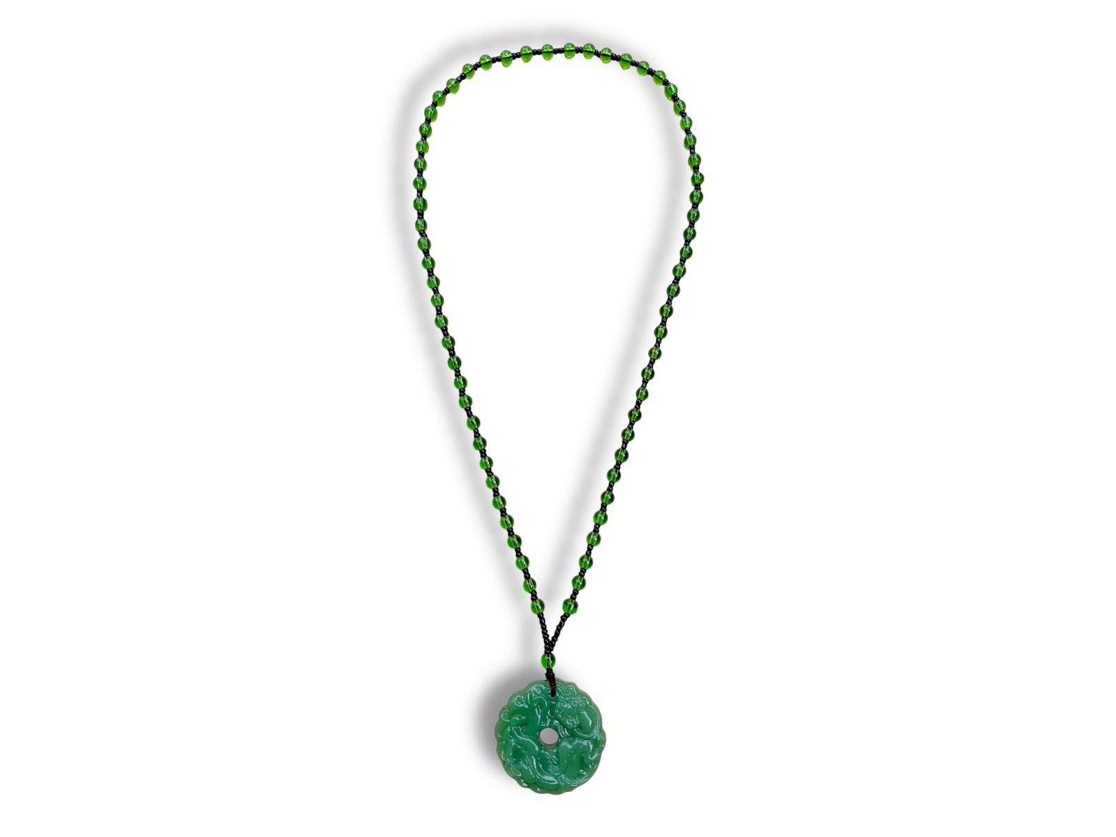 A long necklace of green Glass round beads and very small black Glass round spacer beads. Suspended from the base of the necklace, is a green Jadeite patterned circular donut pendant. The pendant is 4.5 cm in diameter and 0.5 cm in depth. The necklace and pendant have a total drop length of 37 cm.