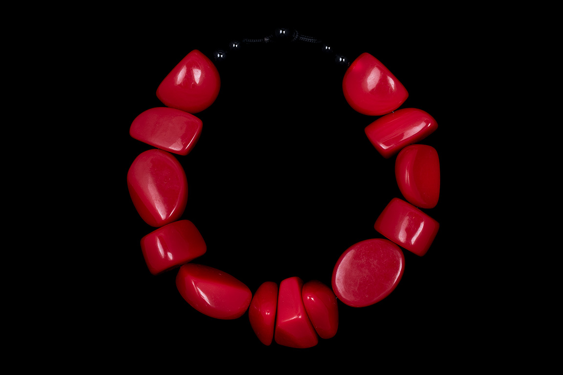 A necklace of large mixed shaped red Resin beads. At each end of the necklace is a row of Black Onyx round beads. The beads are oval, domed triangular, and thick smooth facetted tubular in shape. The largest beads are 1.2 inches in width, 0.5 inches in depth, and 1.4 inches in length. The smallest beads are 1.2 inches in width and length, and 0.5 inches in depth. The necklace is 20 inches in length, and is finished with a black cotton macrame loop, and a Black Onyx round toggle.